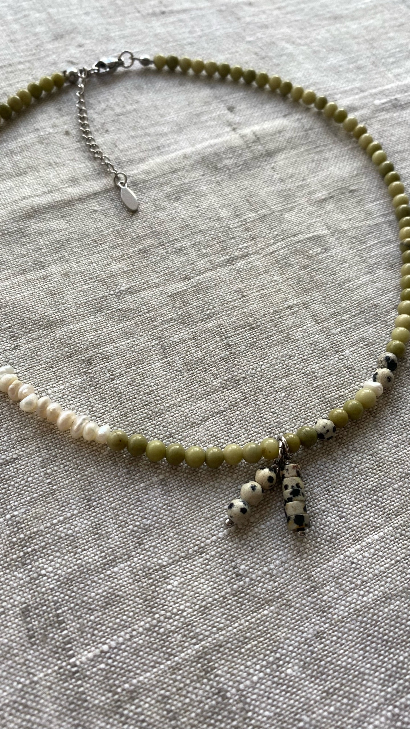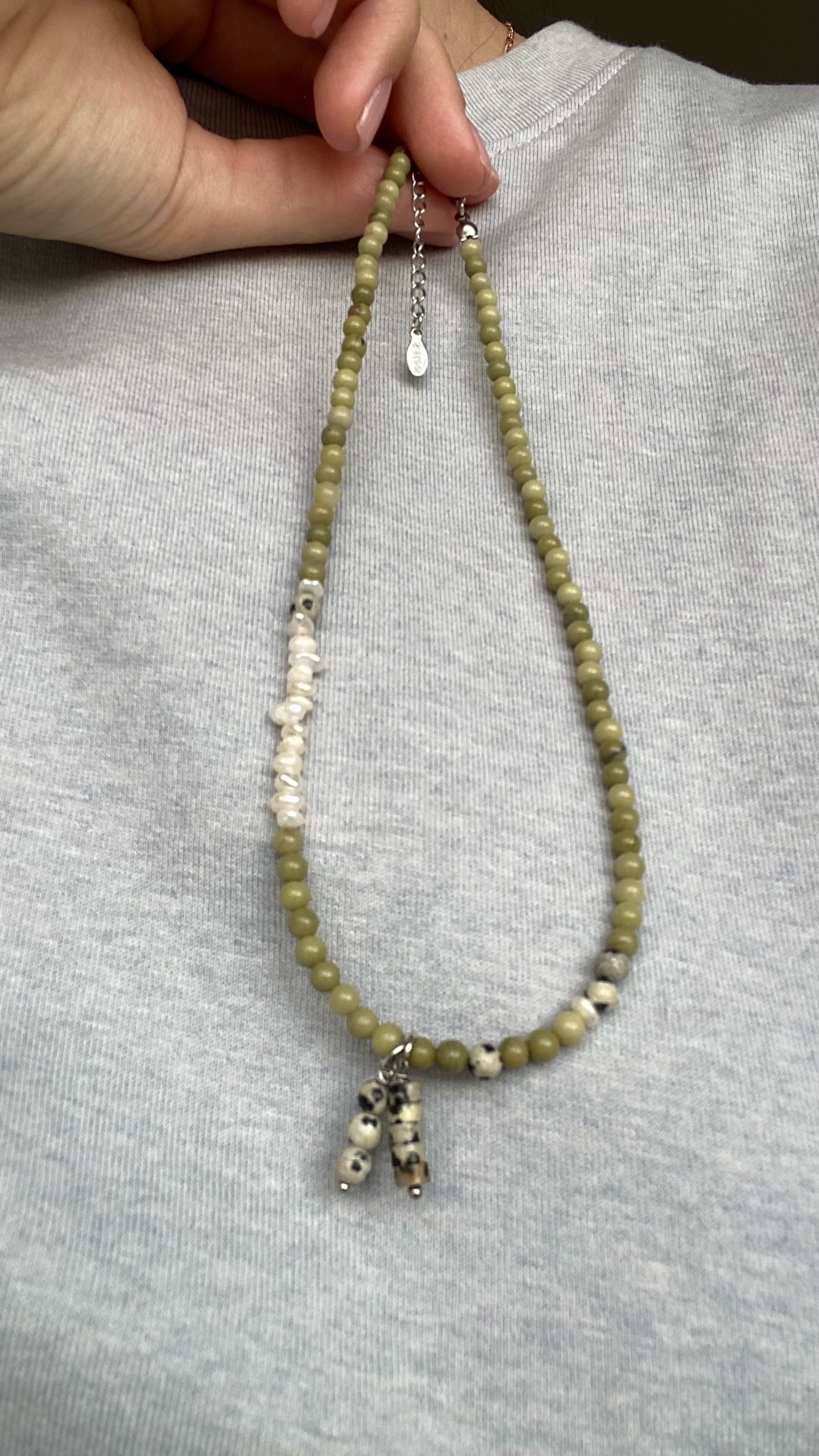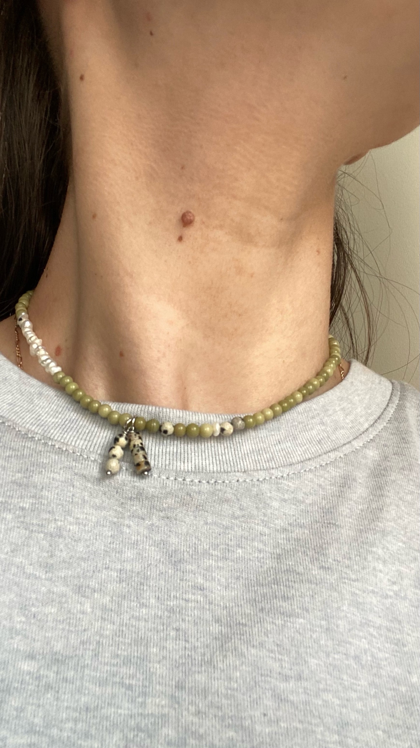 Ассиметричны чокер из яшм матча, долматин и жемчуга.