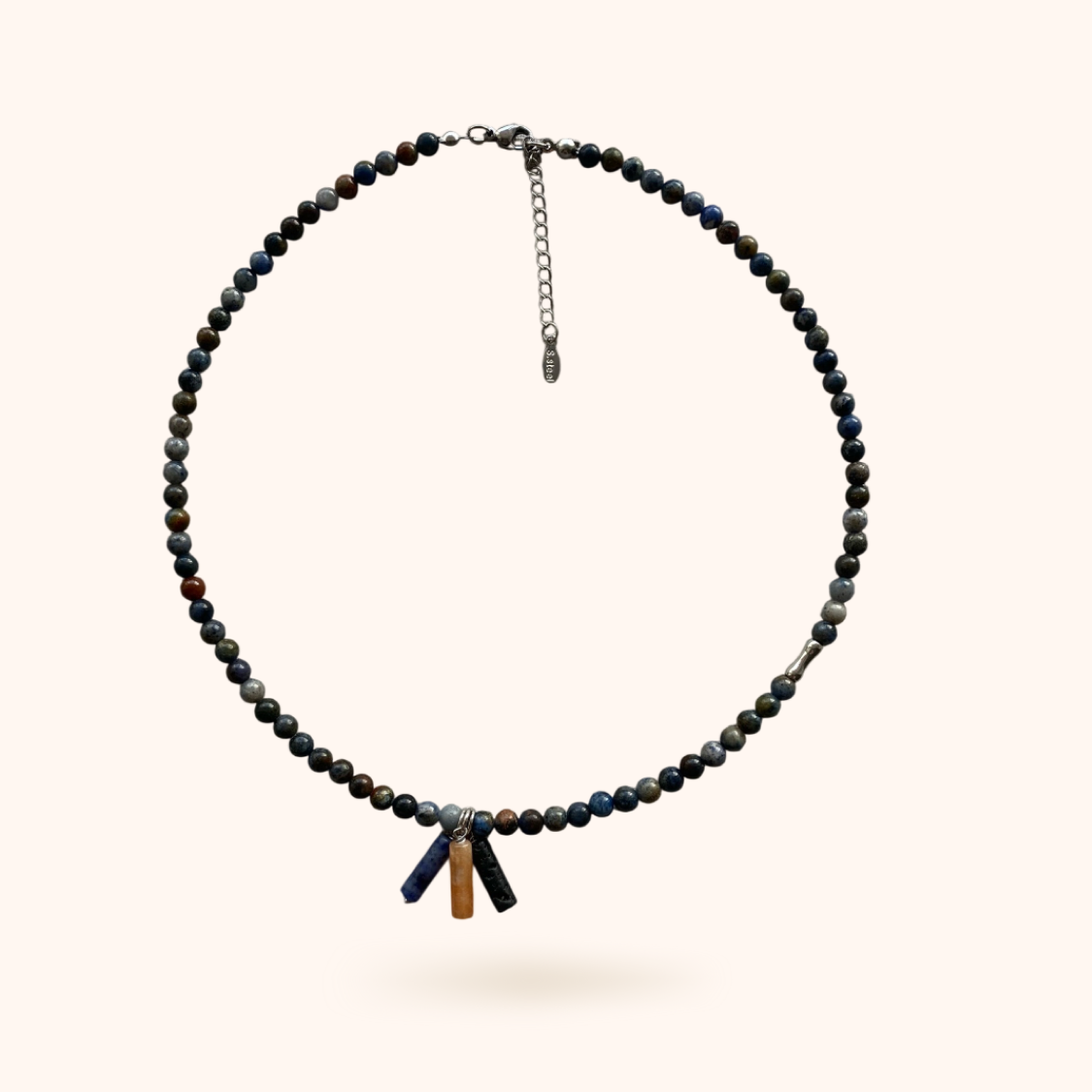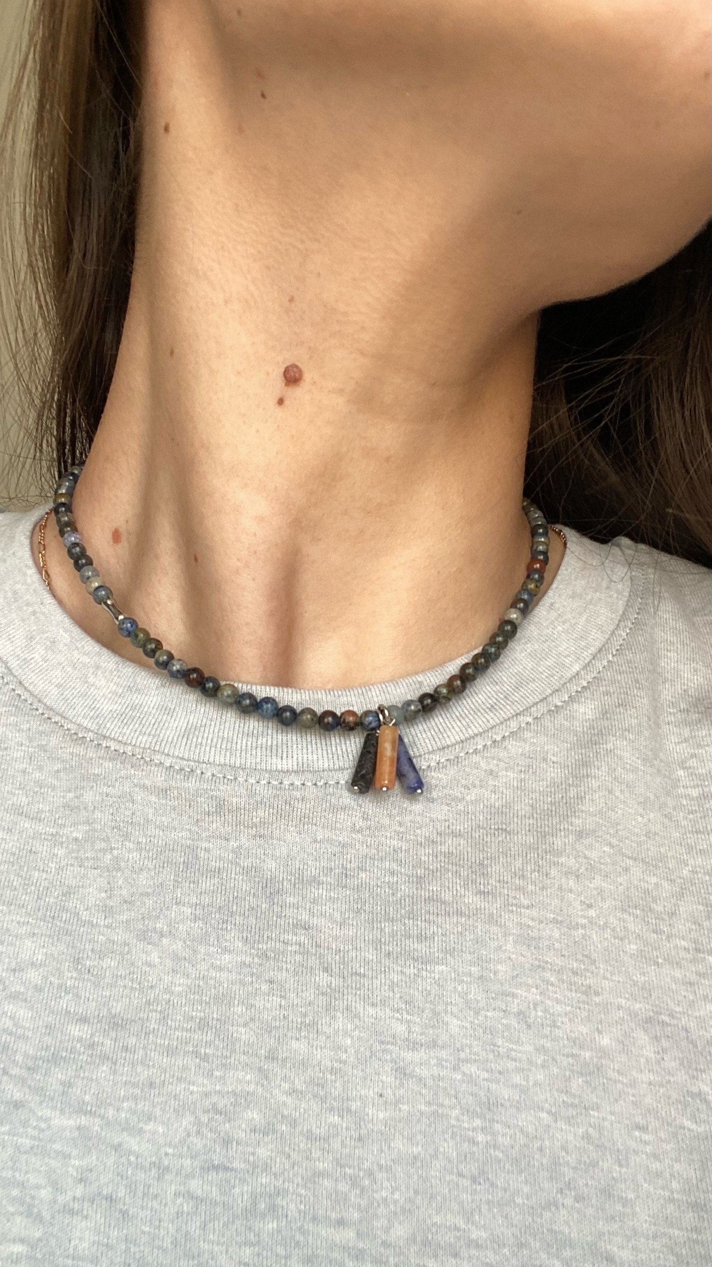 Чокер из дюмортьерита с разделителем, подвески из лавы, лазурита и нефрита.