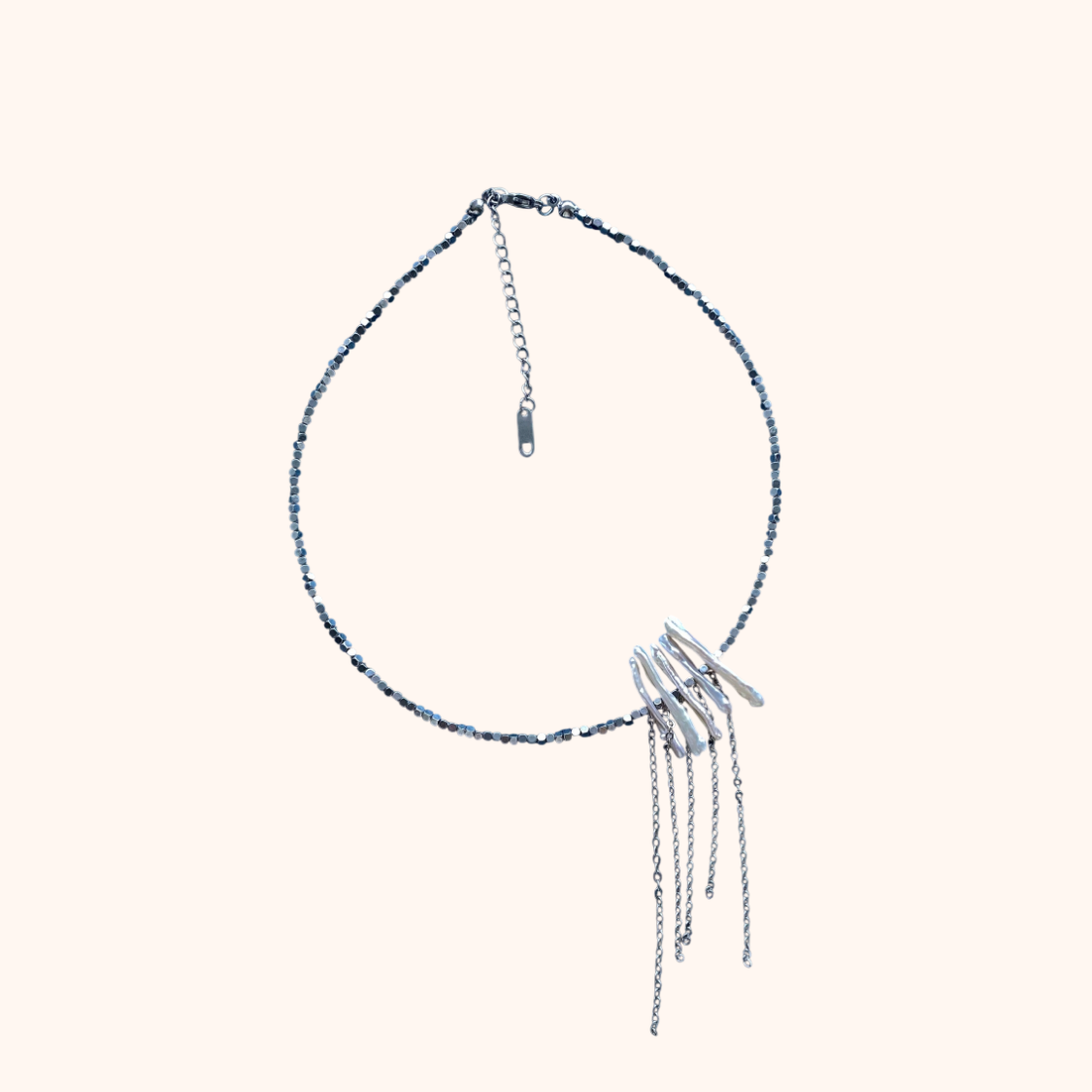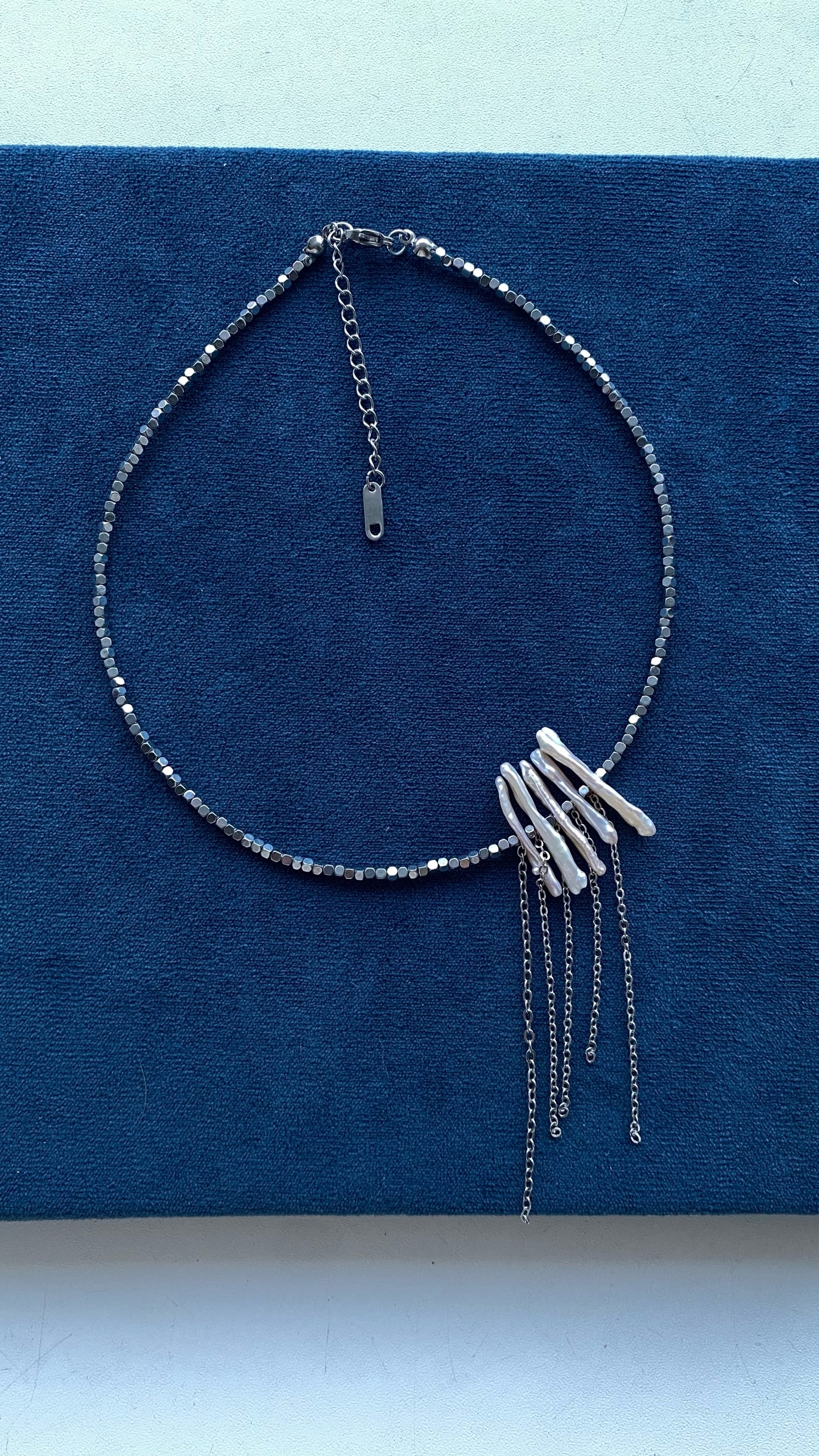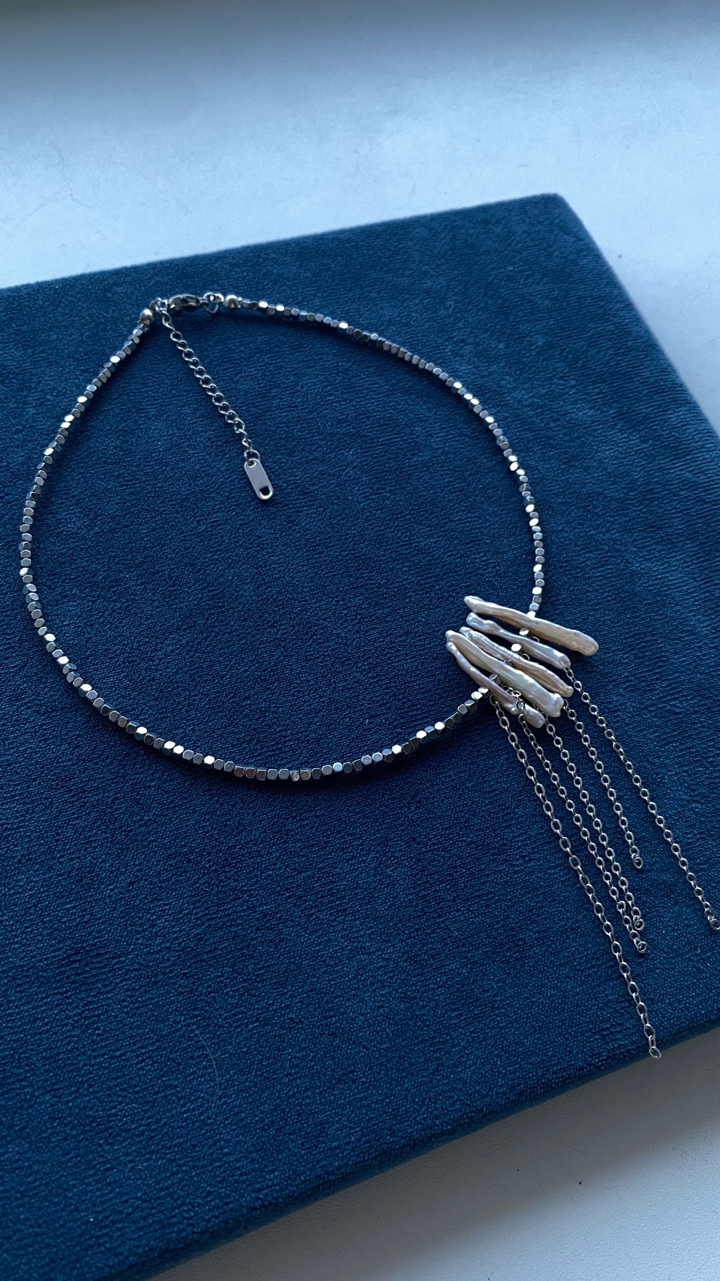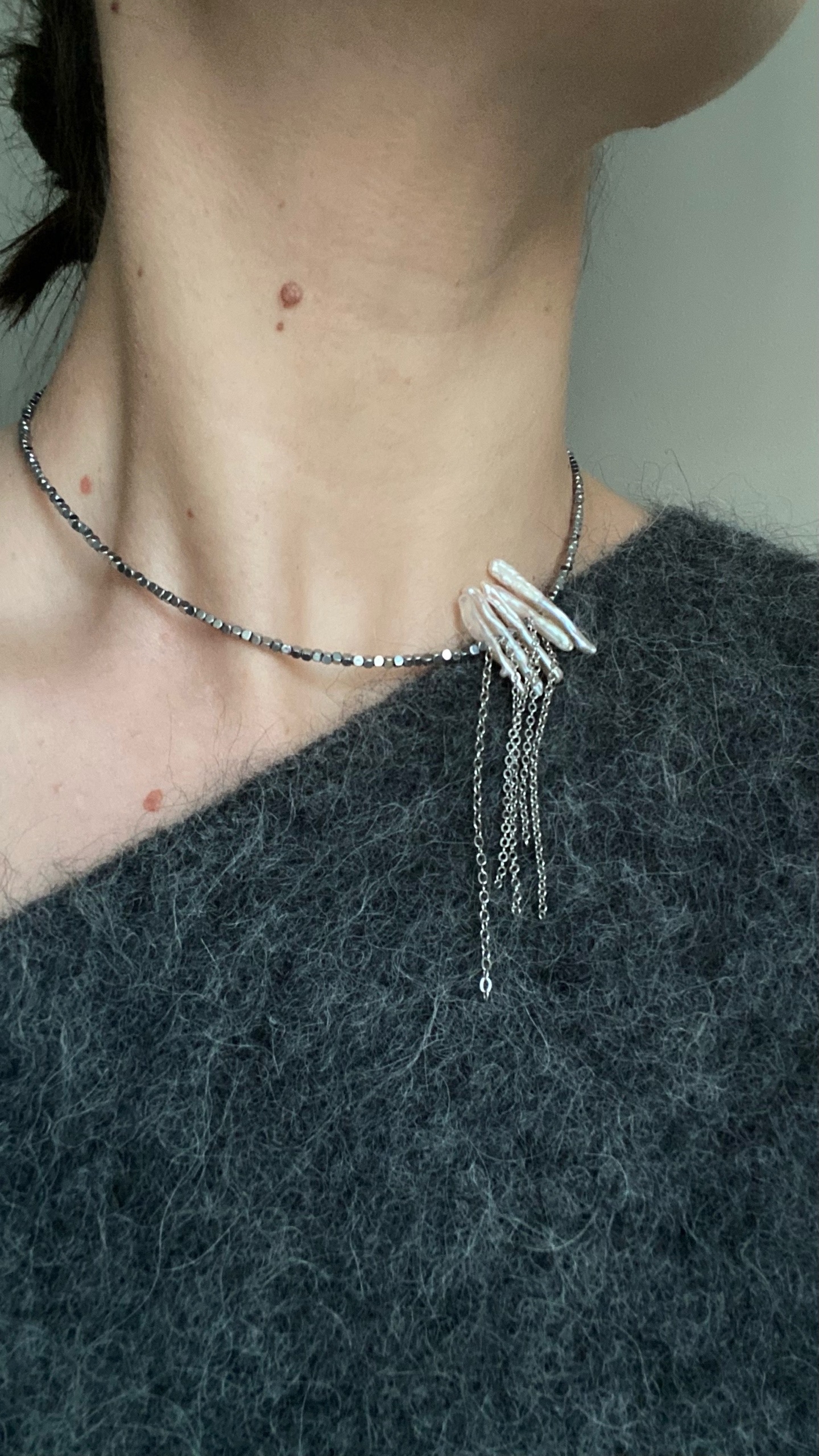 Асимметричный чокер из гематита, жемчуга Бивы.
