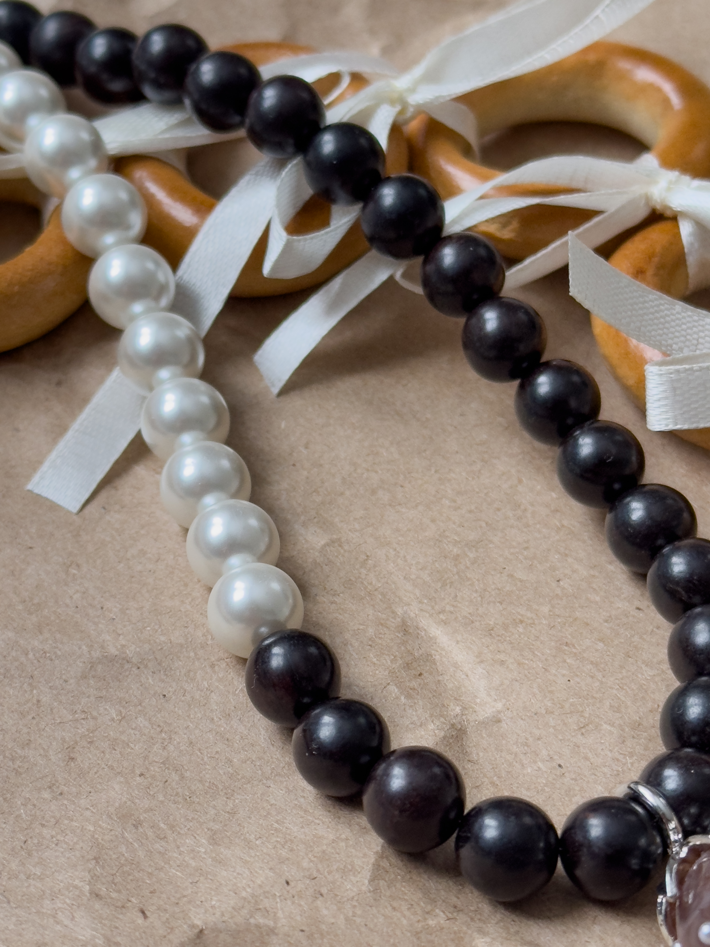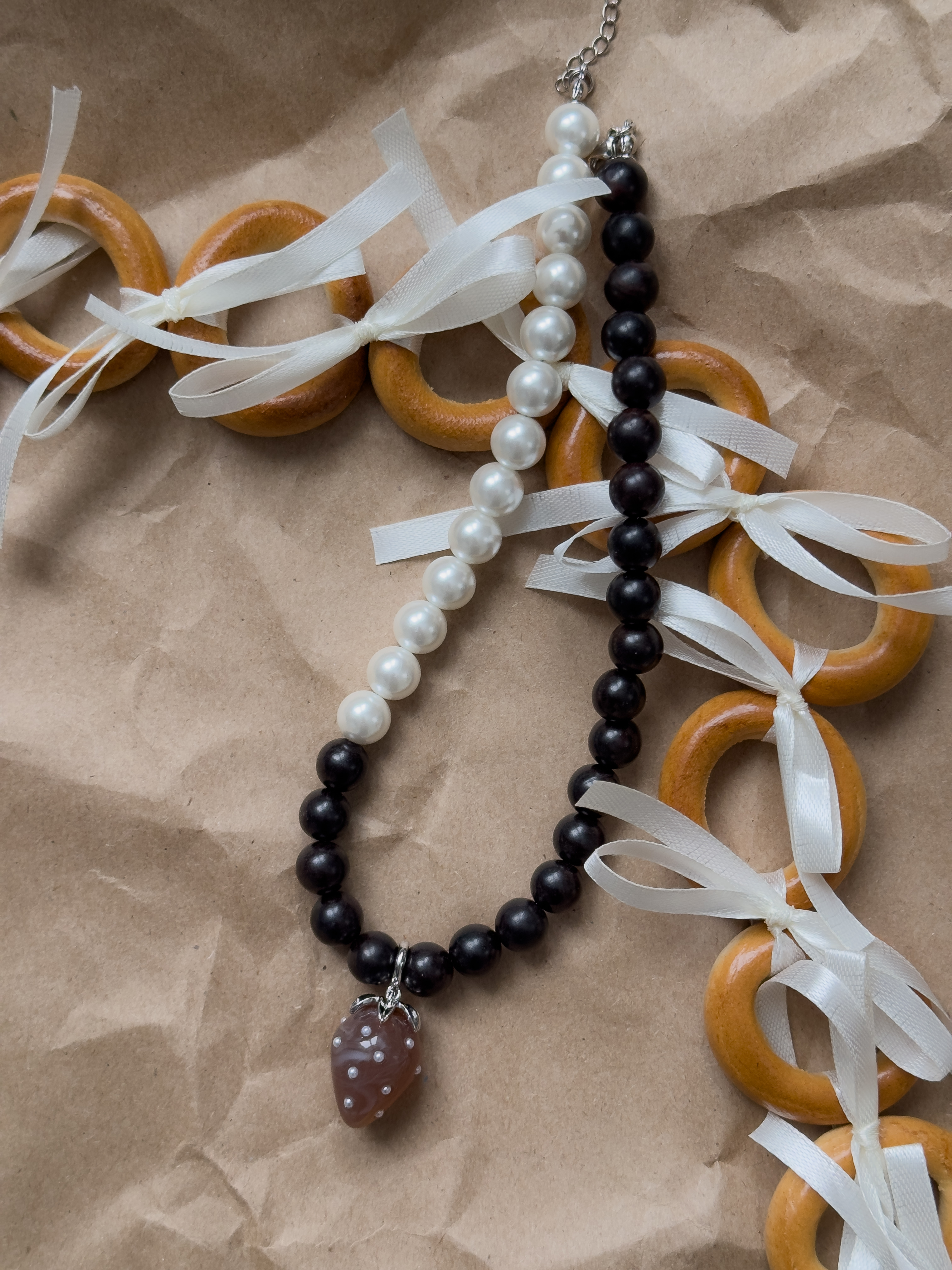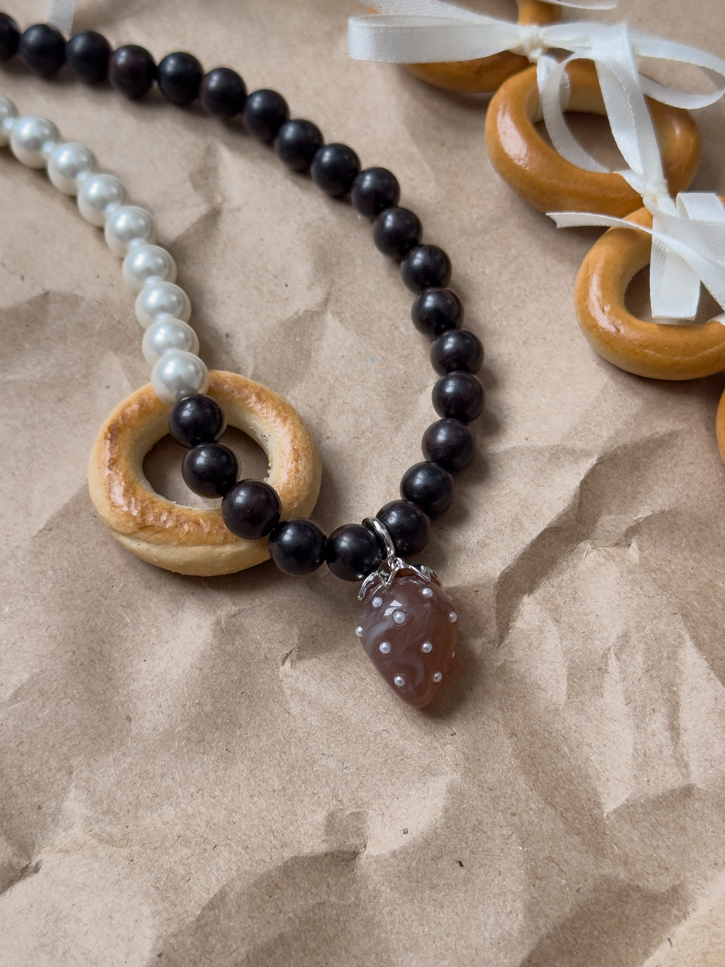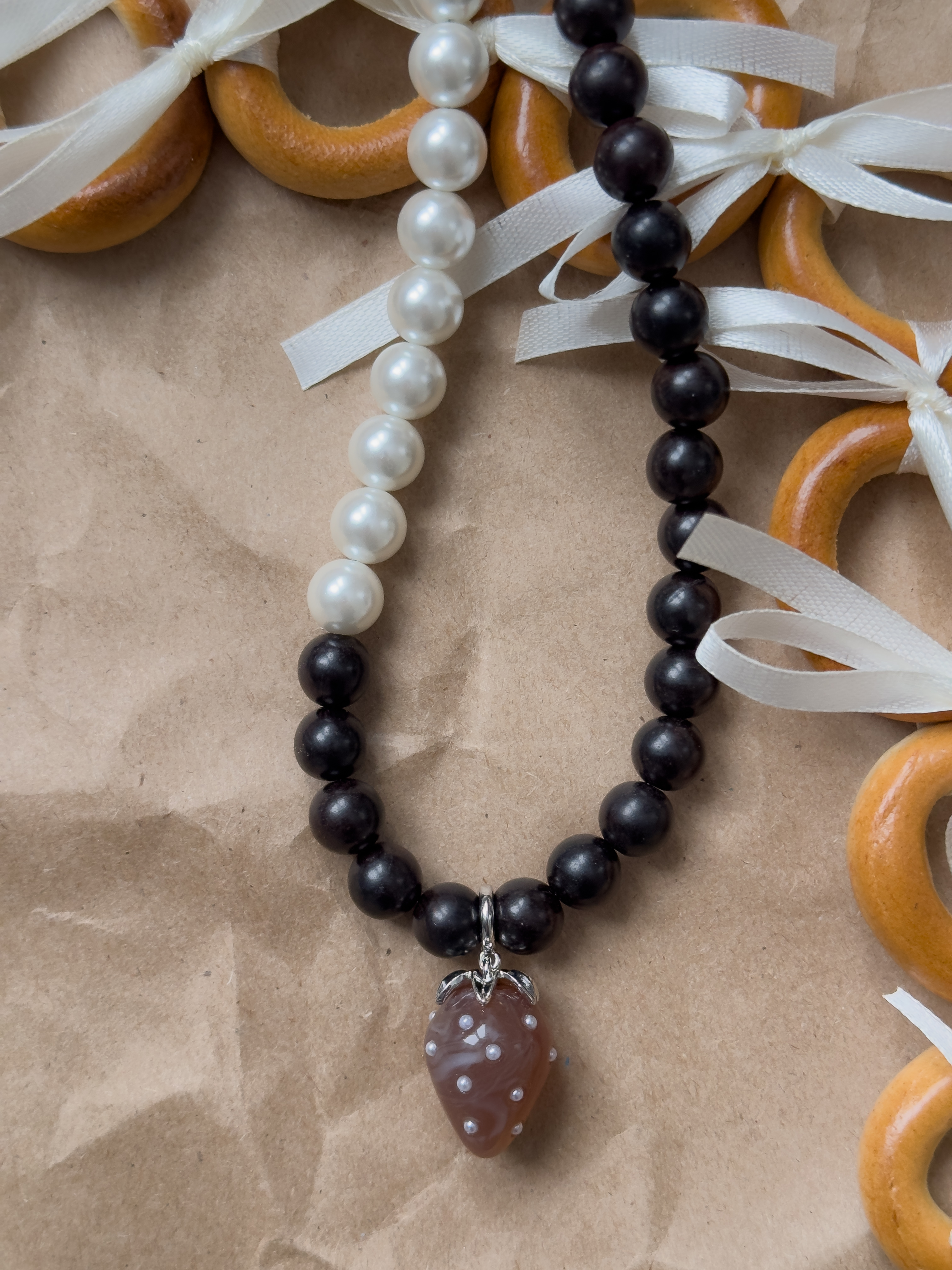 Чокер ручной работы из деревянных бусинок и жемчуга майорка с подвеской в виде клубники. Длина 37см + 5см удлинительная цепочка.