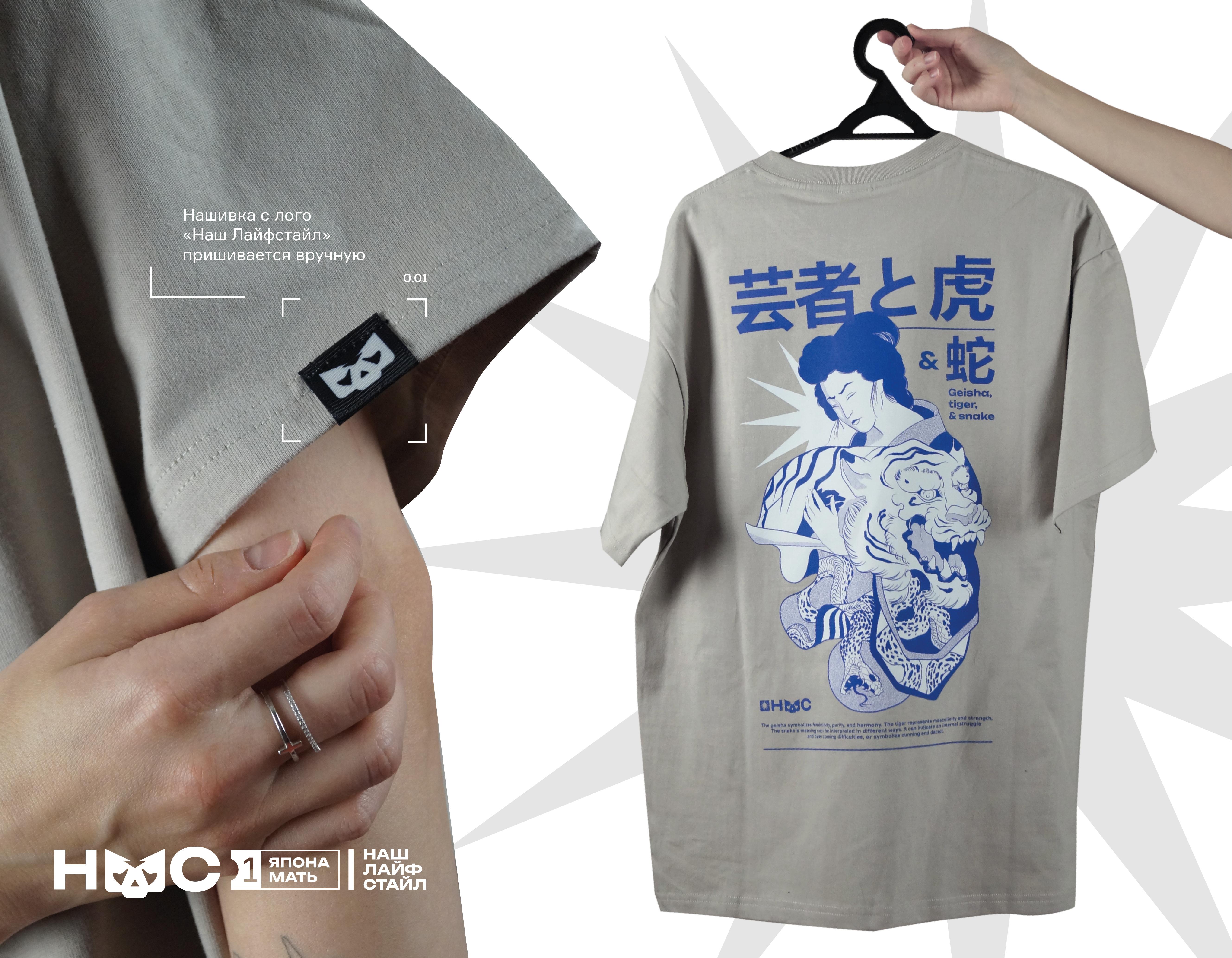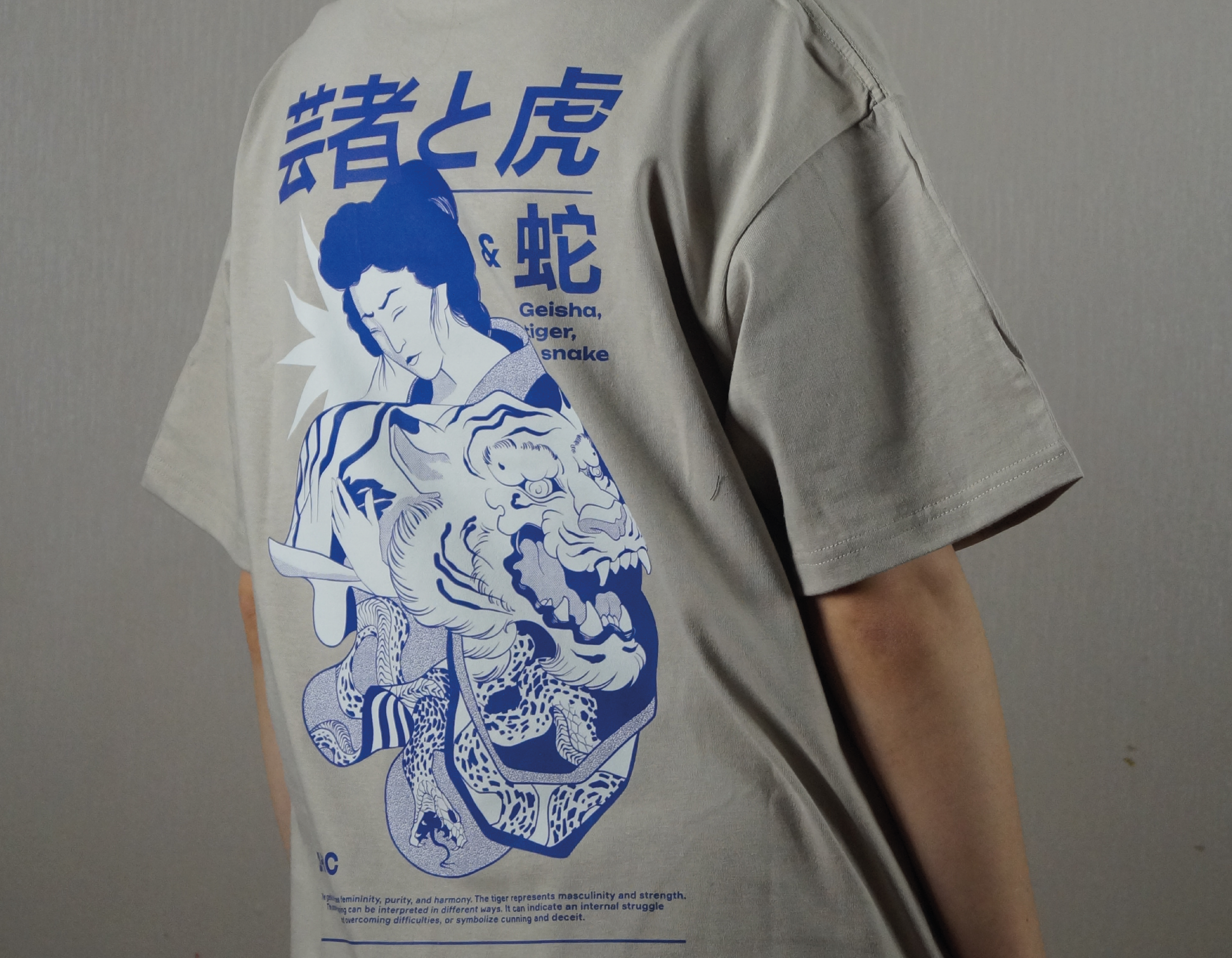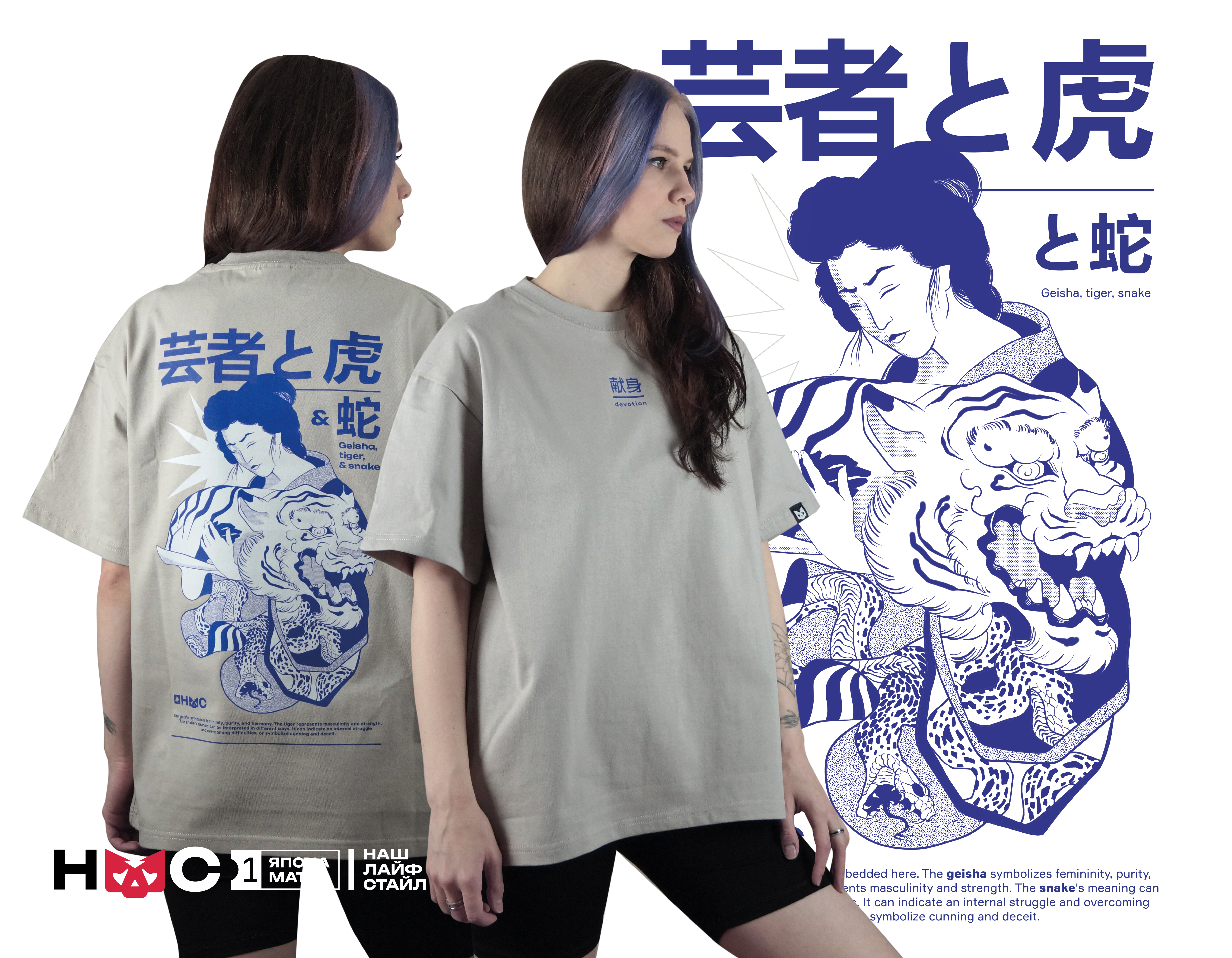 В данной работе зашито несколько символов. Женский символ – Гейша, передающий собой гармонию и внутреннюю невинность. Мужской – Тигр, представляет собой физическую силу и твёрдый взгляд на вещи.