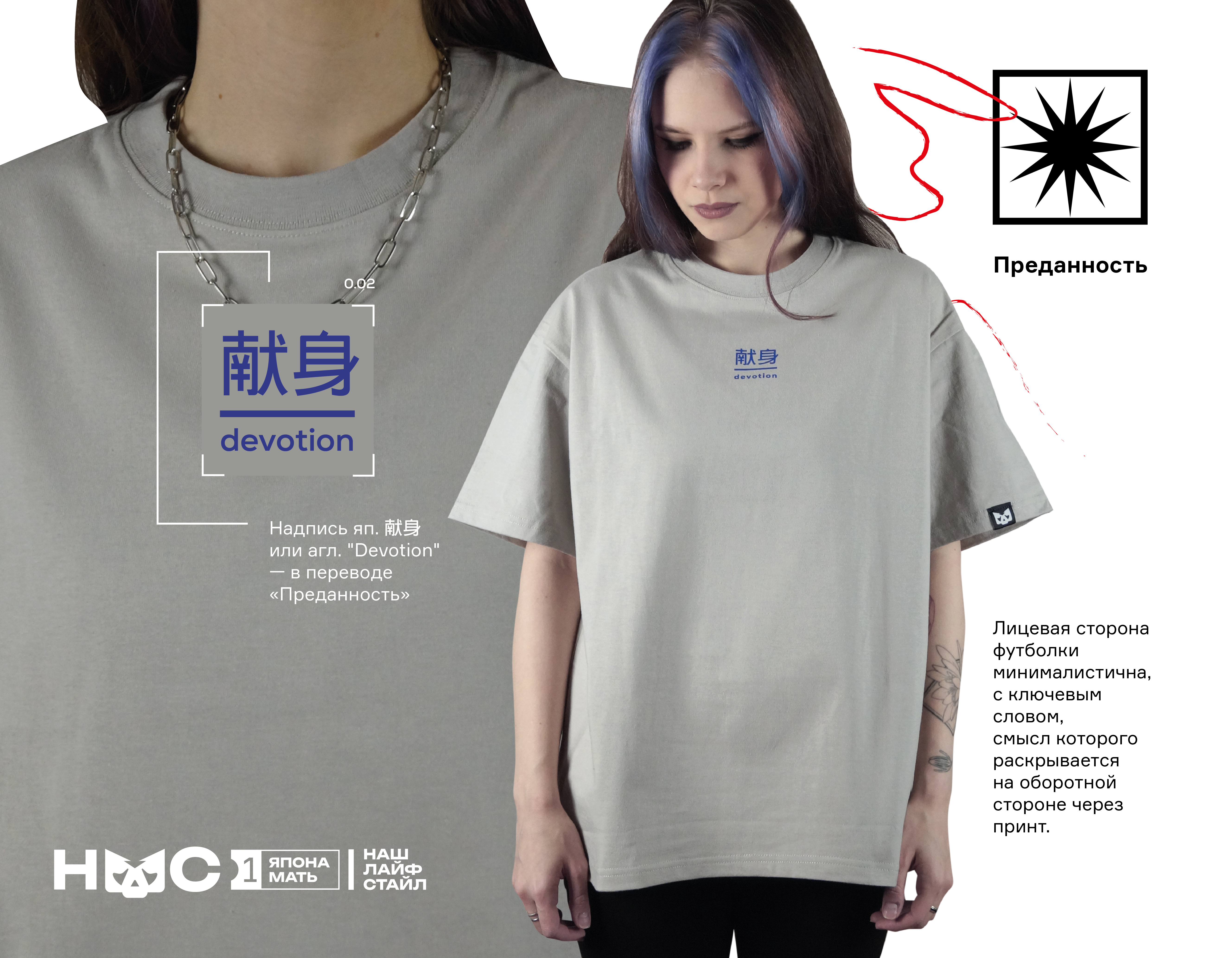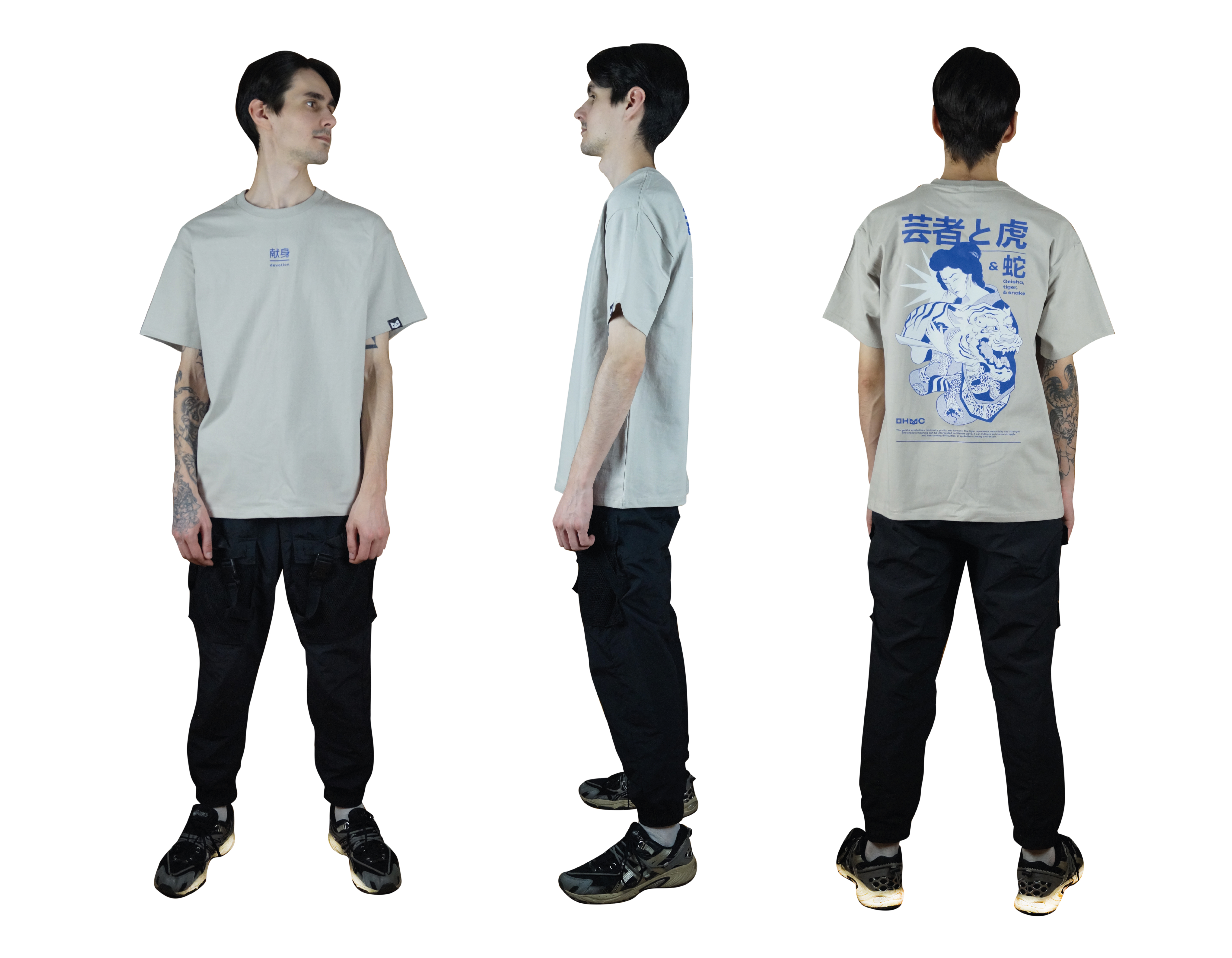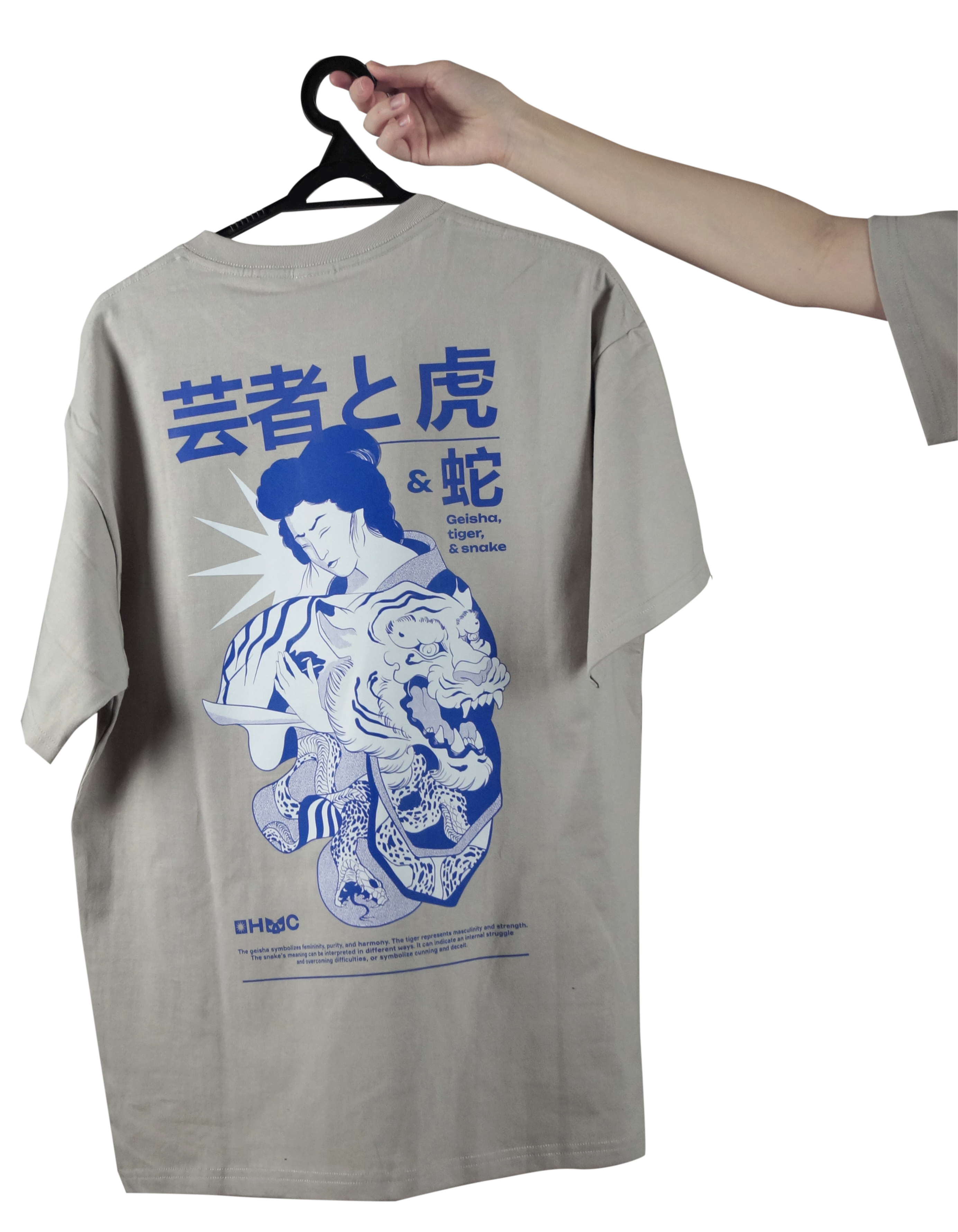 В данной работе зашито несколько символов. Женский символ – Гейша, передающий собой гармонию и внутреннюю невинность. Мужской – Тигр, представляет собой физическую силу и твёрдый взгляд на вещи.