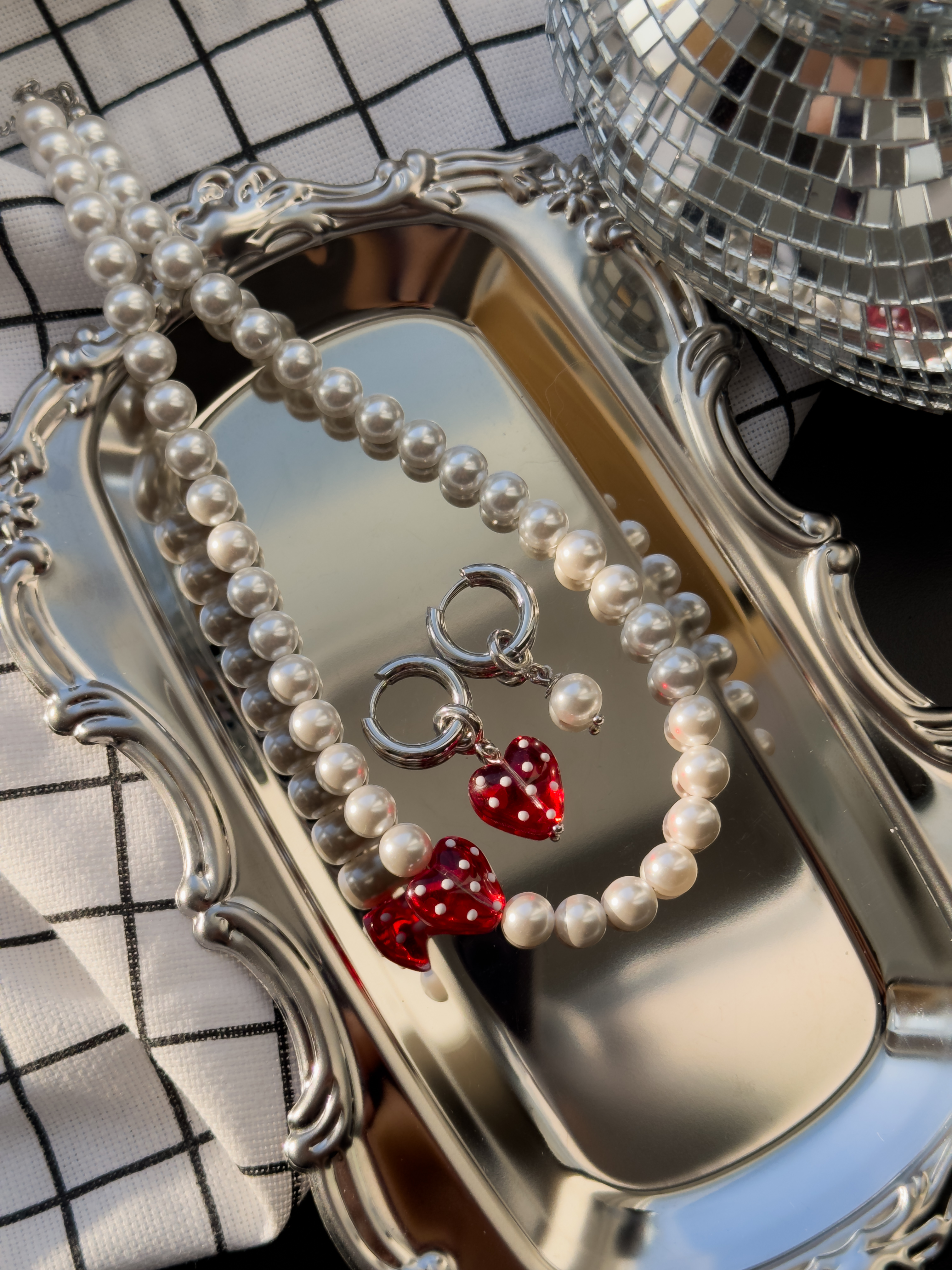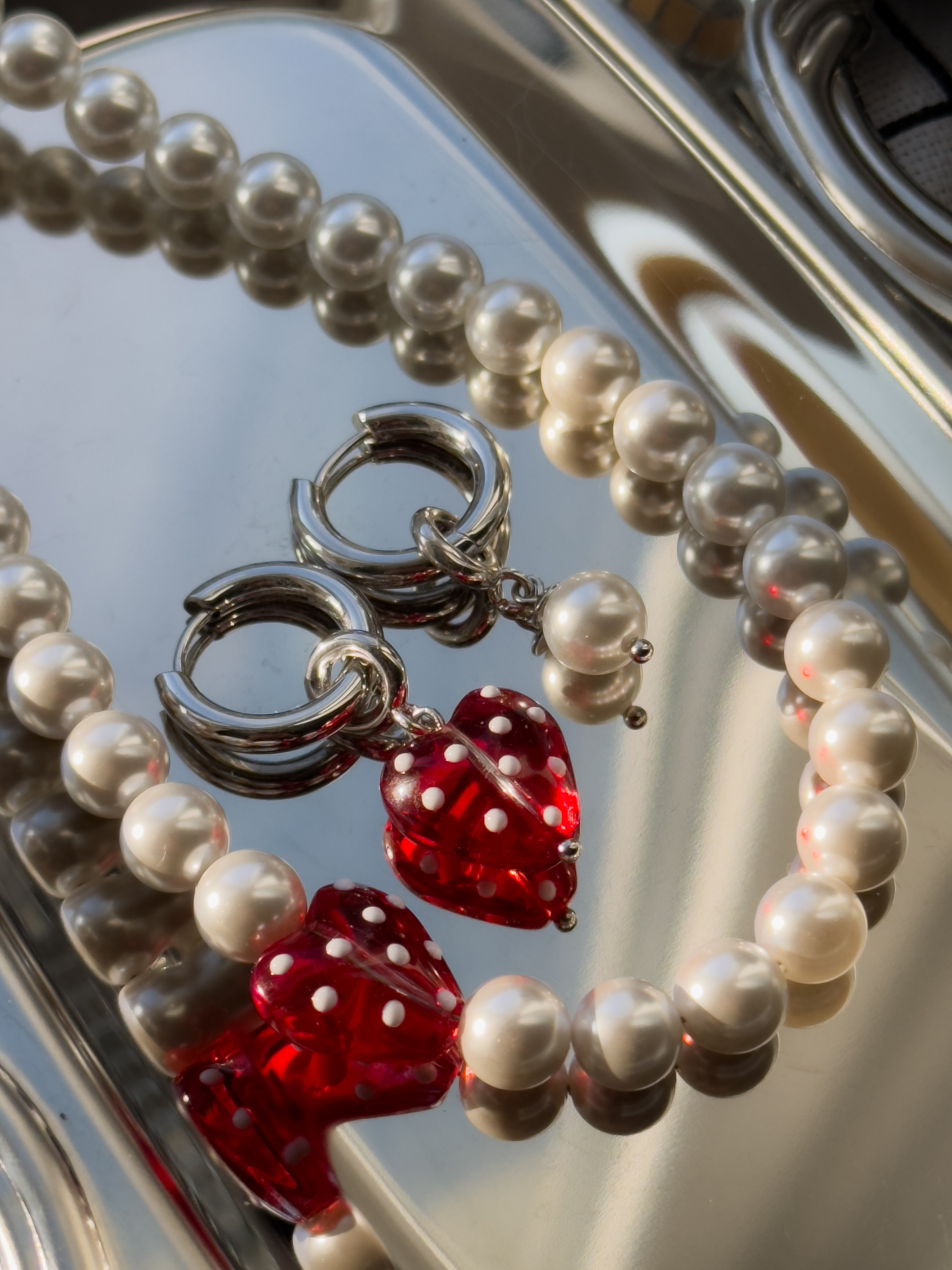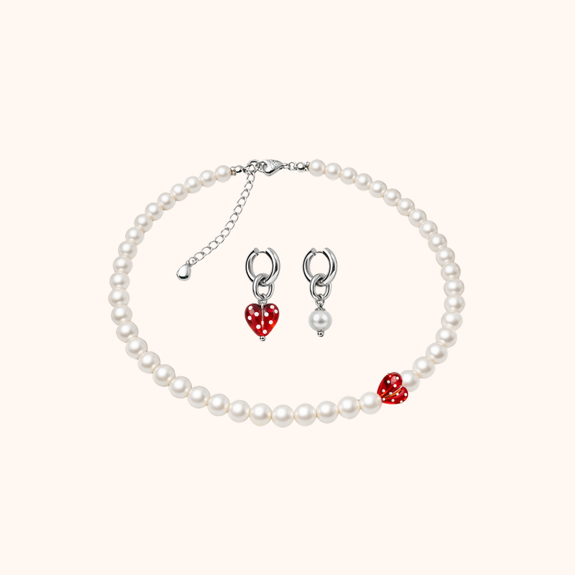 Перекрасный комплект ручной работы: чокер из жемчужинок майорка и стеклянного сердца, серьги с подвесками из жемчужины майорка и стеклянного сердца.