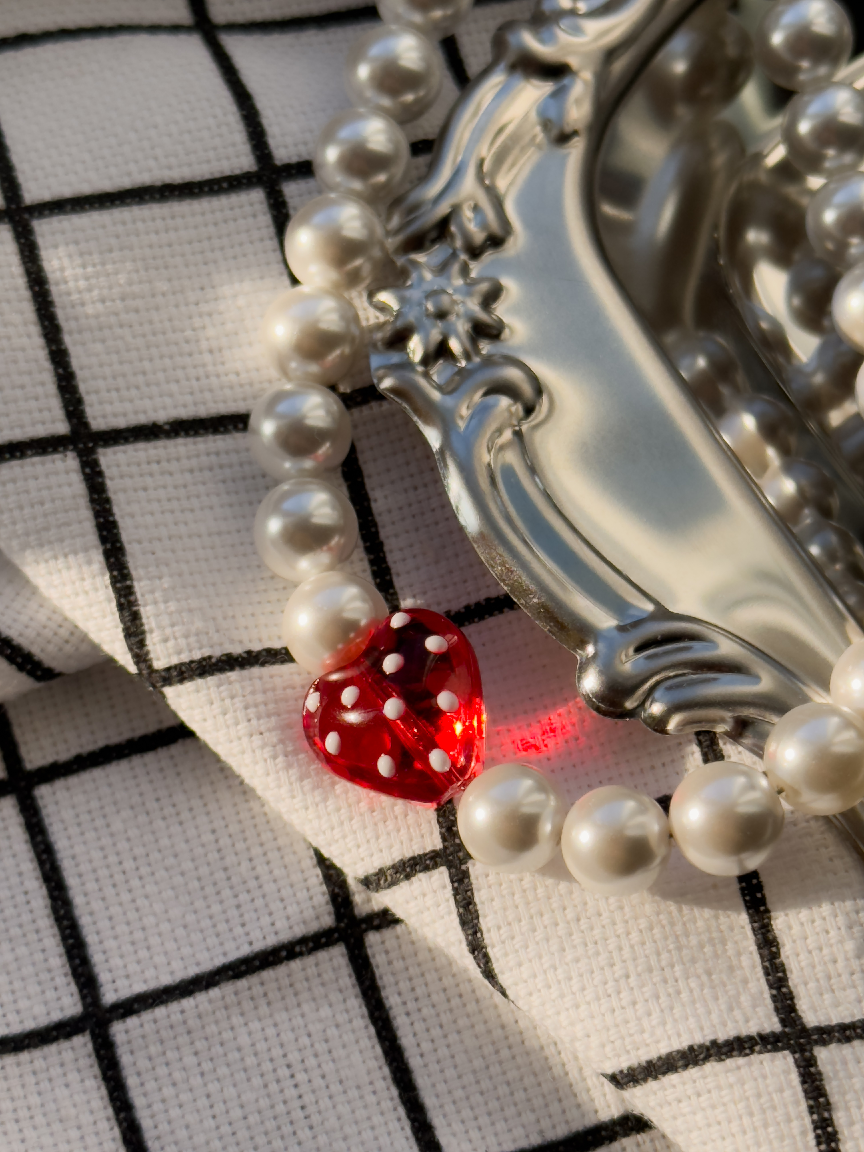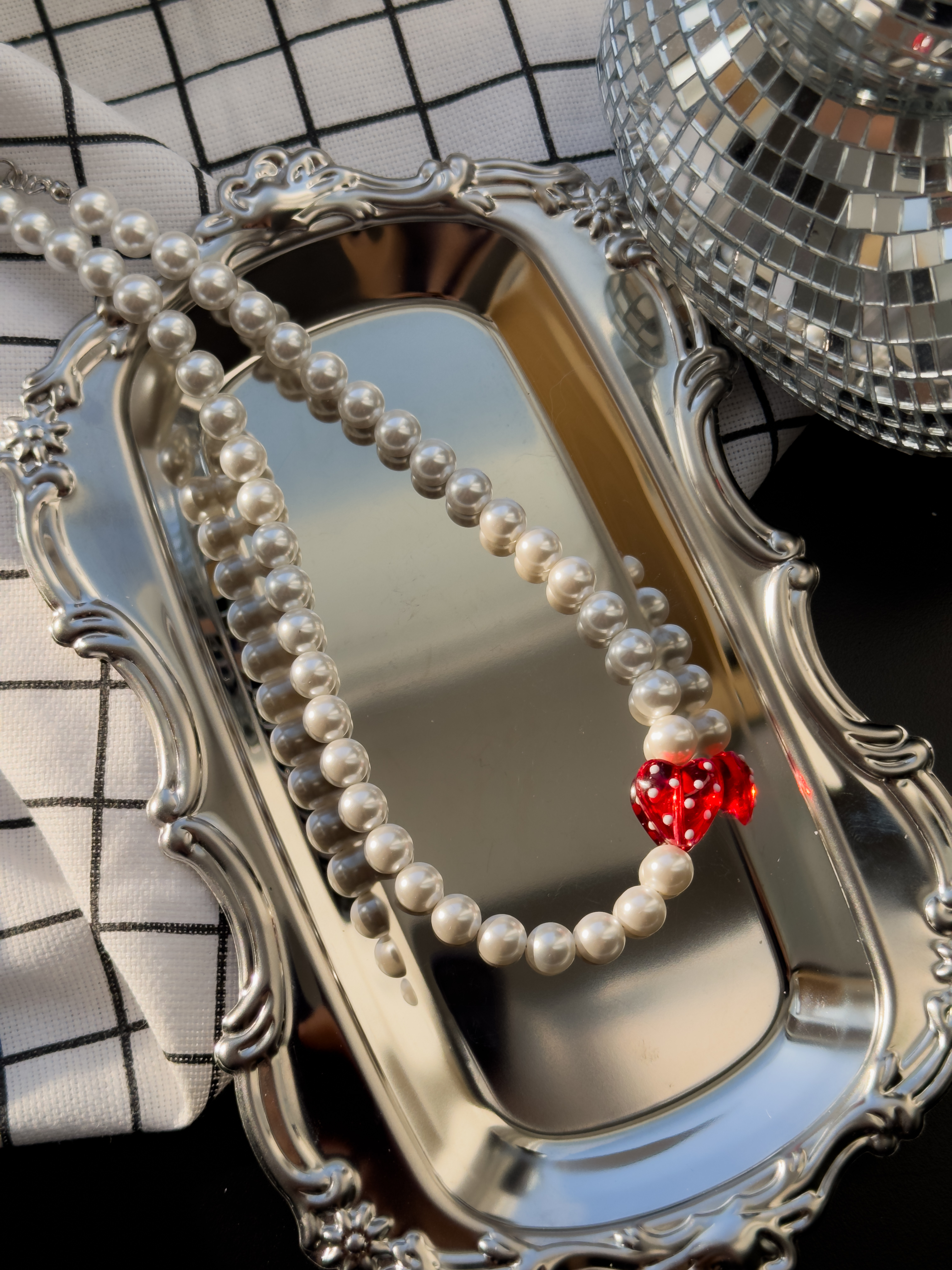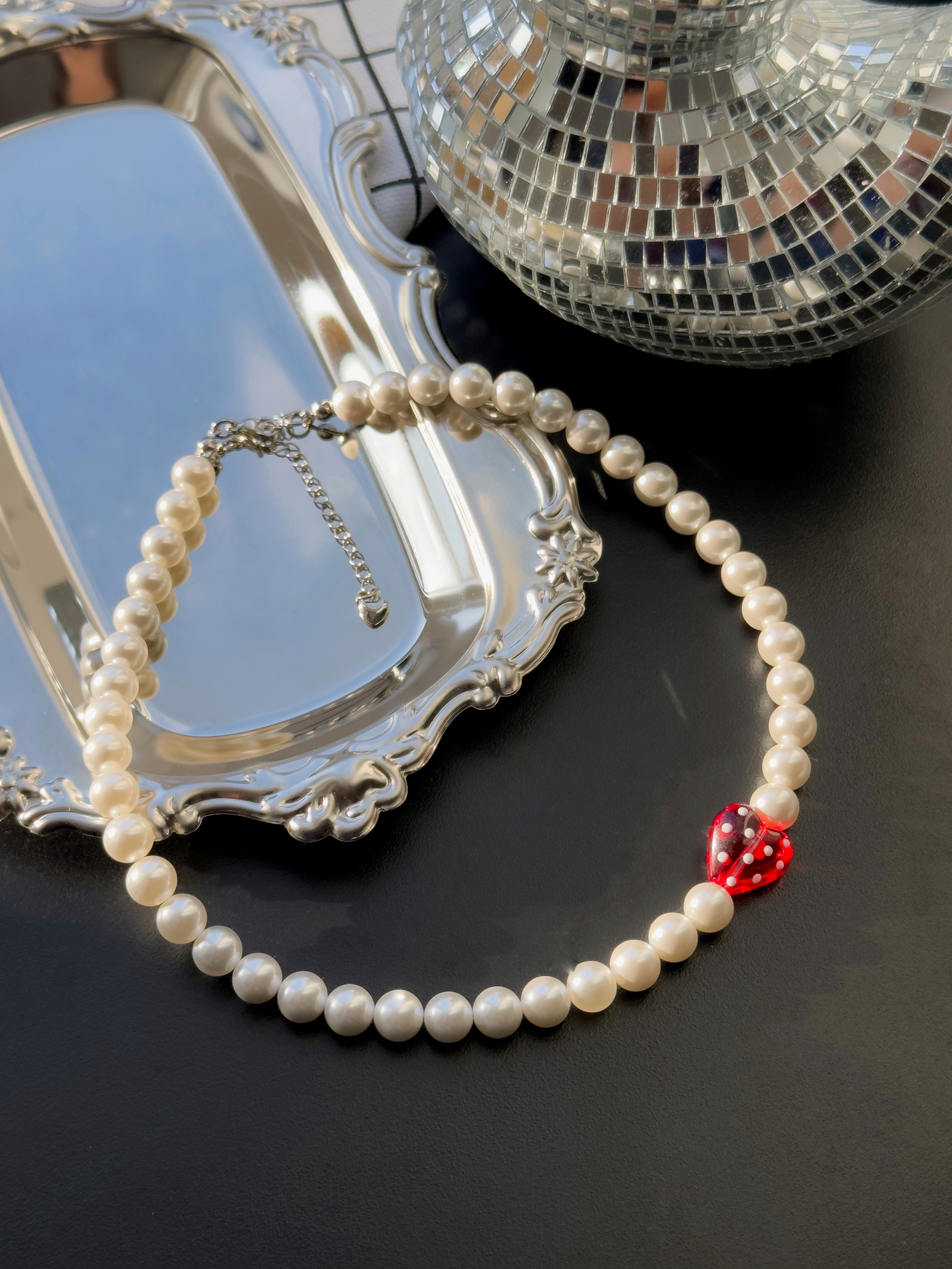Перекрасный комплект ручной работы: чокер из жемчужинок майорка и стеклянного сердца, серьги с подвесками из жемчужины майорка и стеклянного сердца.