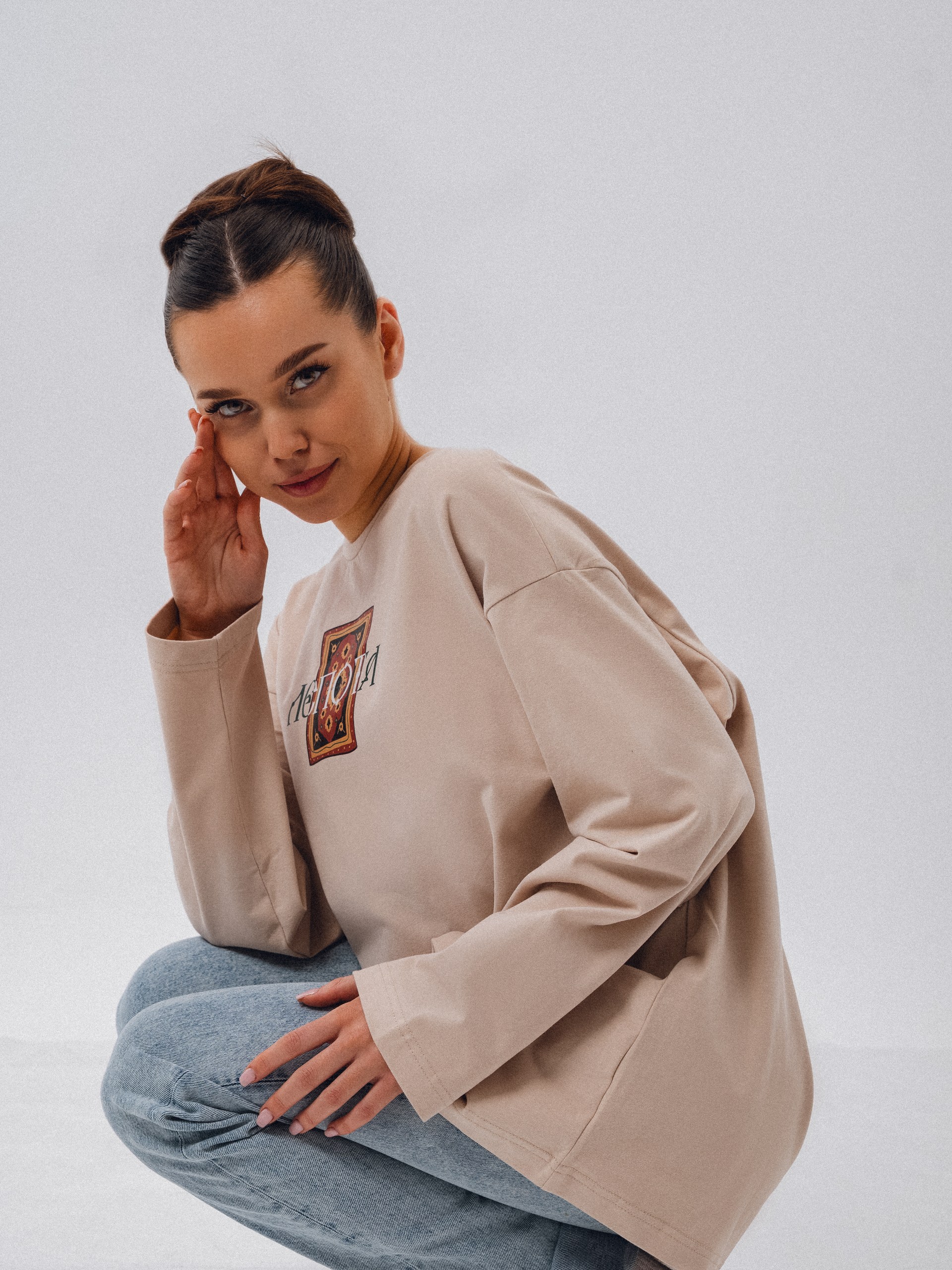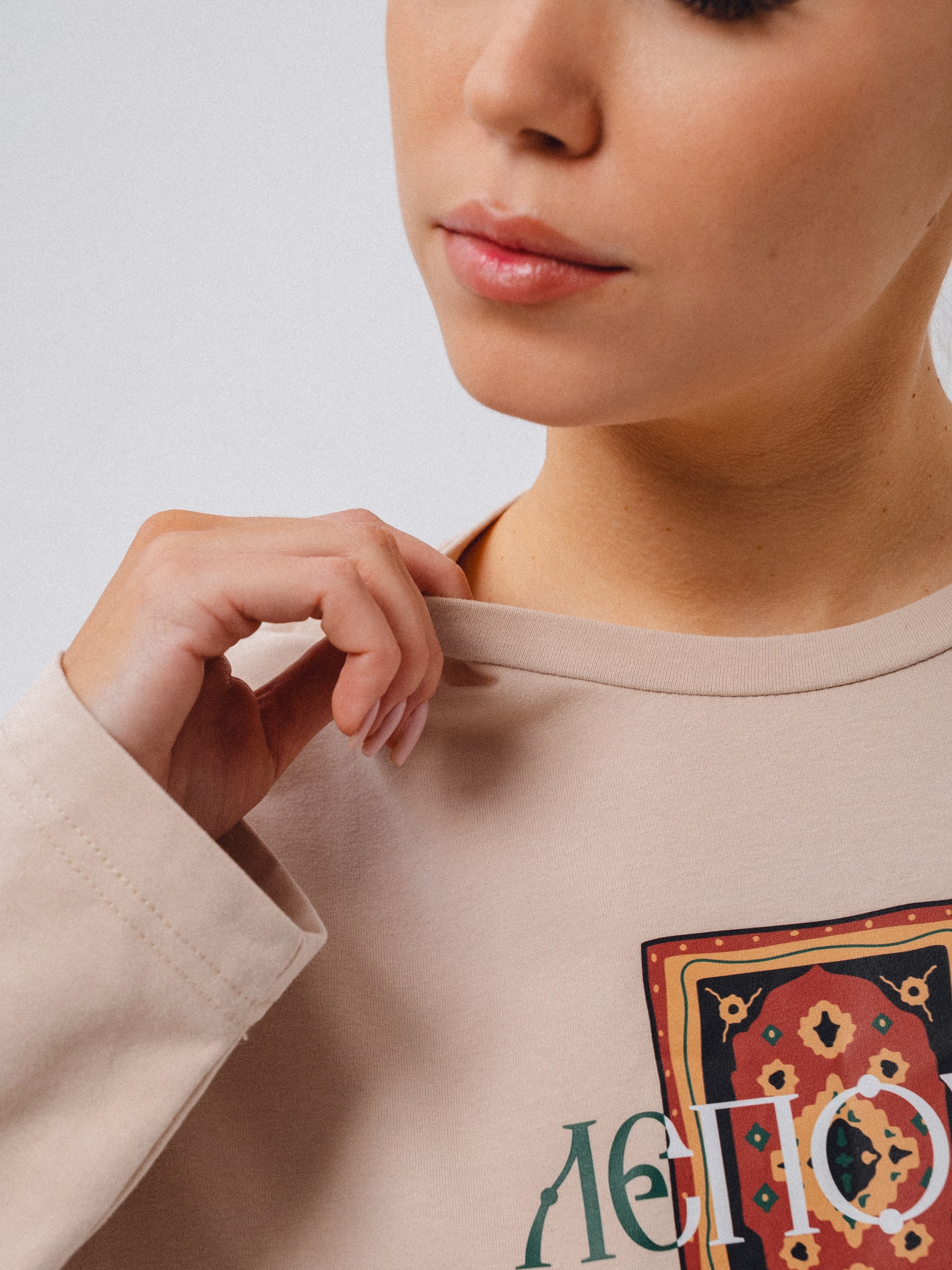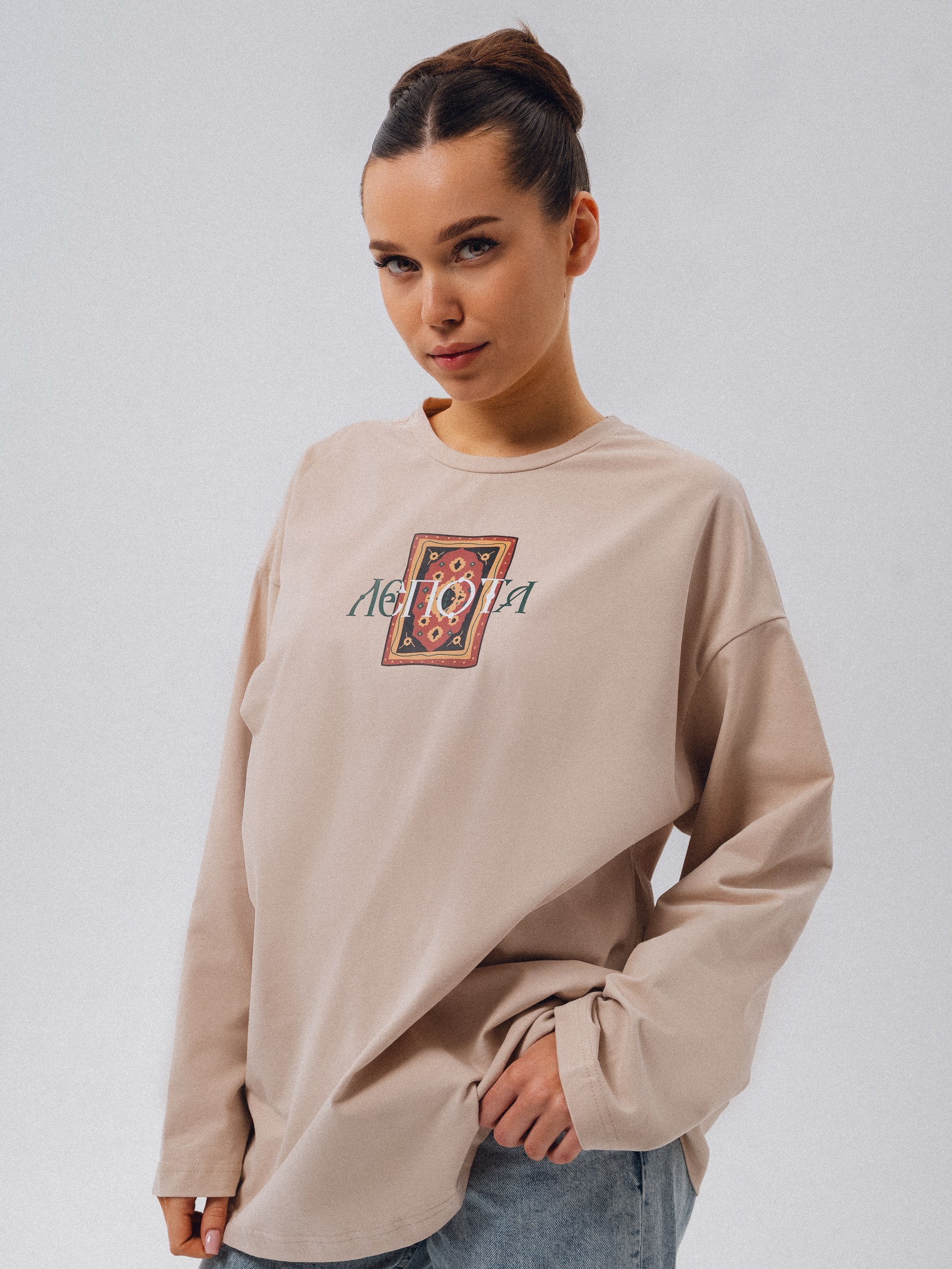 Бежевый лонгслив "Лепота" из нежного материала. Один из самых продаваемых принтов у нас. Лепота....