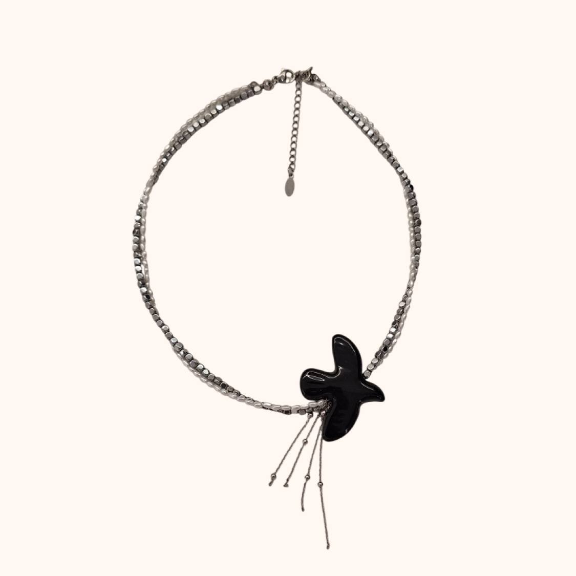 Асимметричное ожерелье из гематита, жемчуга Майорки и керамической птицы.