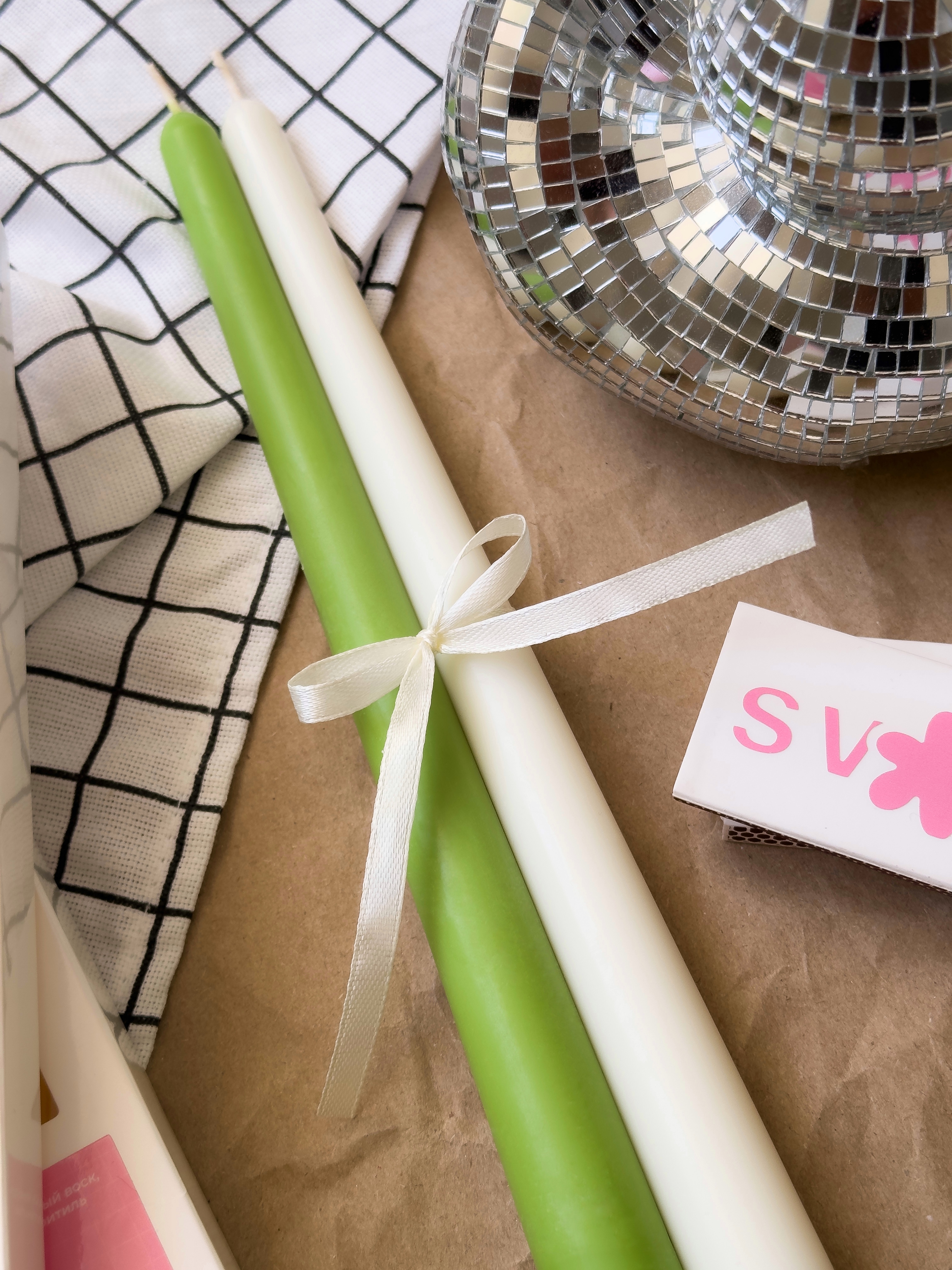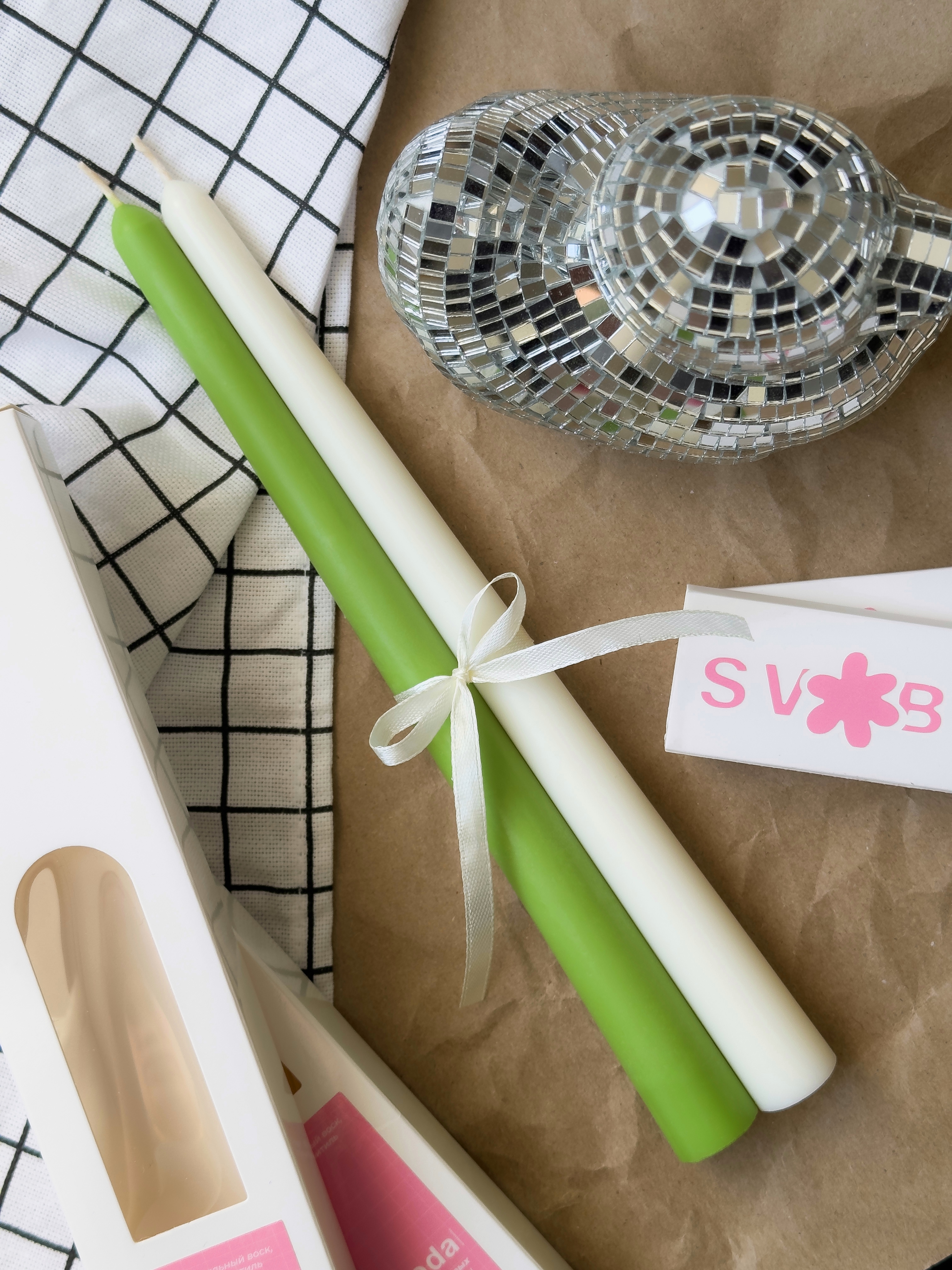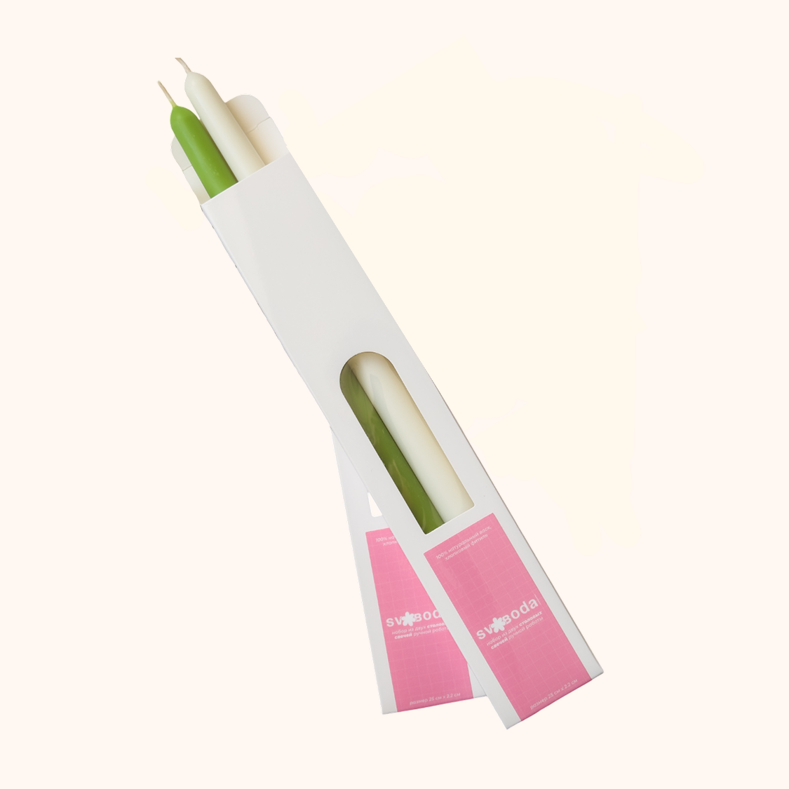 Одна свеча травяного цвета, вторая цвета молочного цвета.