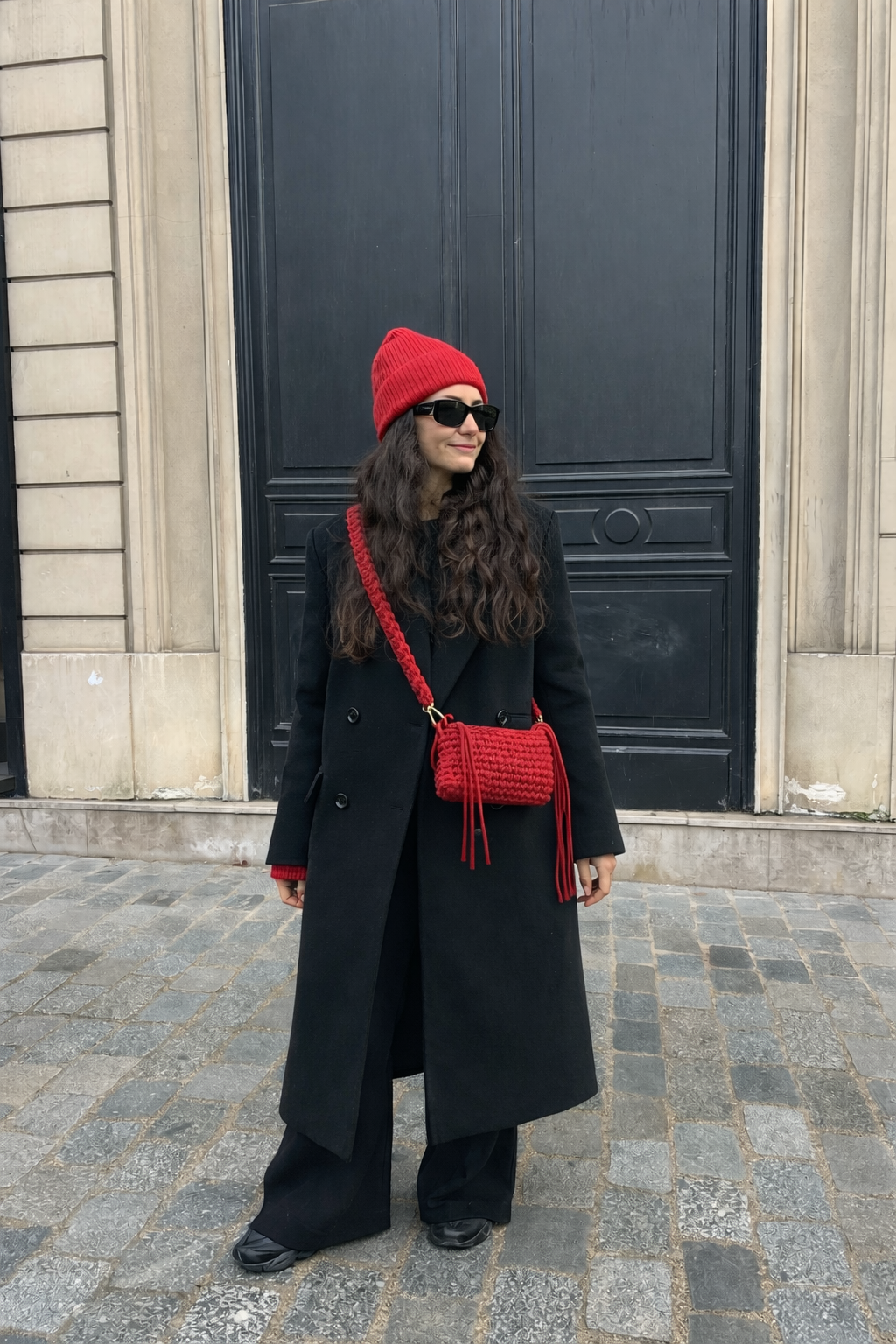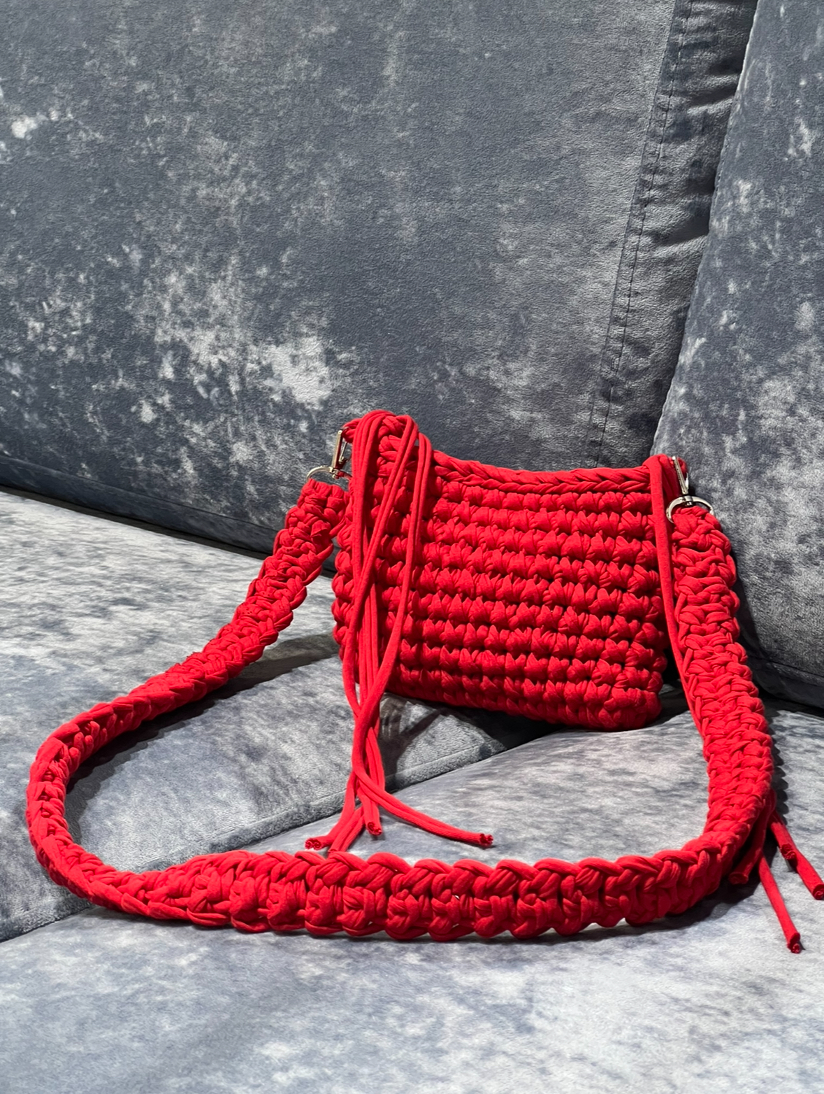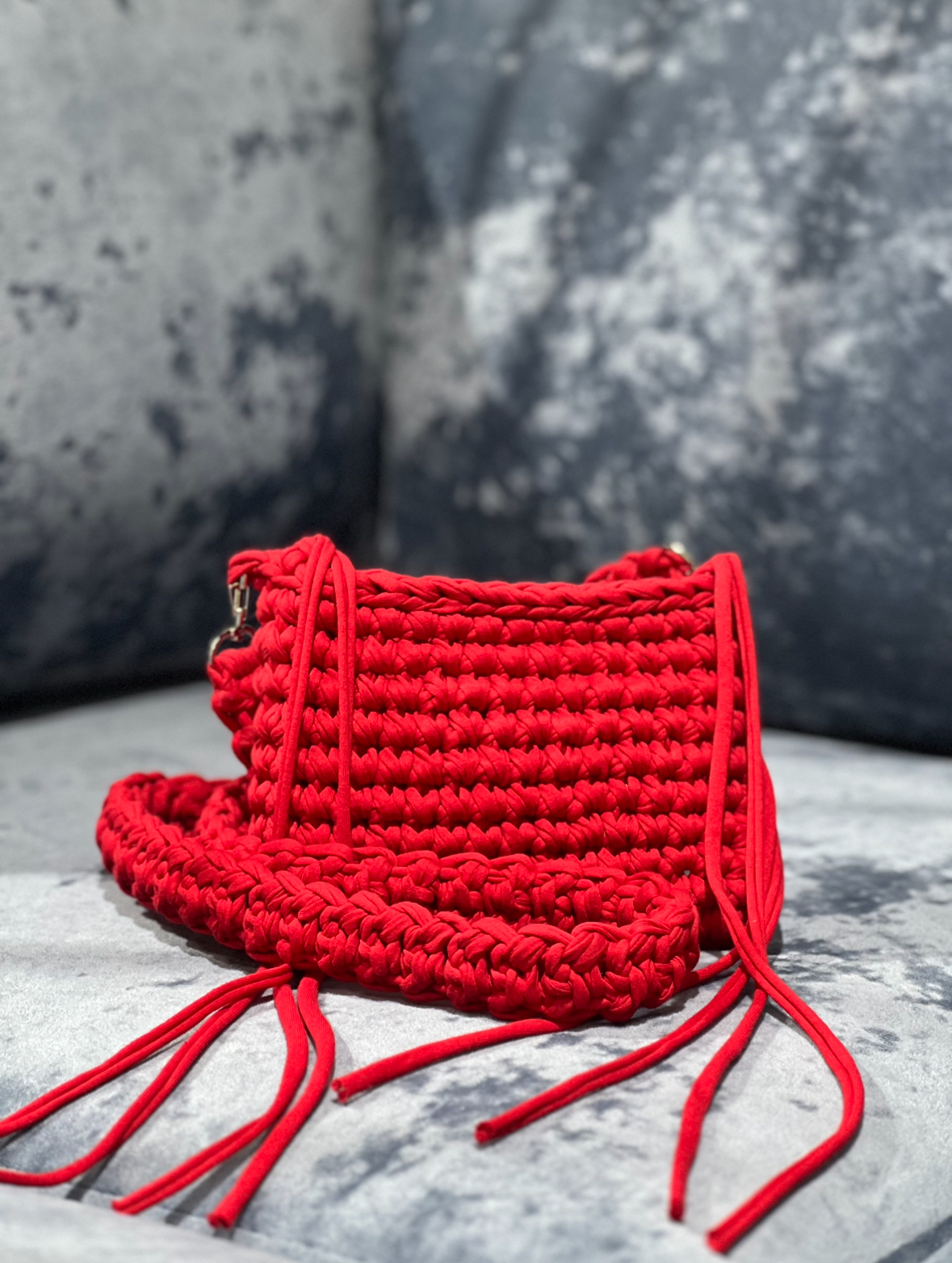 Яркая сумка из трикотажной пряжи небольшого размера. Внутри одно отделение, закрывается на магнитную кнопку