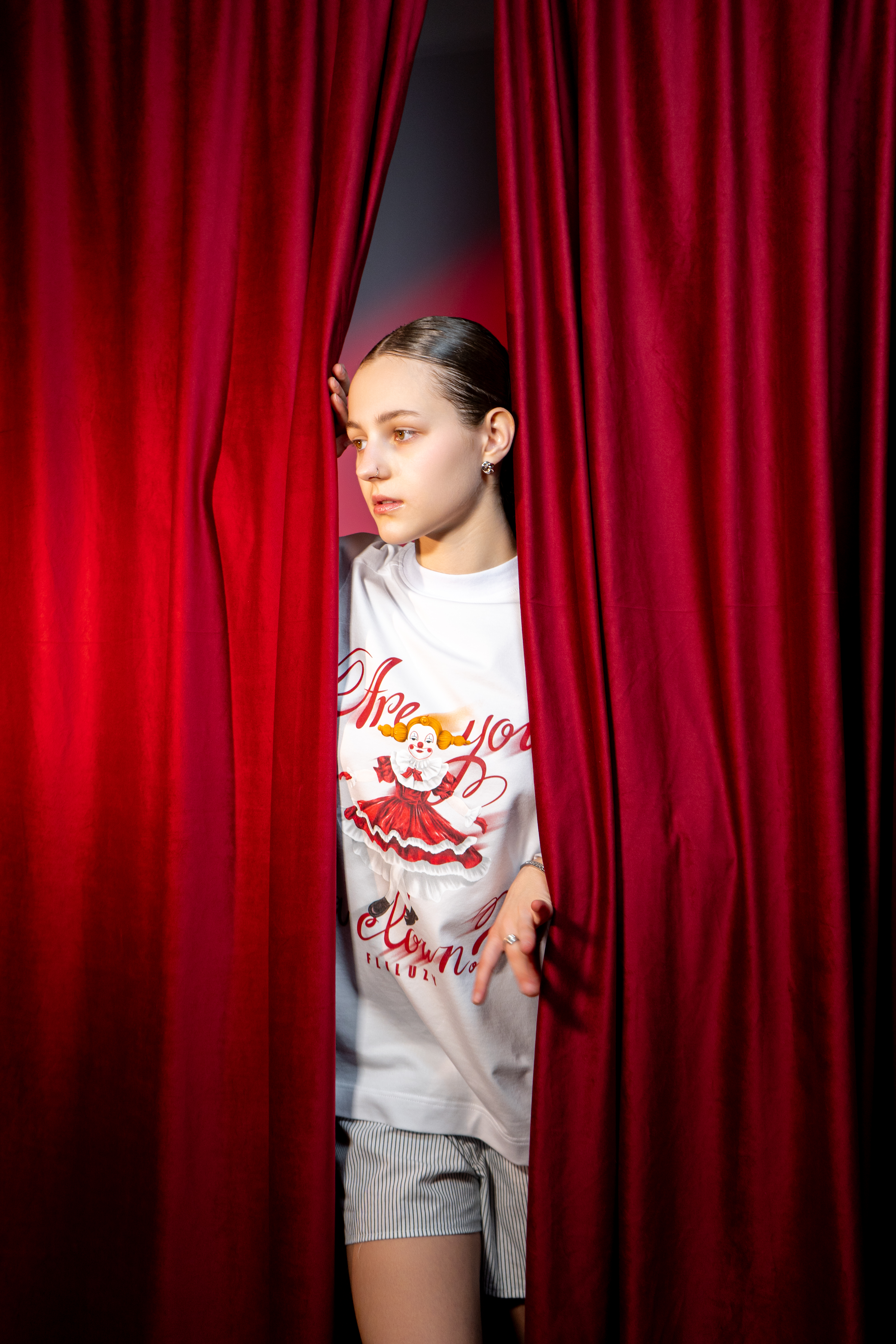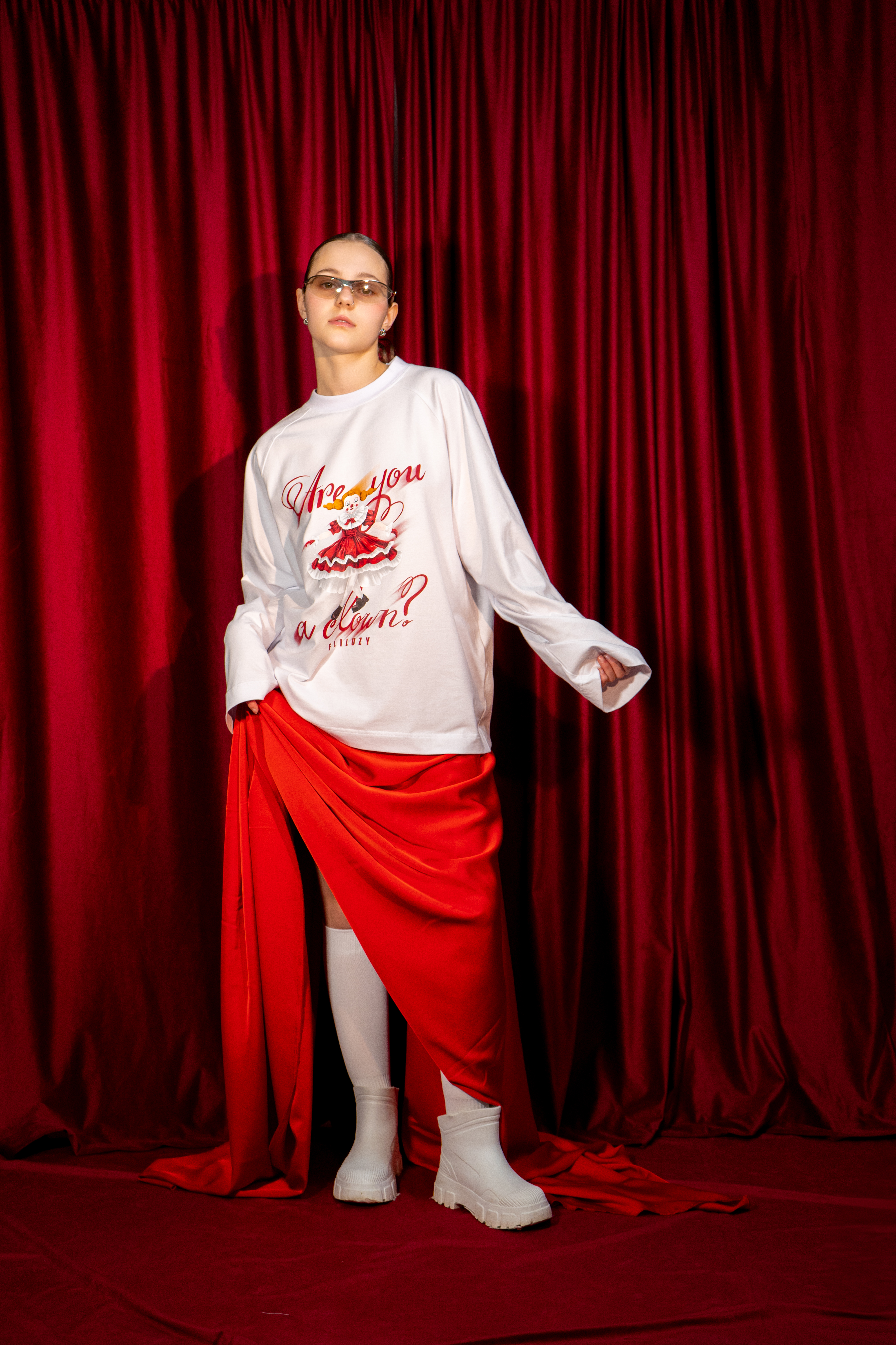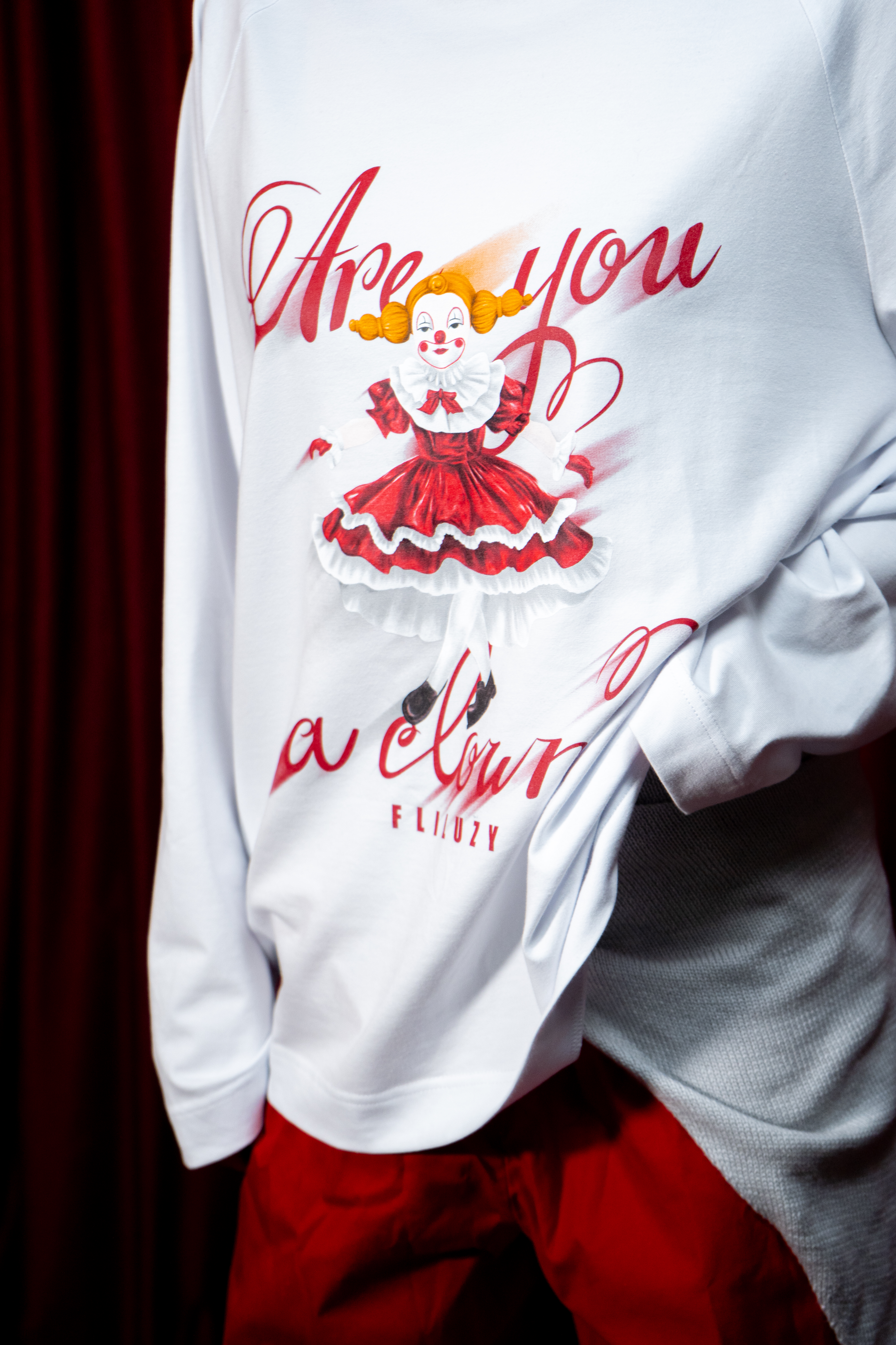 На принте изображена клоунесса и фраза «ты что, клоун?».