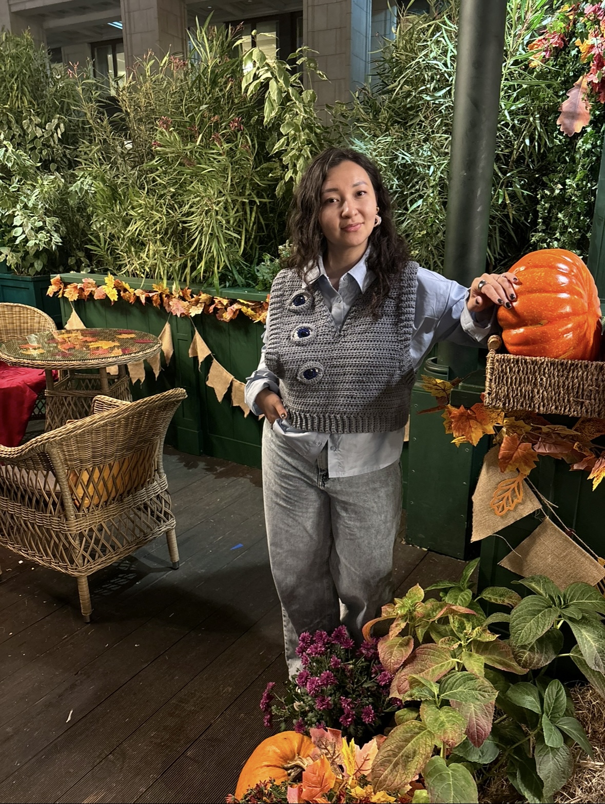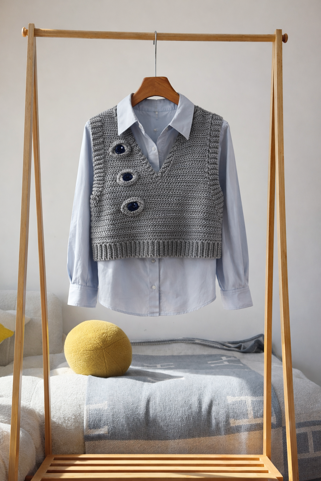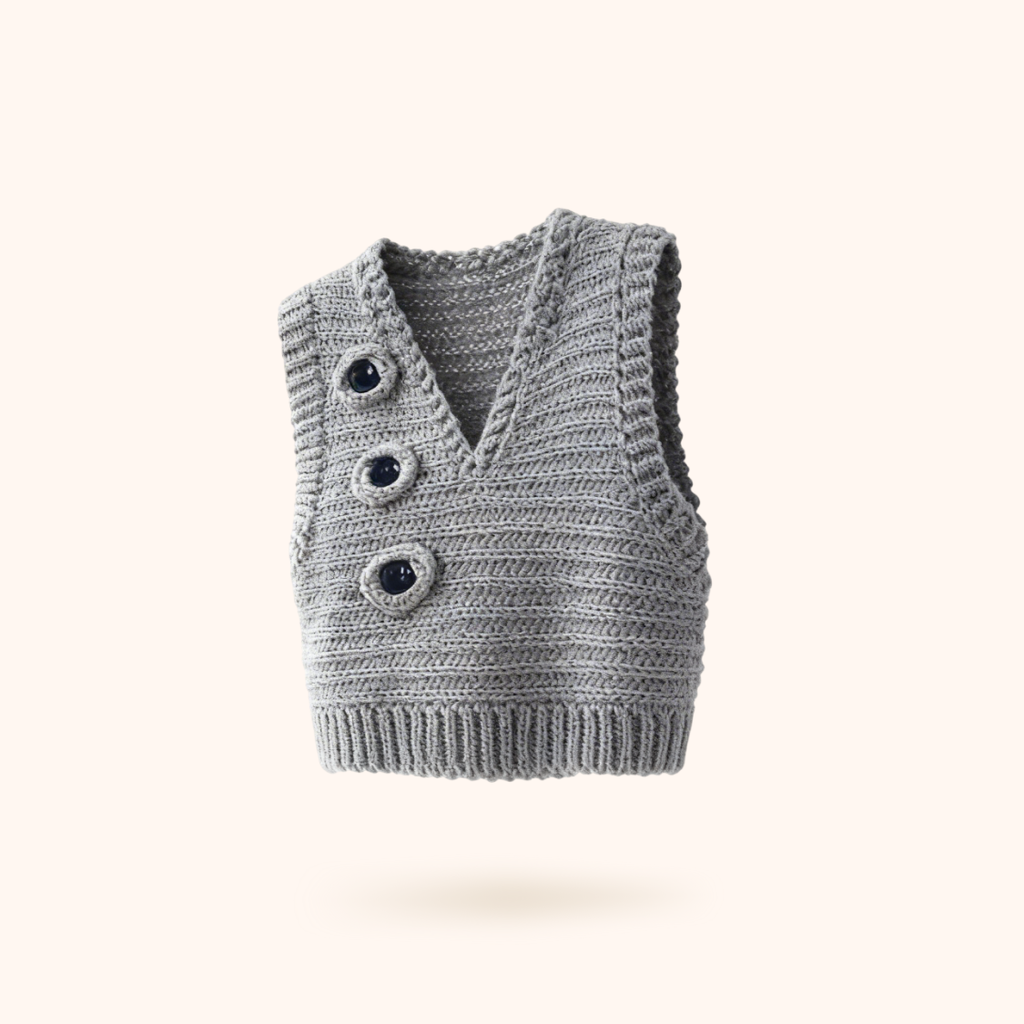Вязаная вручную серая жилетка с необычным акцентом в виде глаз