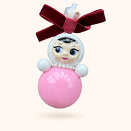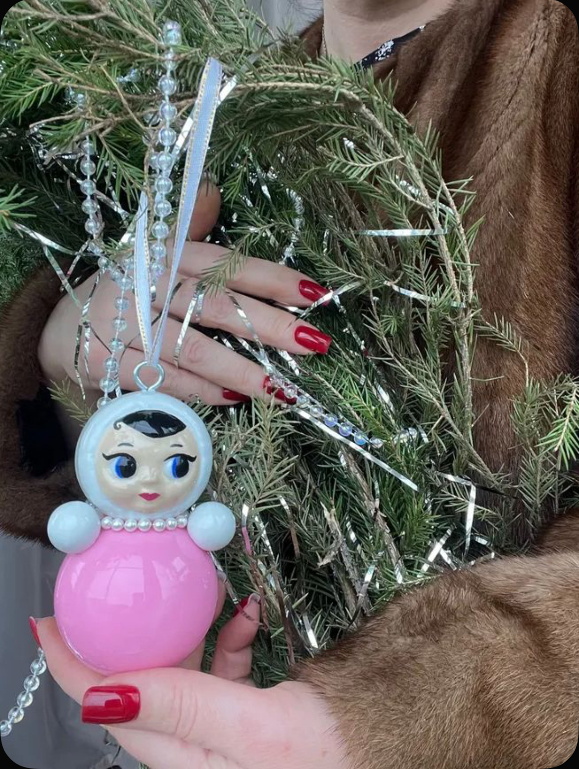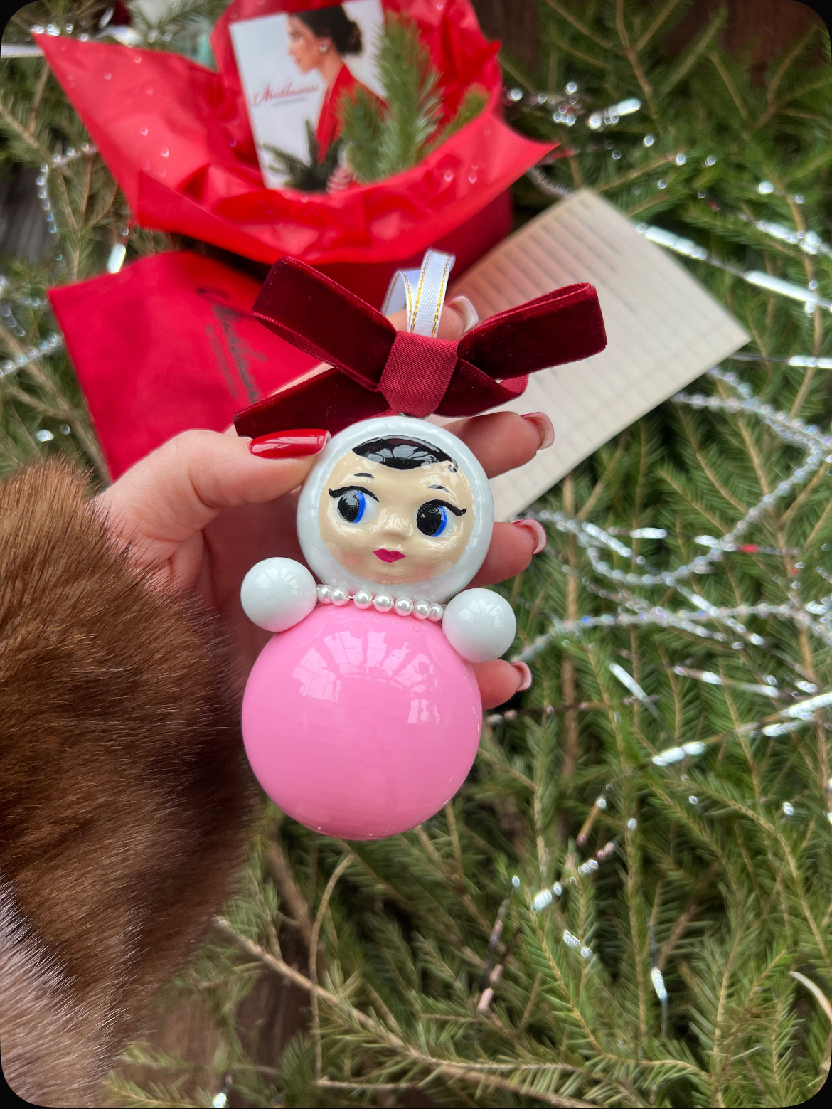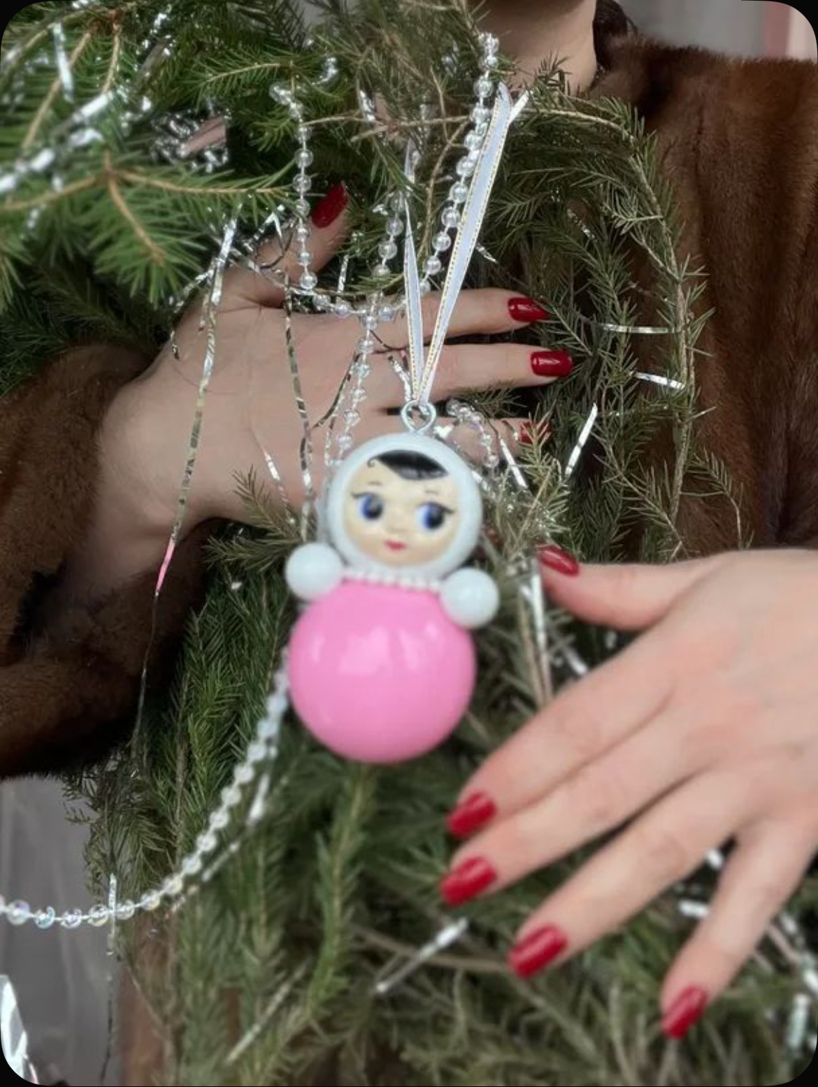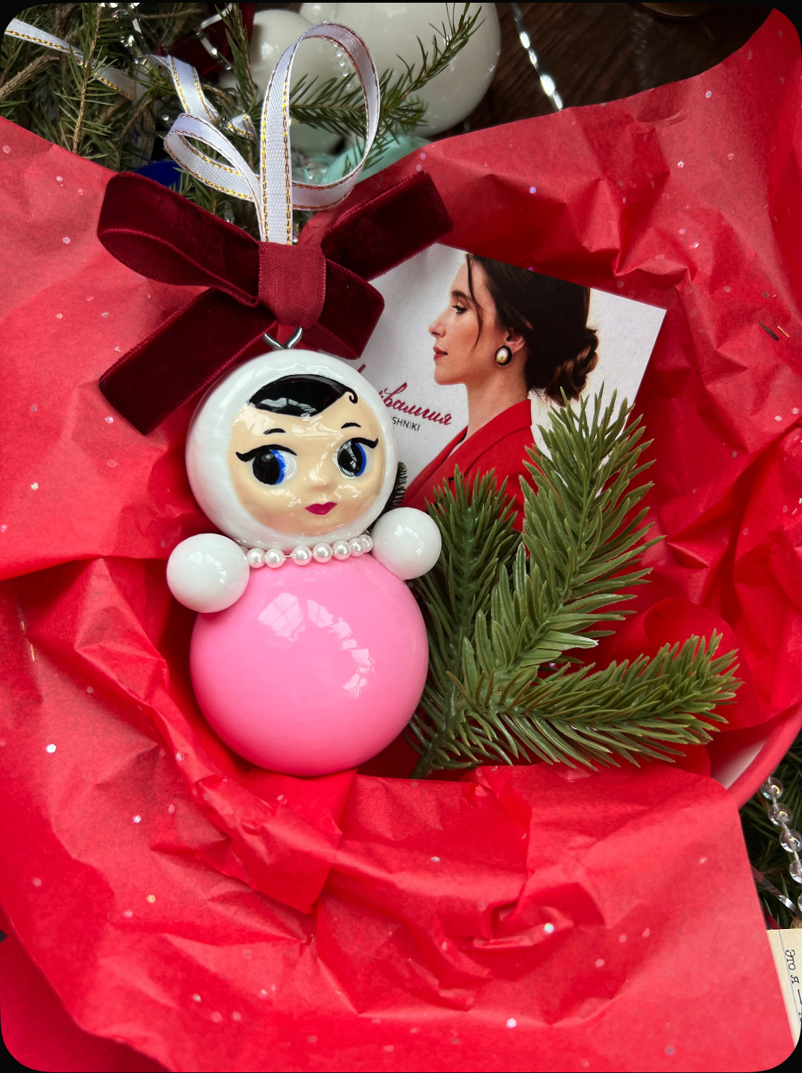 Коллекционная ёлочная розовая игрушка «Неваляшка» ручной работы в цвете Тиффани.