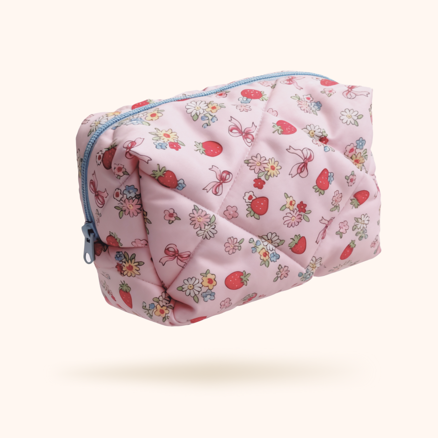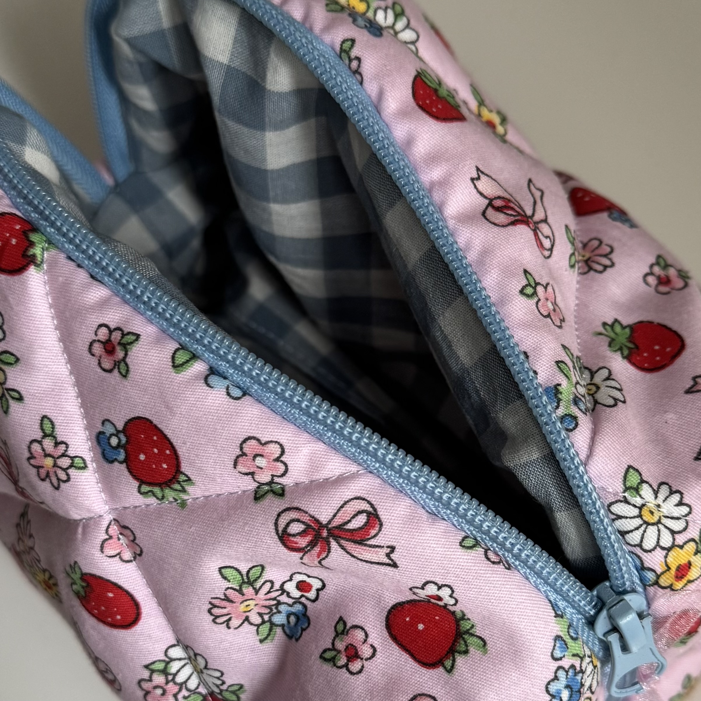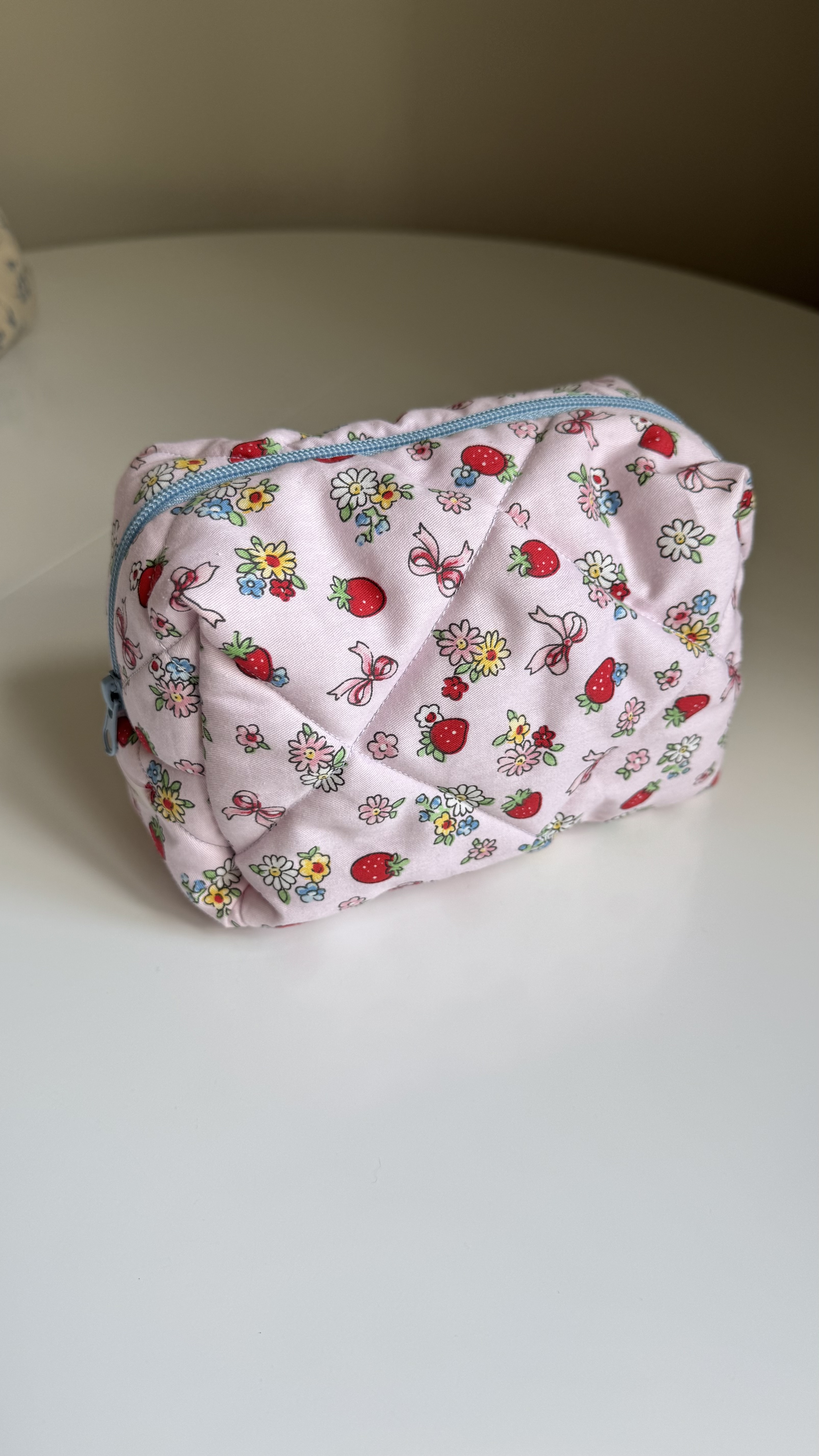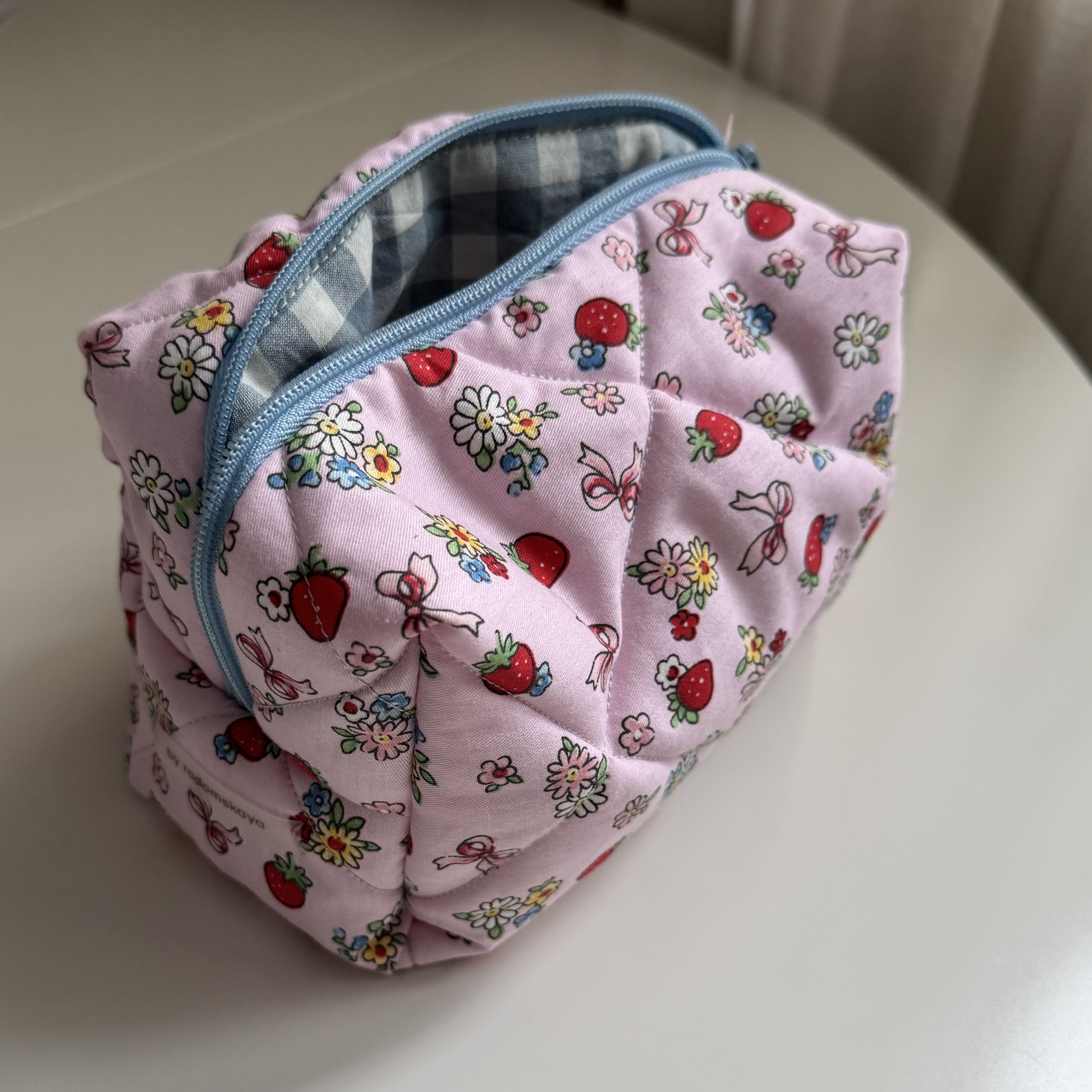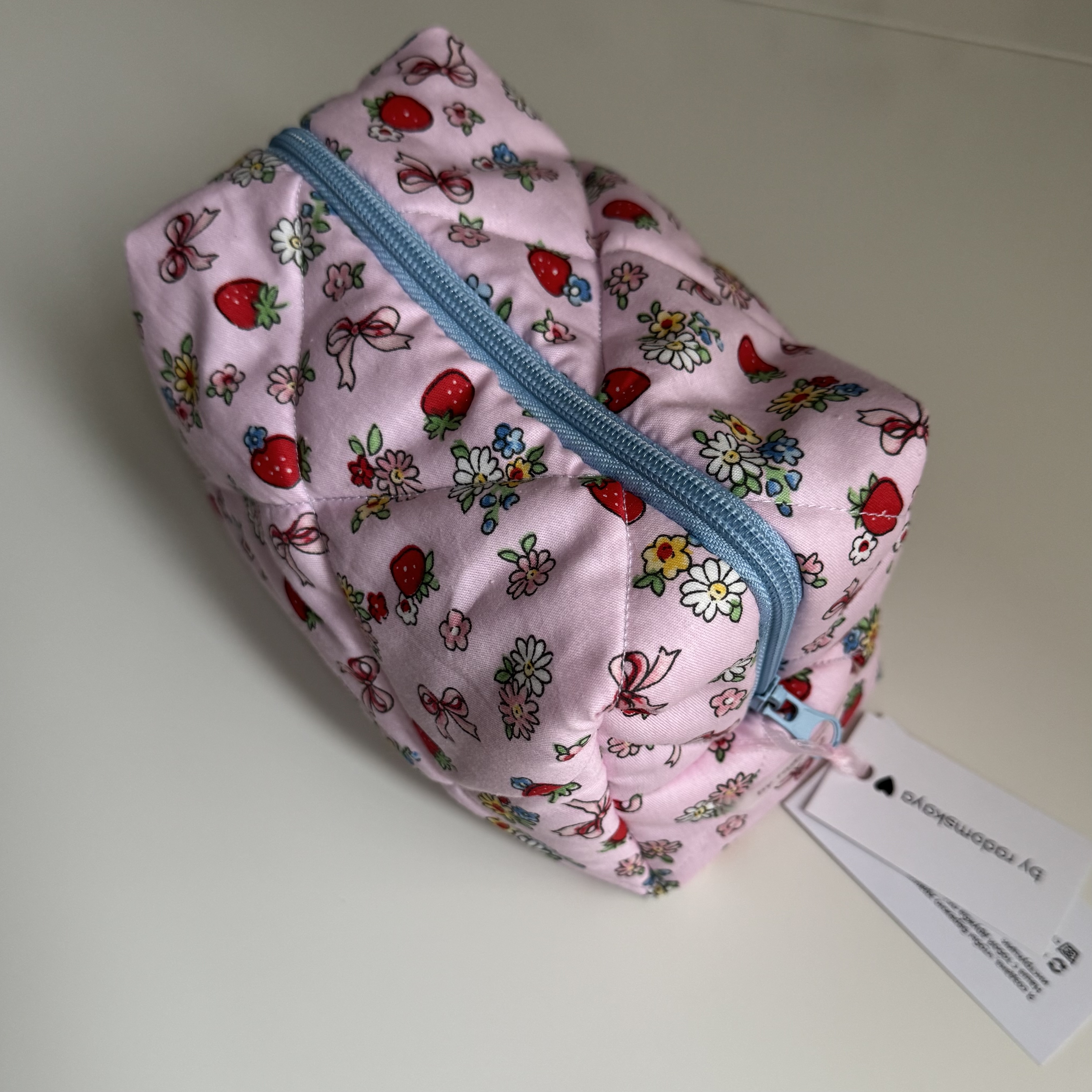Очаровательная косметичка, созданная мастером By_Radomskaya из Нижнего Новгорода. Милый принт с ромашками и клубничкой дарит настроение, а объёмная форма делает её особенно удобной для хранения.