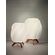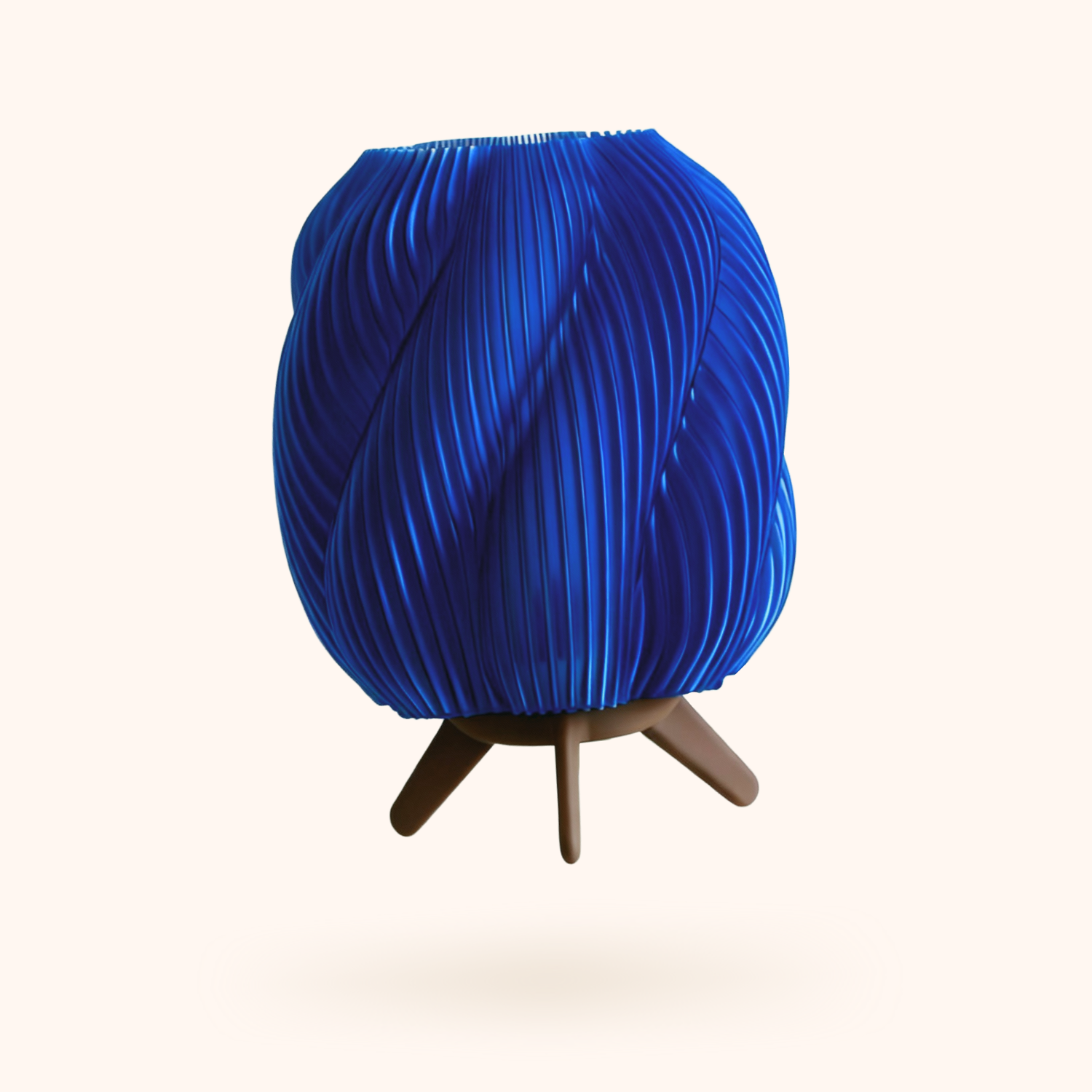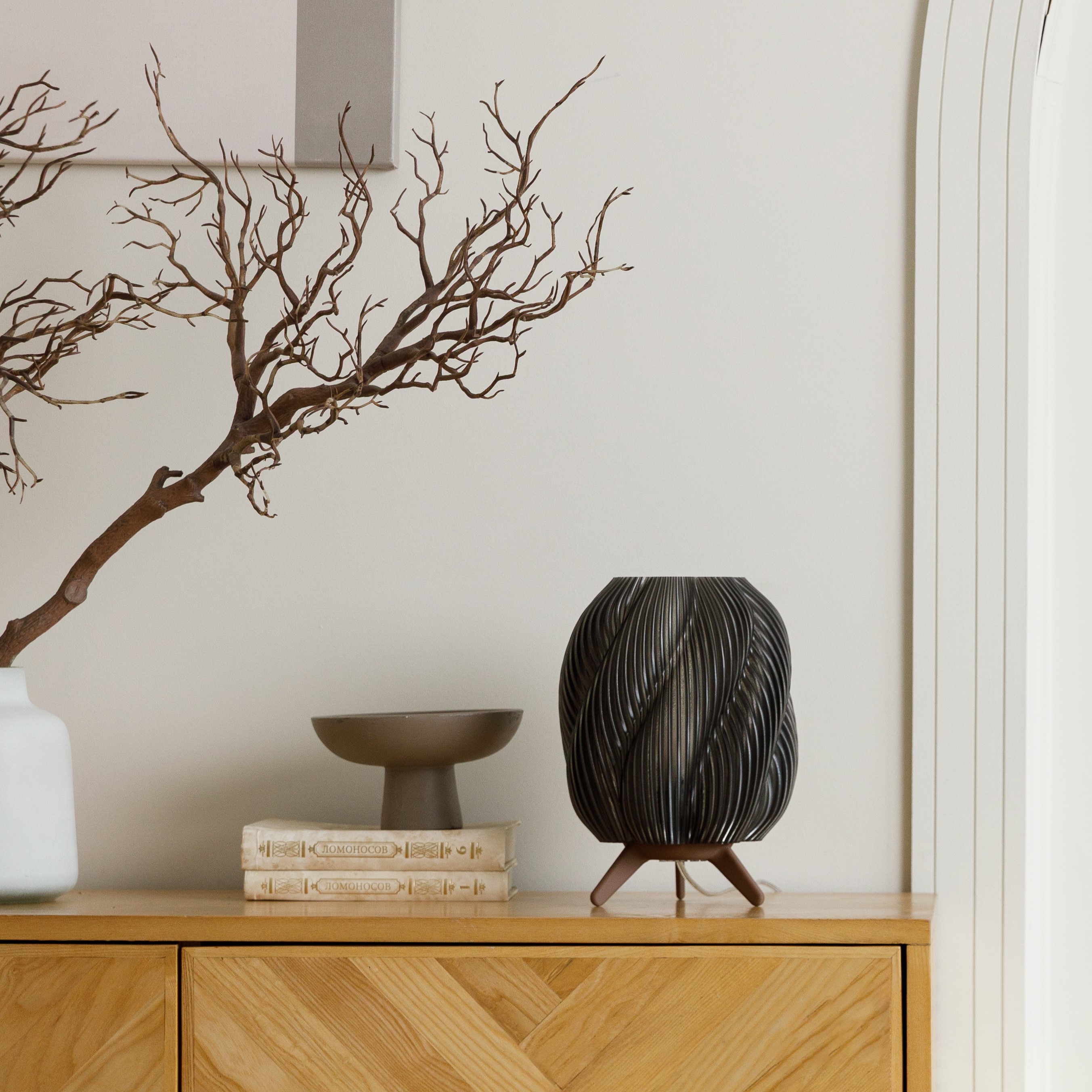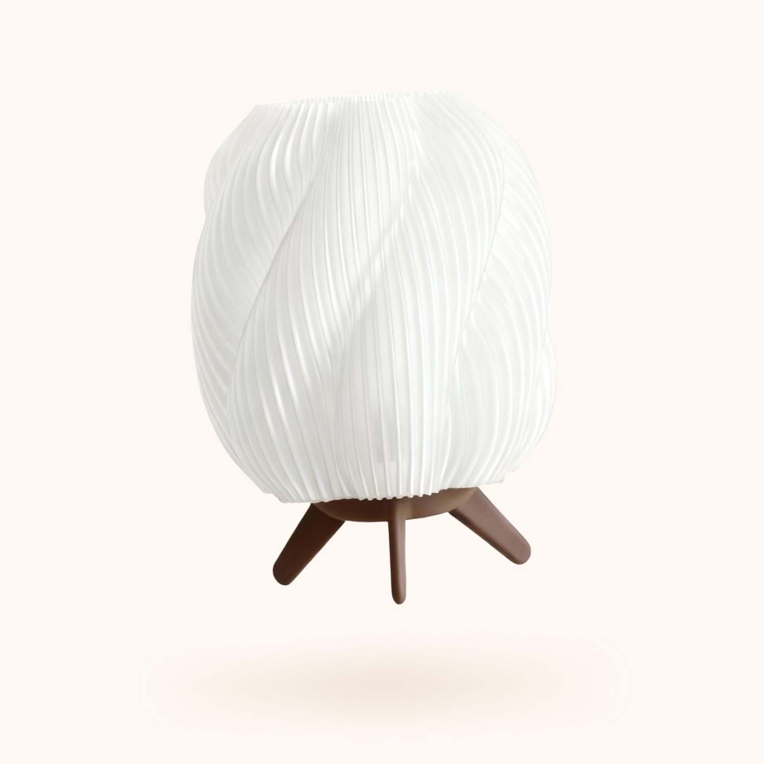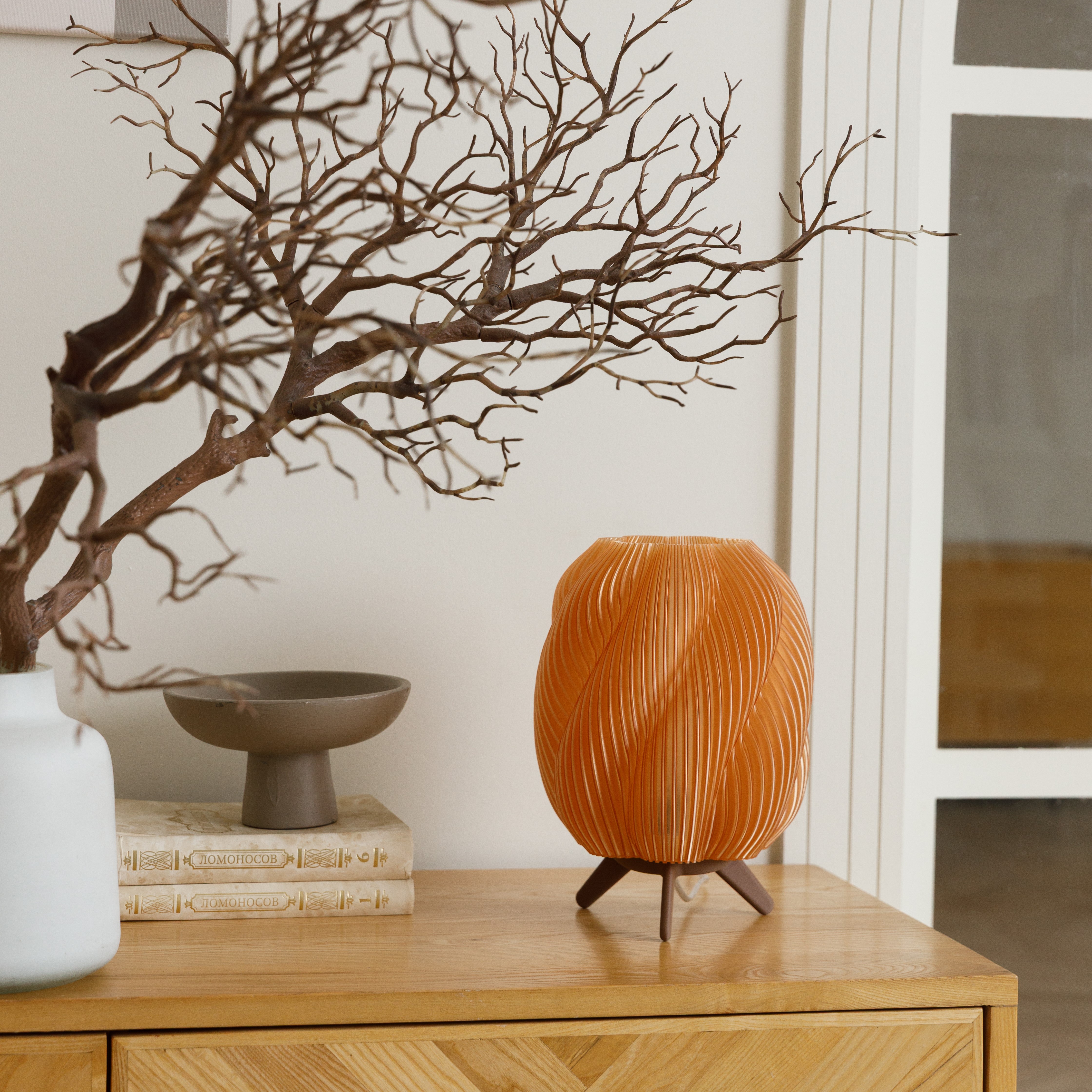 Ее плафон изготовлен из экологически чистого пластика методом многослойной печати, прочный, но в то же время гибкий. Ножки мы сделали из кукурузного пластика с включением дерева и добавили в сердцевину лампу с теплым рассеянным светом.