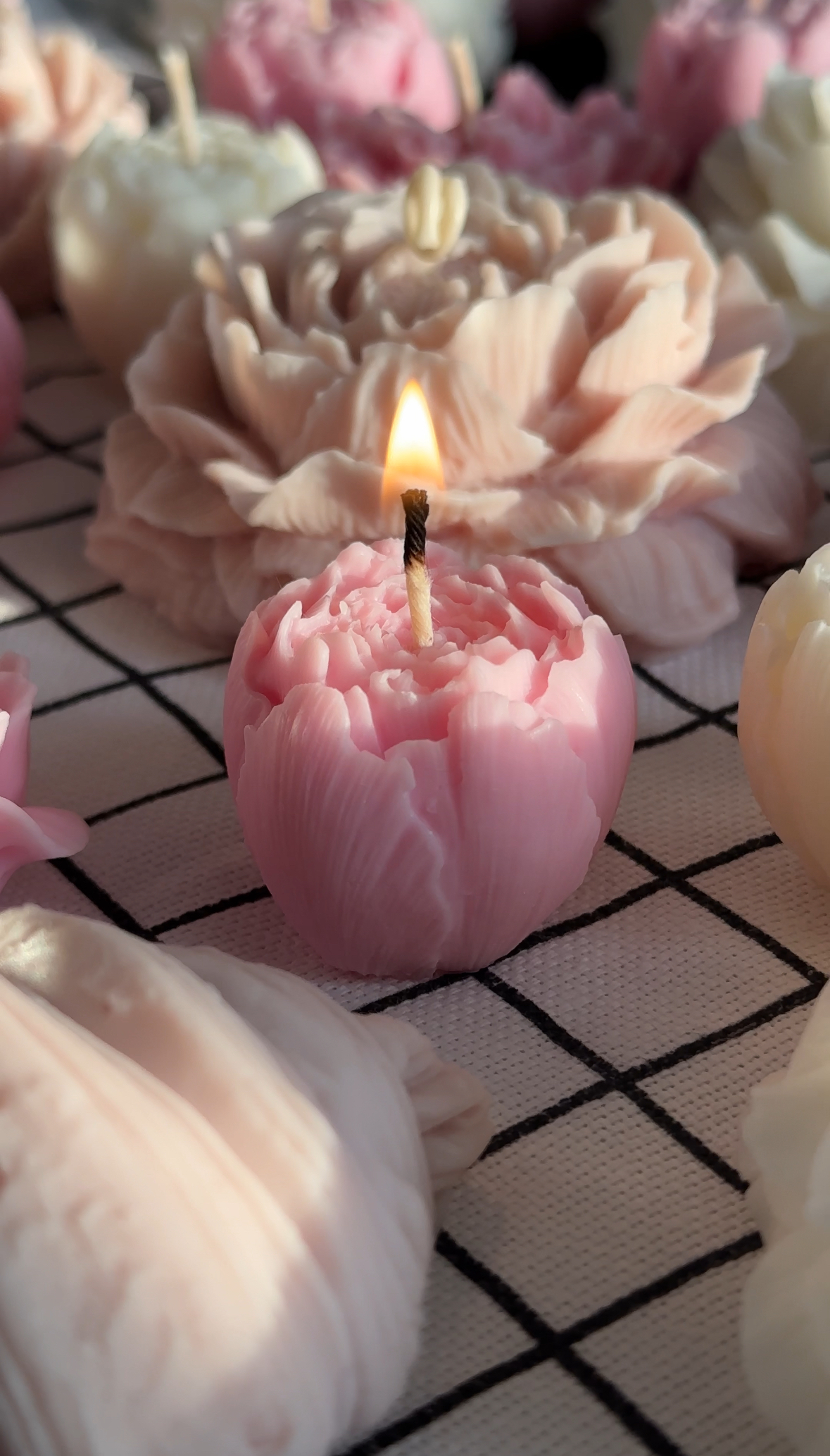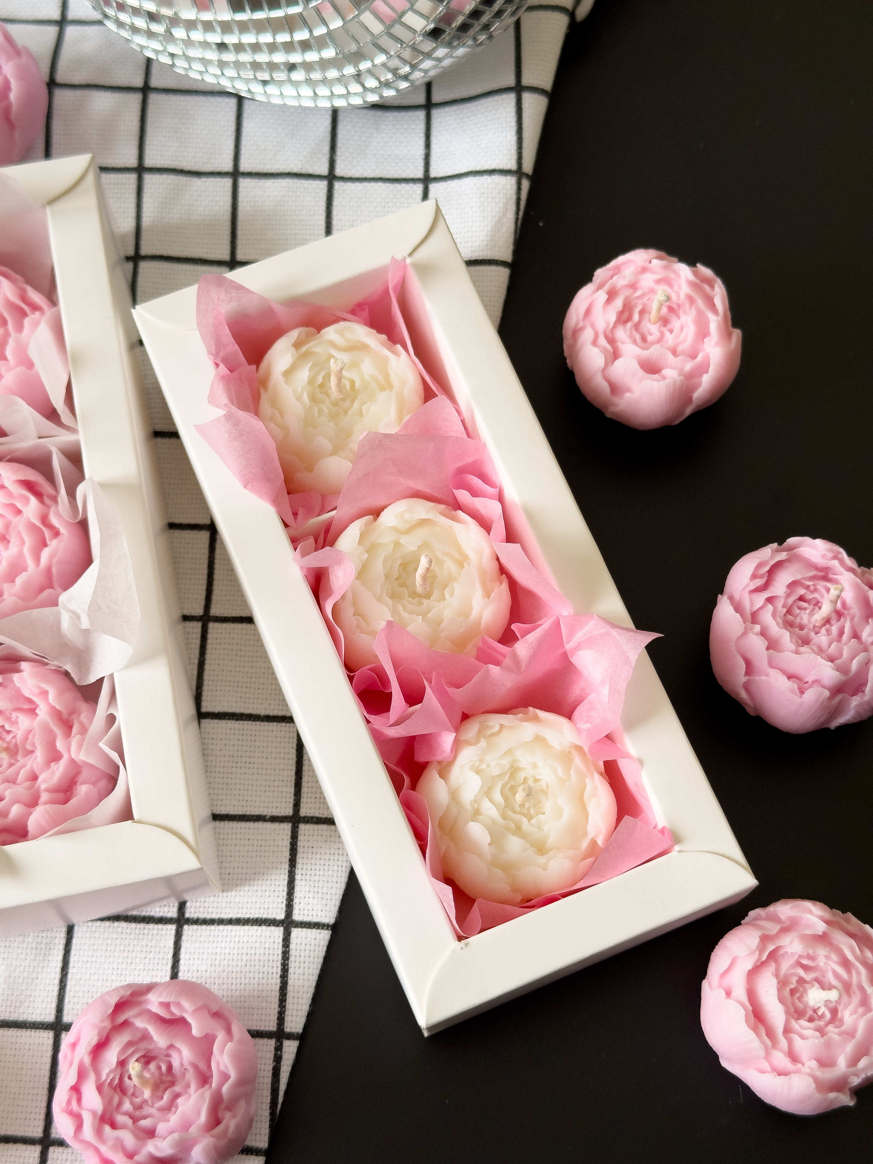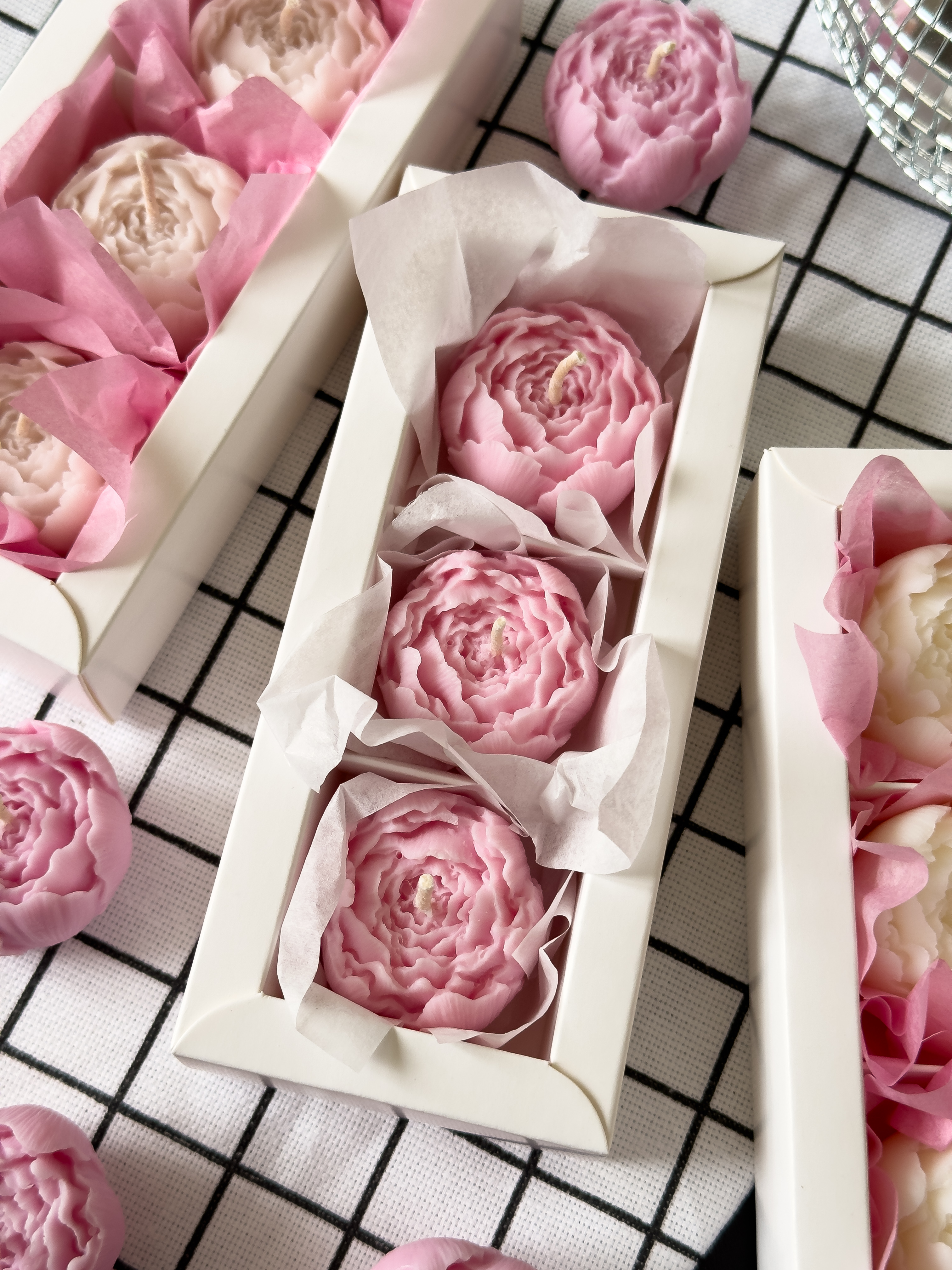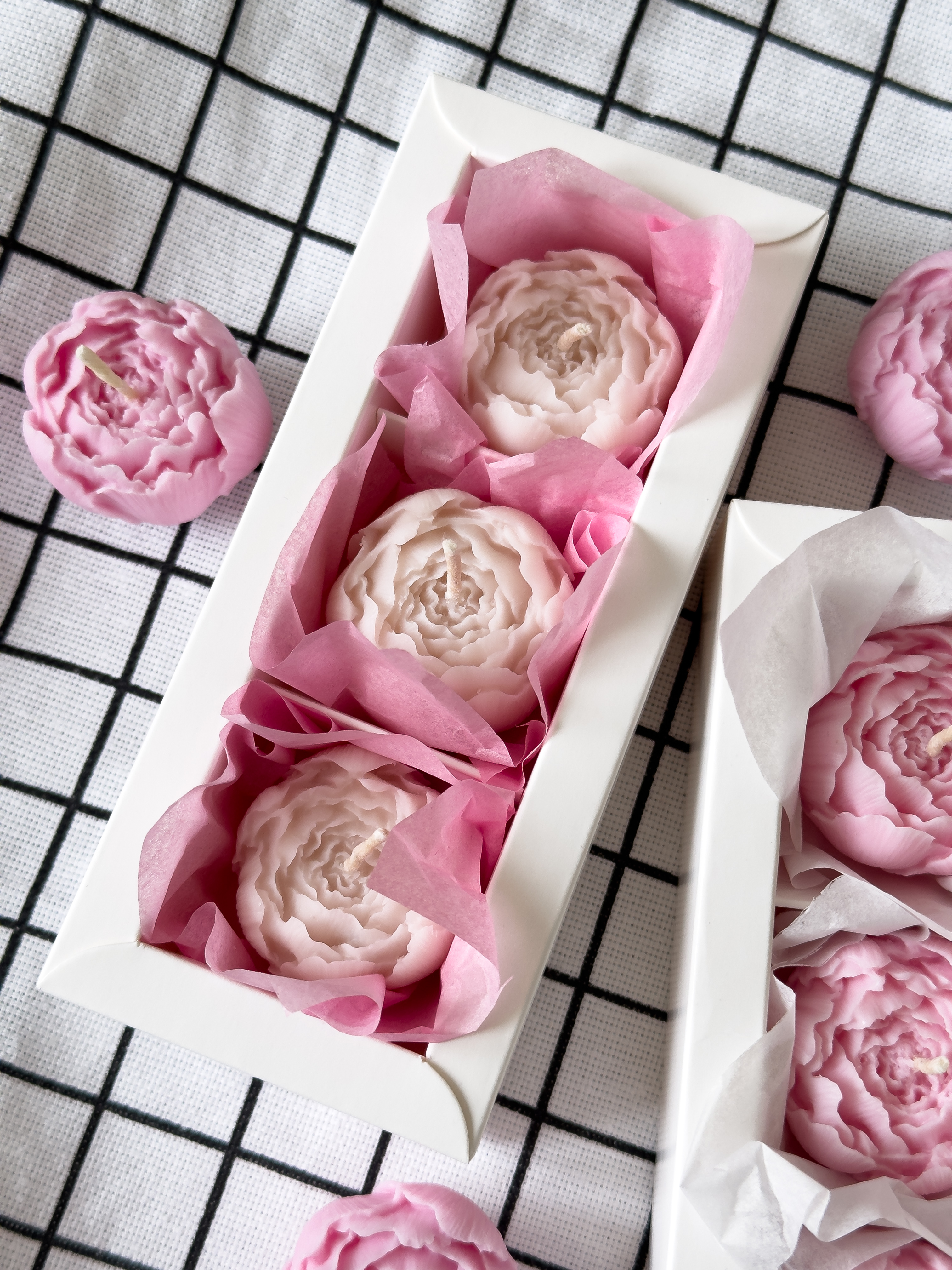 Невероятно красивый набор свечей ручной работы в виде пиона из натурального пчелиного воска. Свечи идут в красивой фирменной упаковке (последнее фото), в подарок спички.