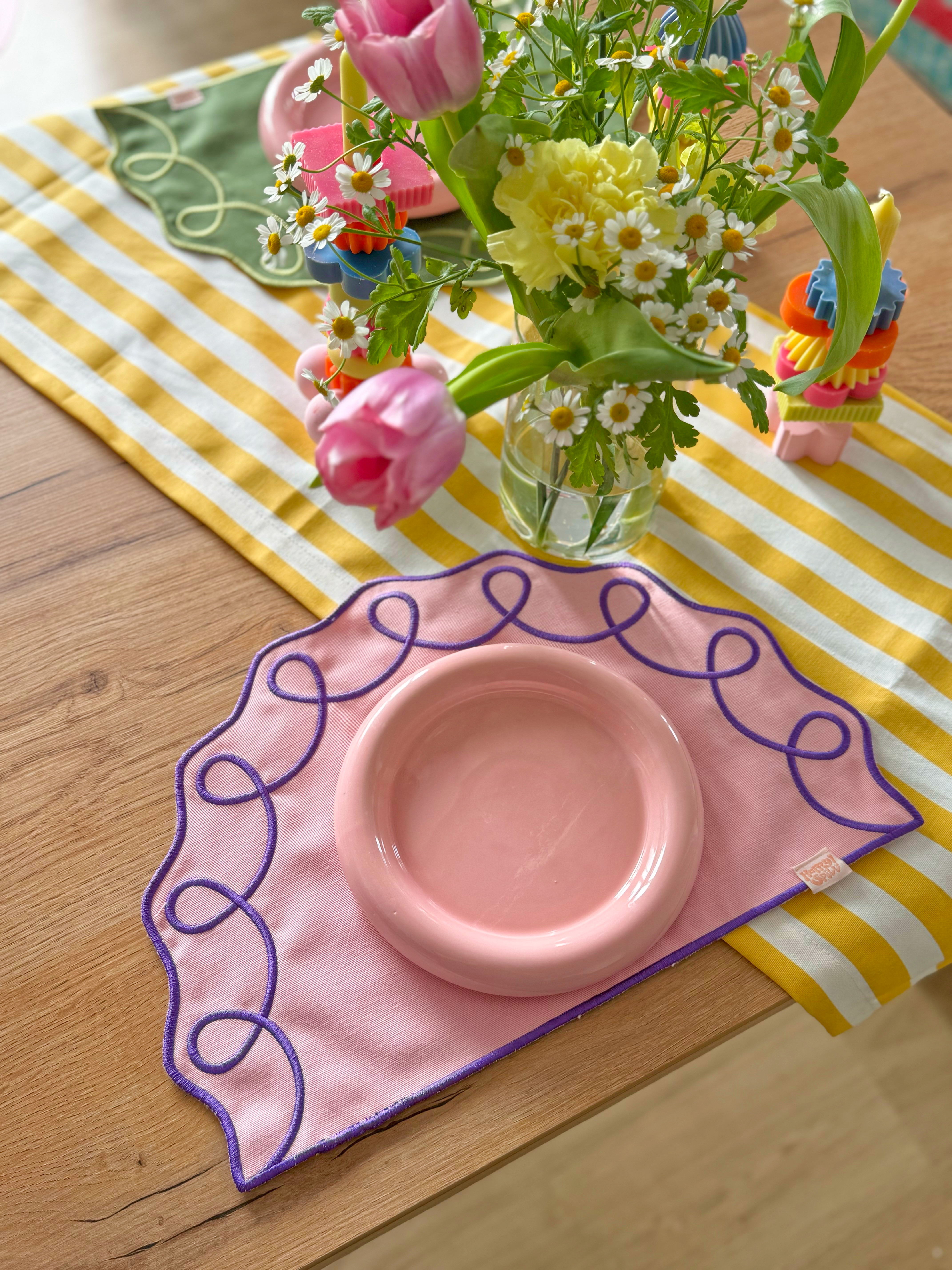 Трендовая салфетка для сервировки стола с вышивкой. Нежного лилового оттенка с фиолетовой вышивкой.