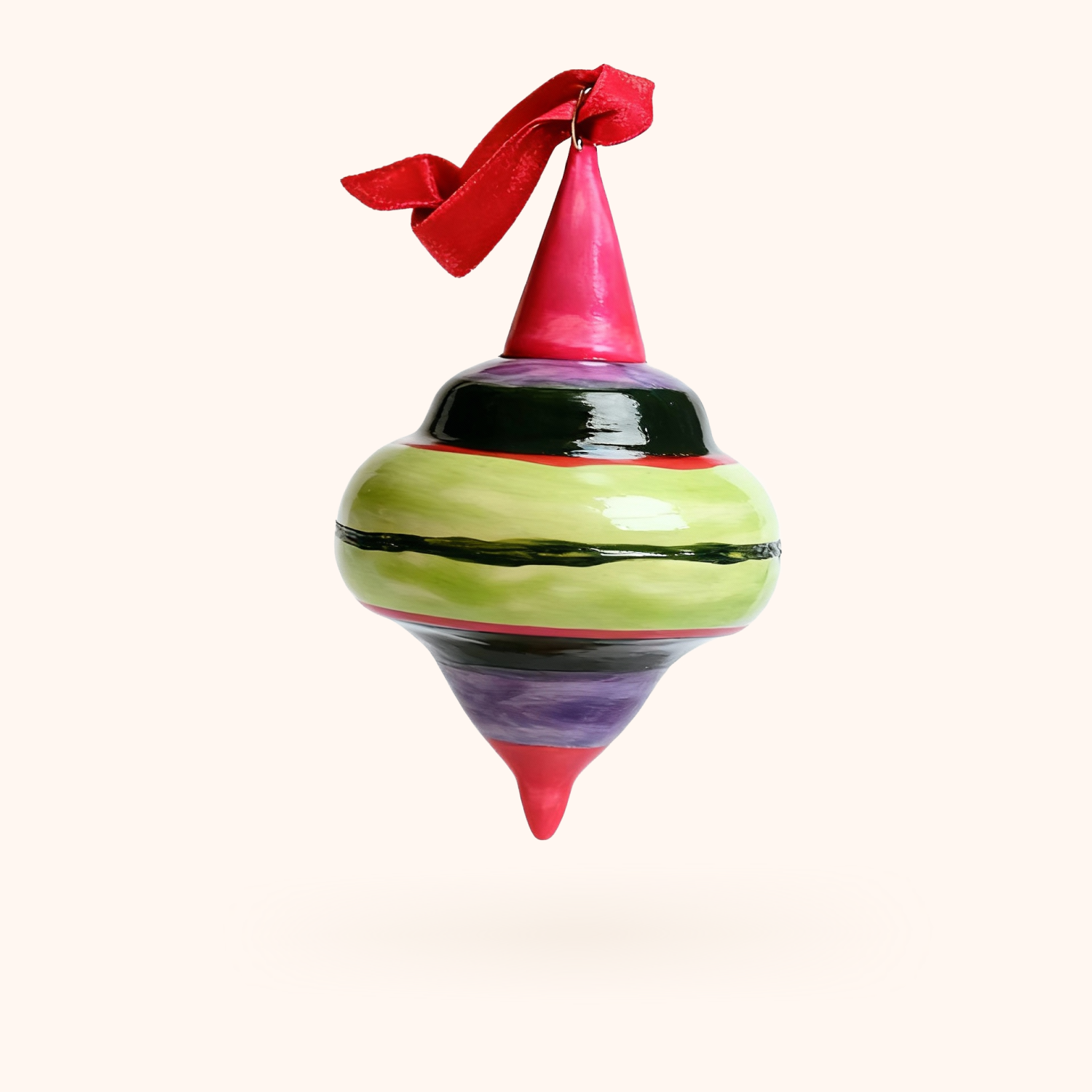 Та самая яркая, звонкая юла, с которой играли часами, теперь превратилась в изящное елочное украшение, полностью выполненное вручную из тонкого фарфора.