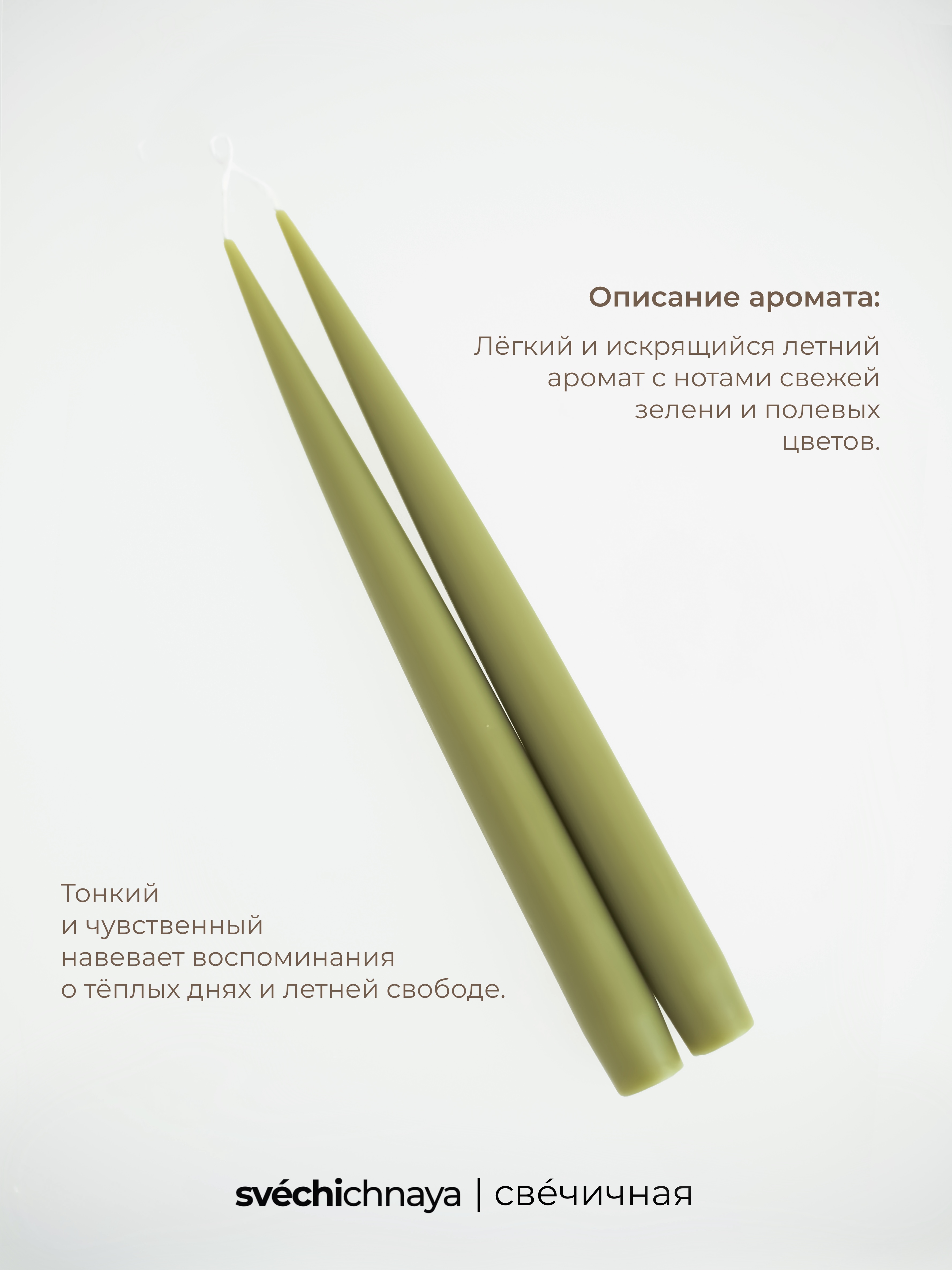 "Скошенная трава", "Сливочное масло", "Первая любовь" и другие — названия отражают конкретные состояния, воспоминания и эмоции, а цвет и аромат каждой свечи подобран так, чтобы поддержать это ощущение.