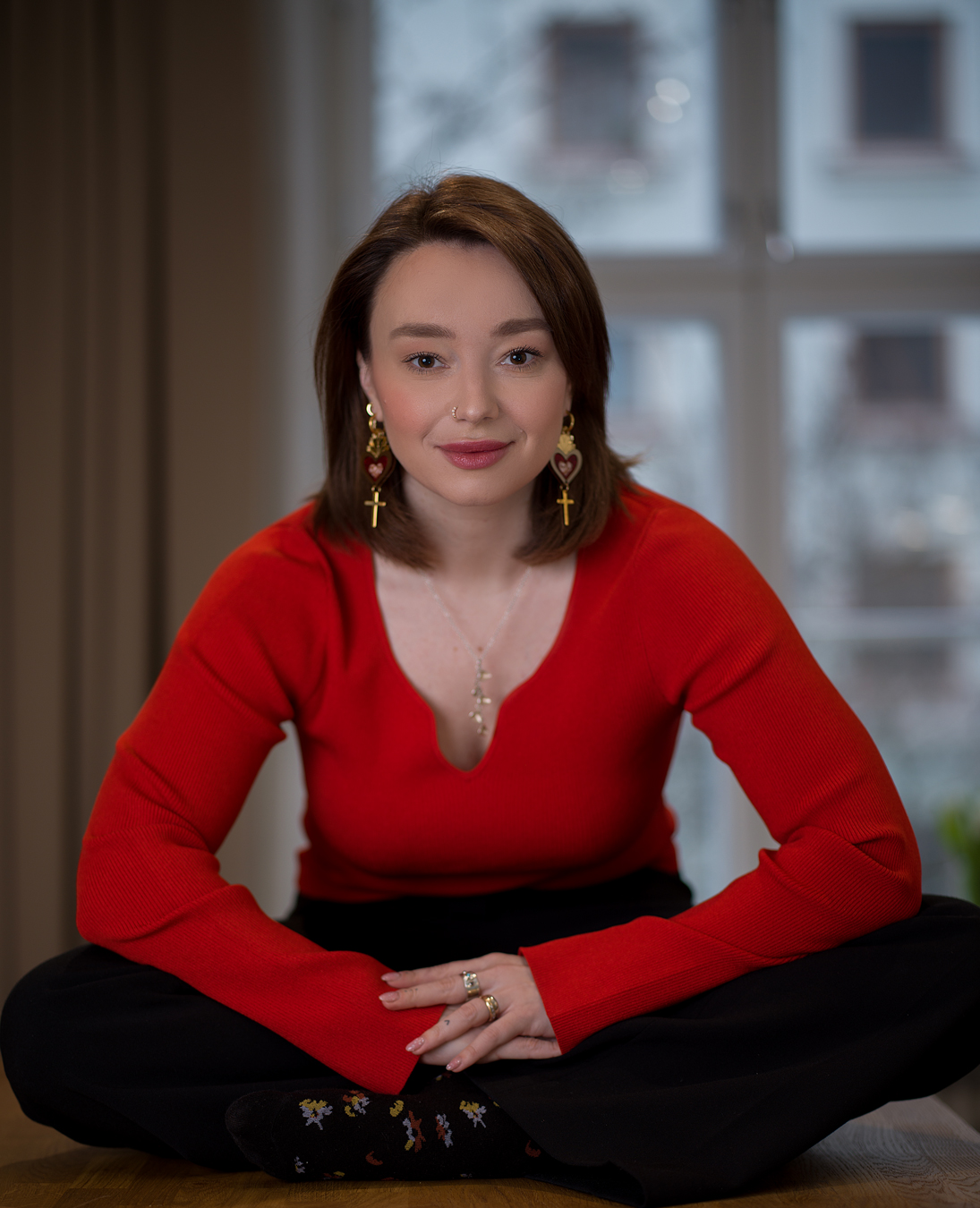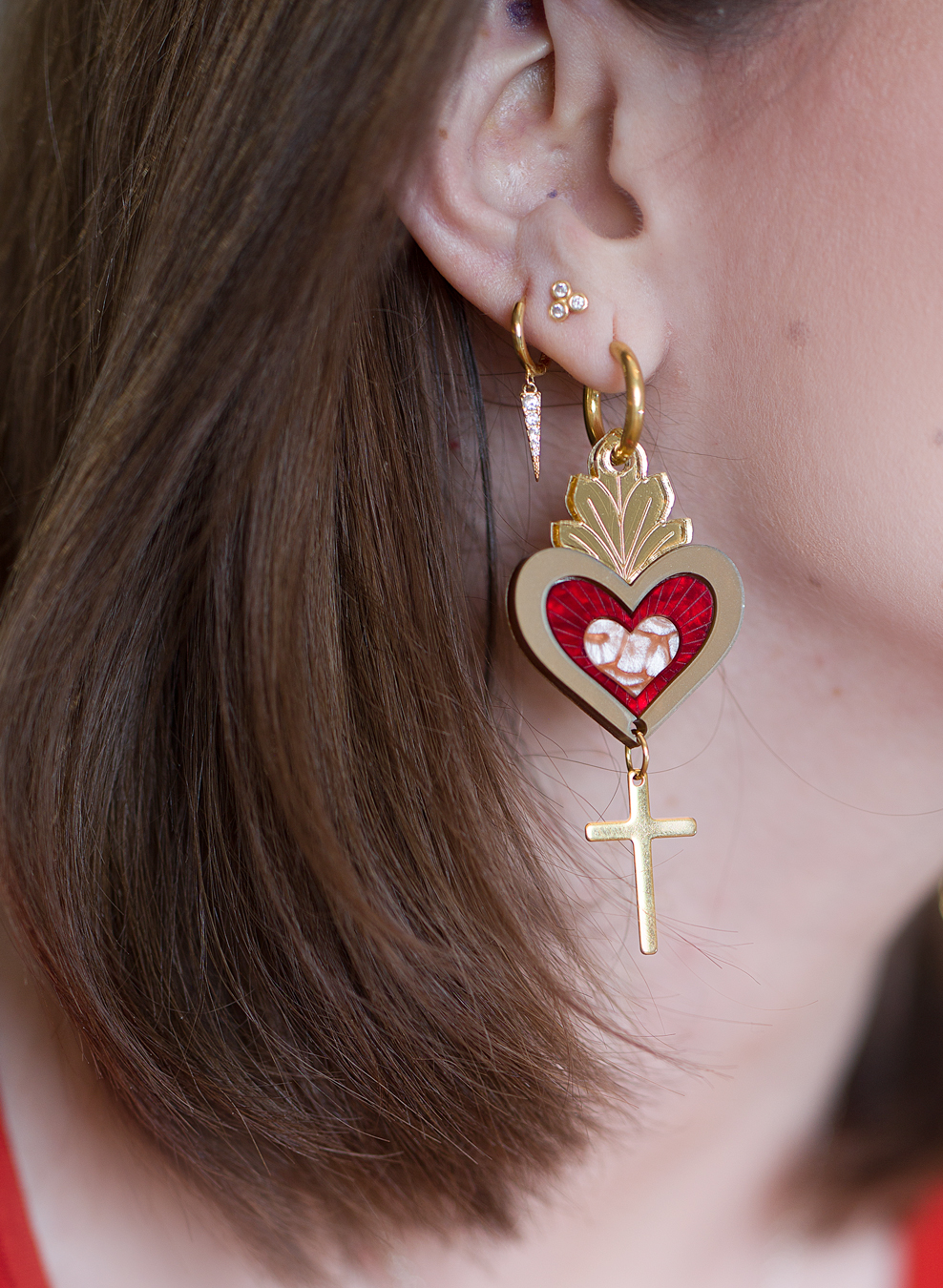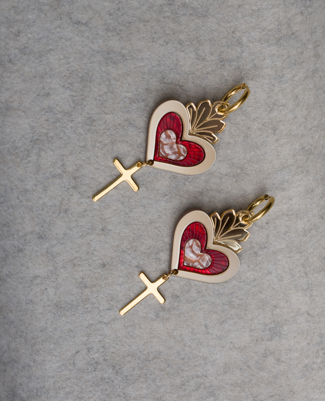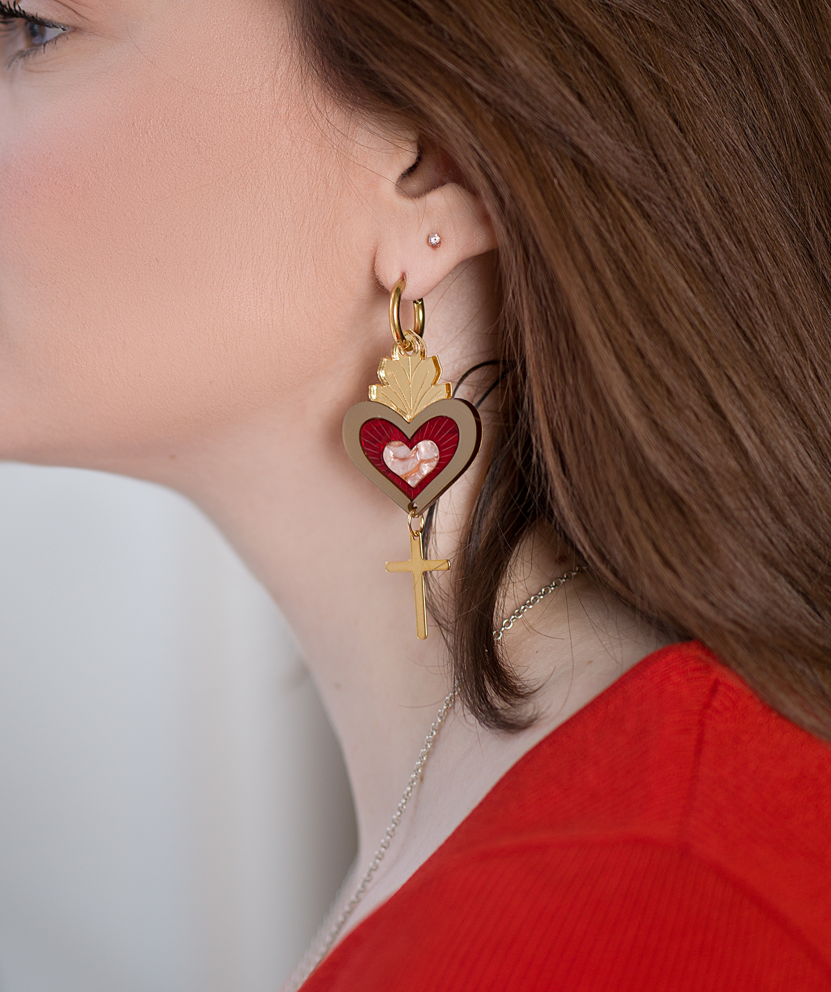 Контрастное алое сердце, золотые лучи и лаконичный крест создают выразительный, запоминающийся силуэт. Это заметный акцент, который собирает образ — от белой рубашки до чёрного платья.