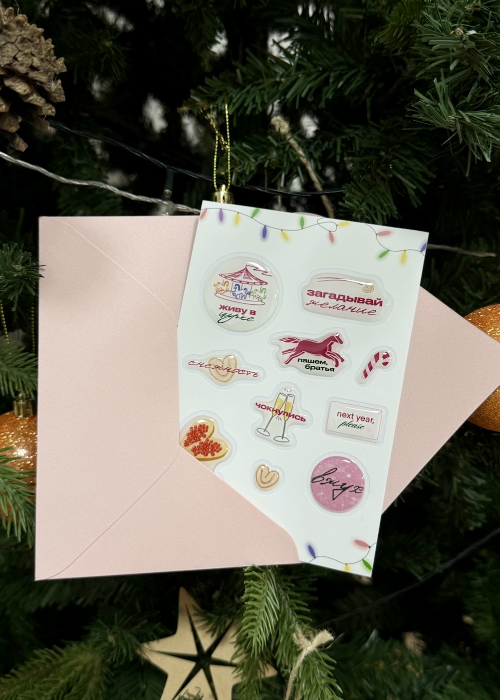 Каждый стикерпак кладем в красивый подарочный конверт. При необходимости можем подписать открыточку.