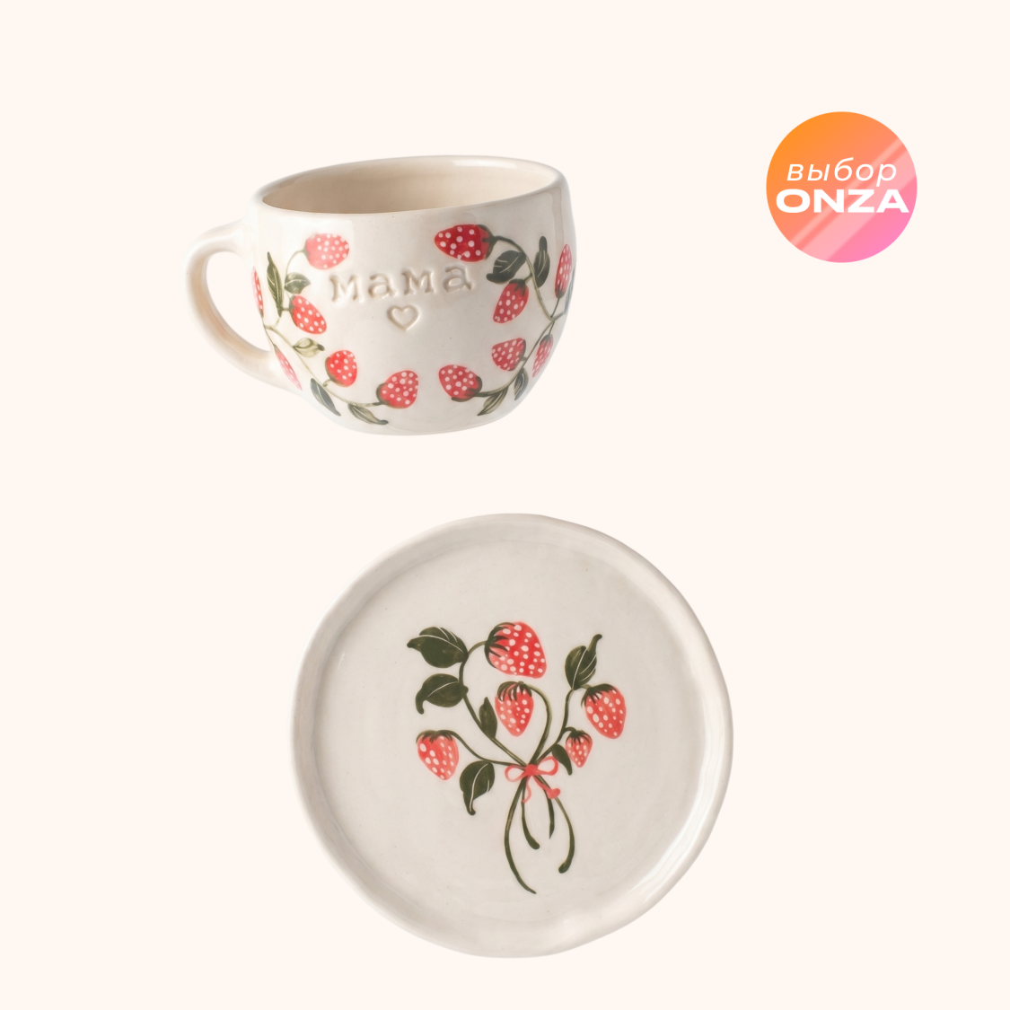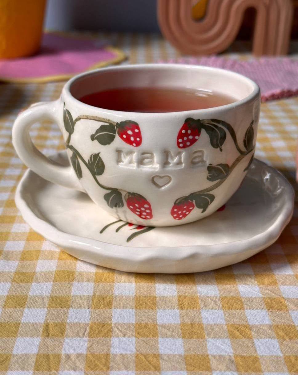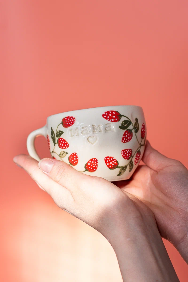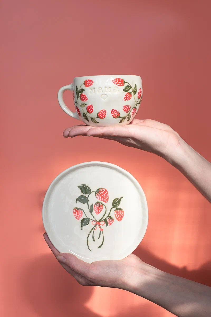 Чайная пара ручной работы с клубникой и именной надписью. Каждое чаепитие с этой парой становится маленьким объятием. Подарок, который согревает.