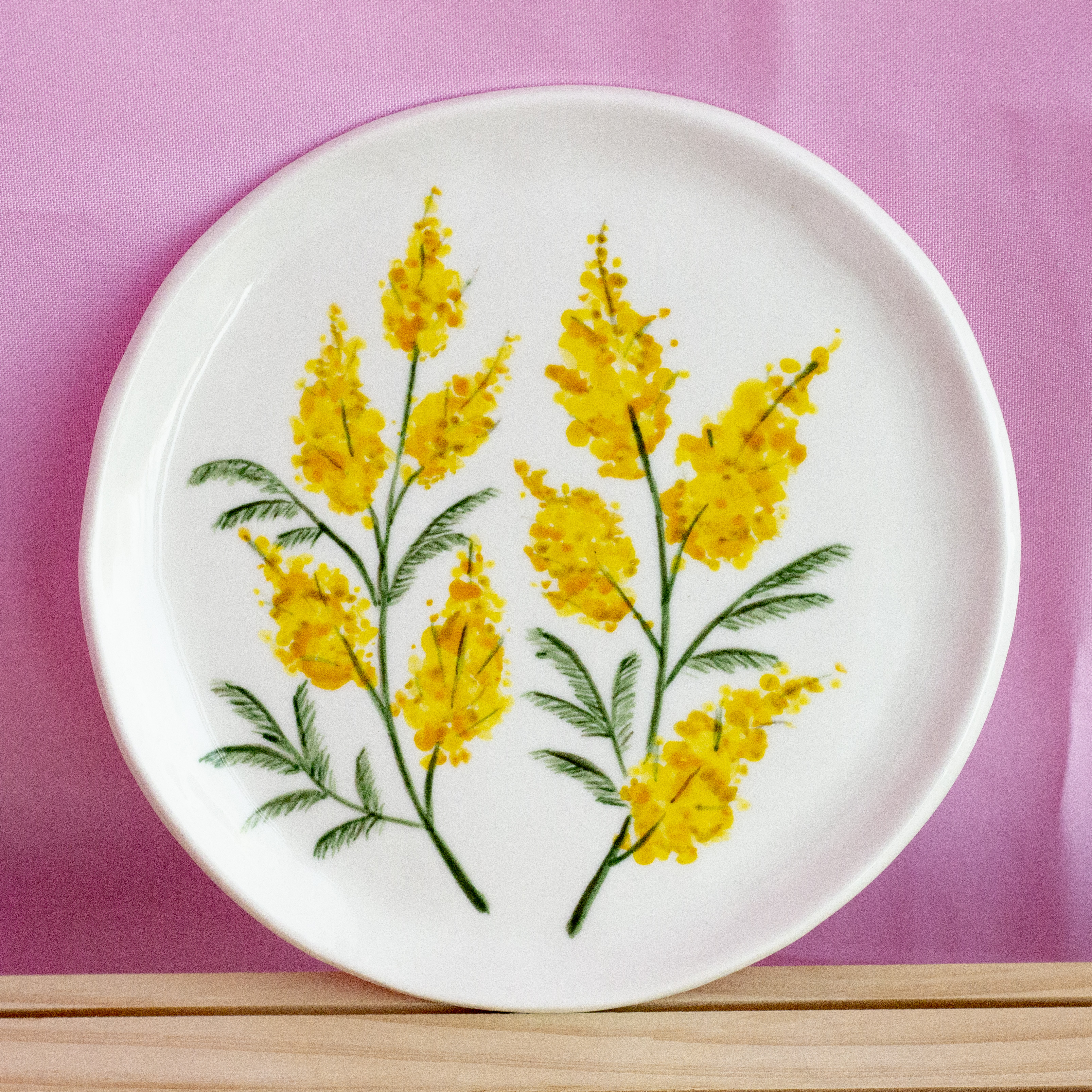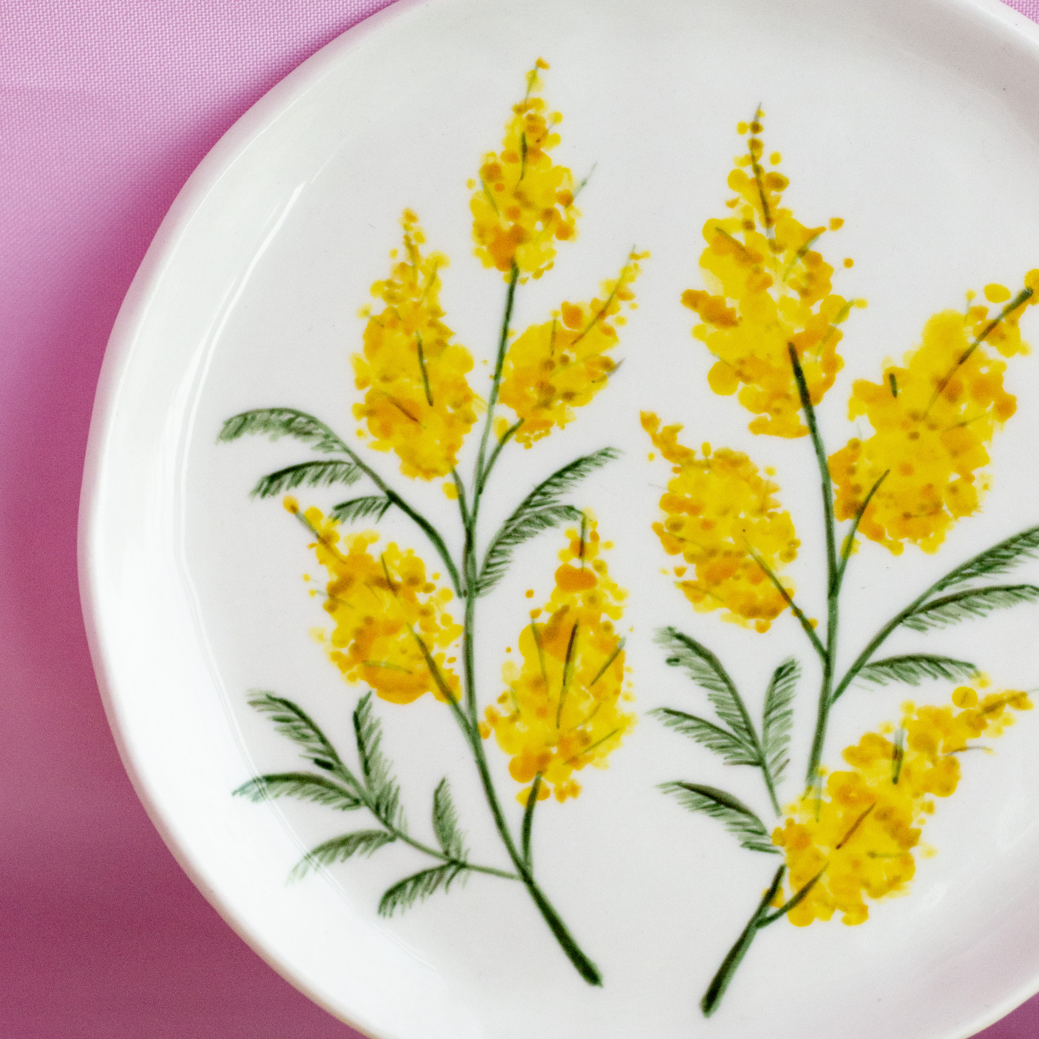 Фарфоровая тарелка ручной работы. Рисунок в виде мимозы нарисован подглазурными красками, сверху тарелка покрыта прозрачной глазурью.