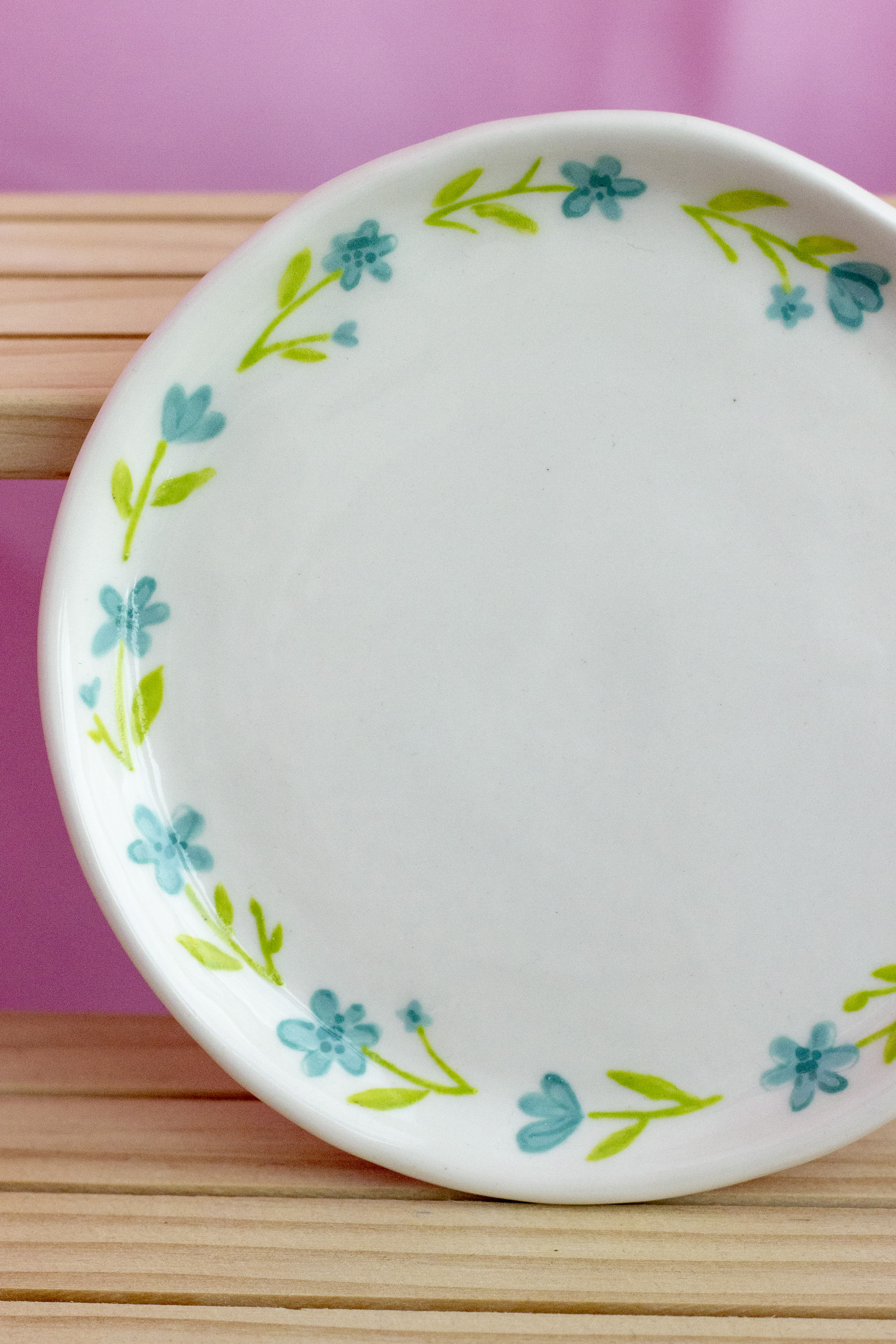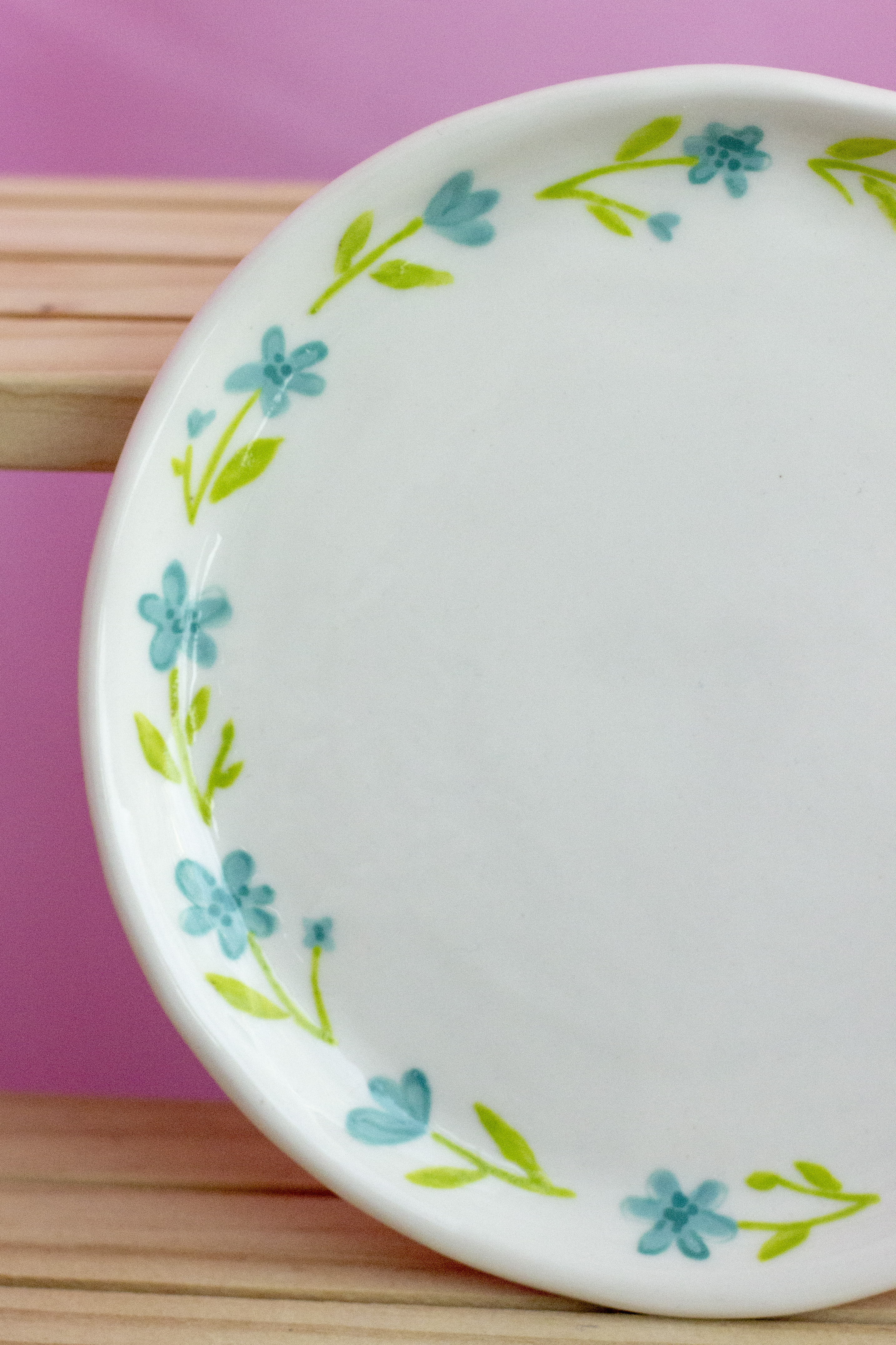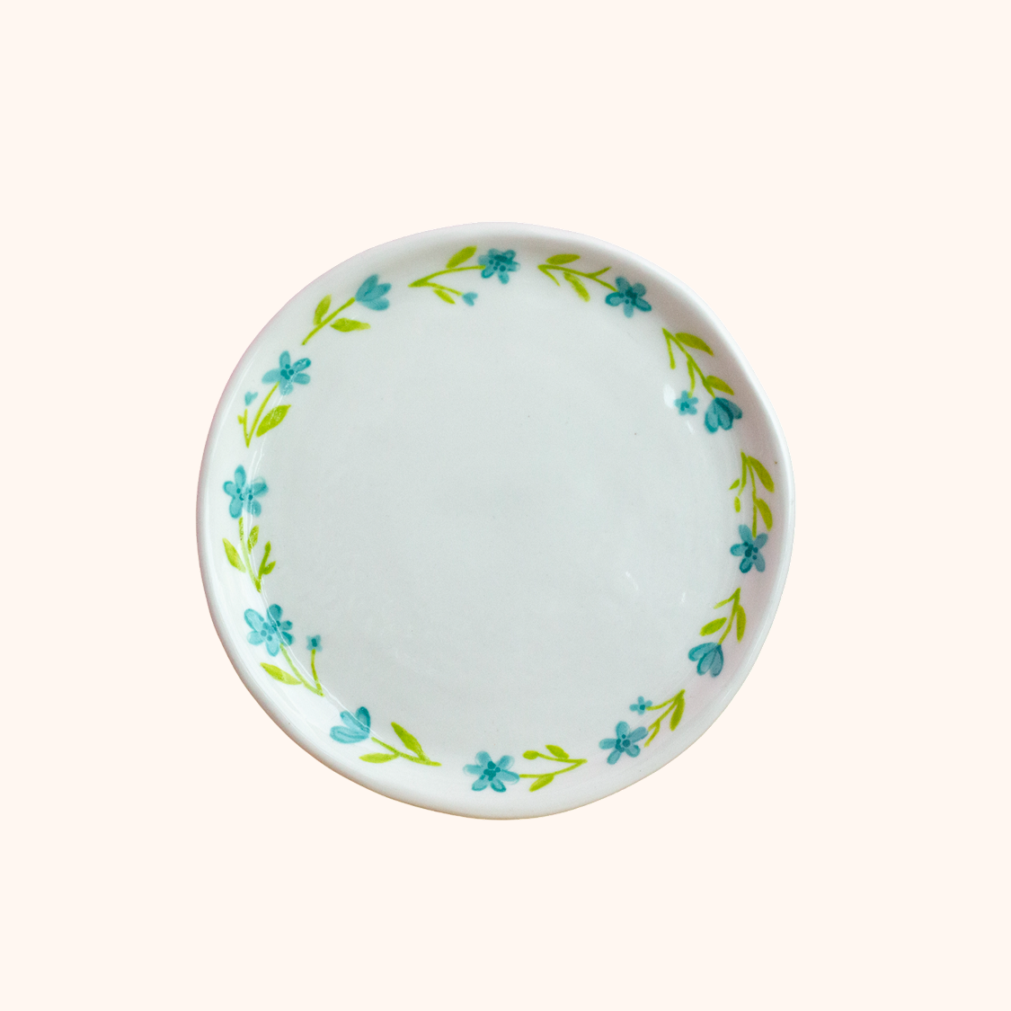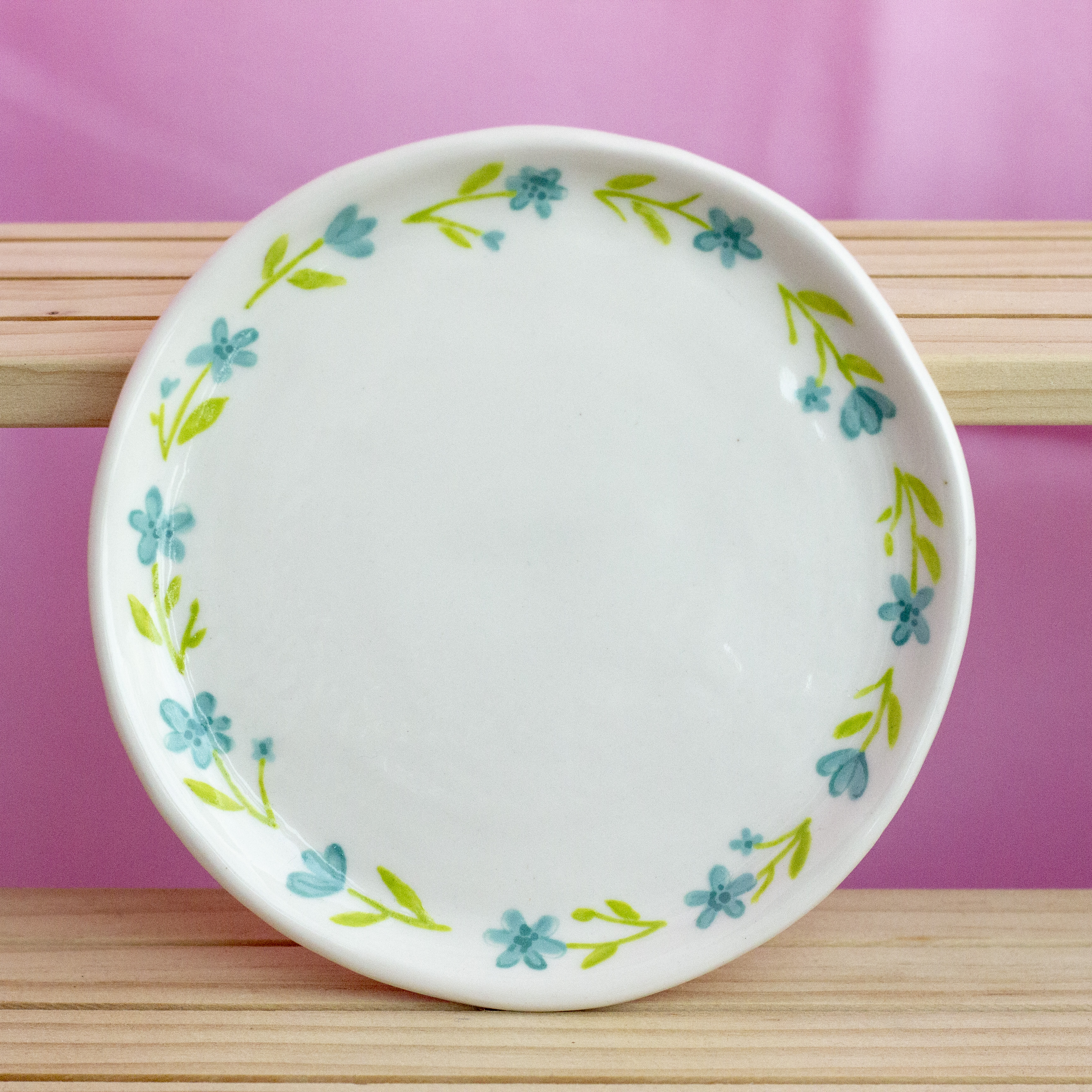Фарфоровое блюдце ручной работы. По кайме нарисованы голубые цветы подглазурными красками, сверху тарелка покрыта прозрачной глазурью.