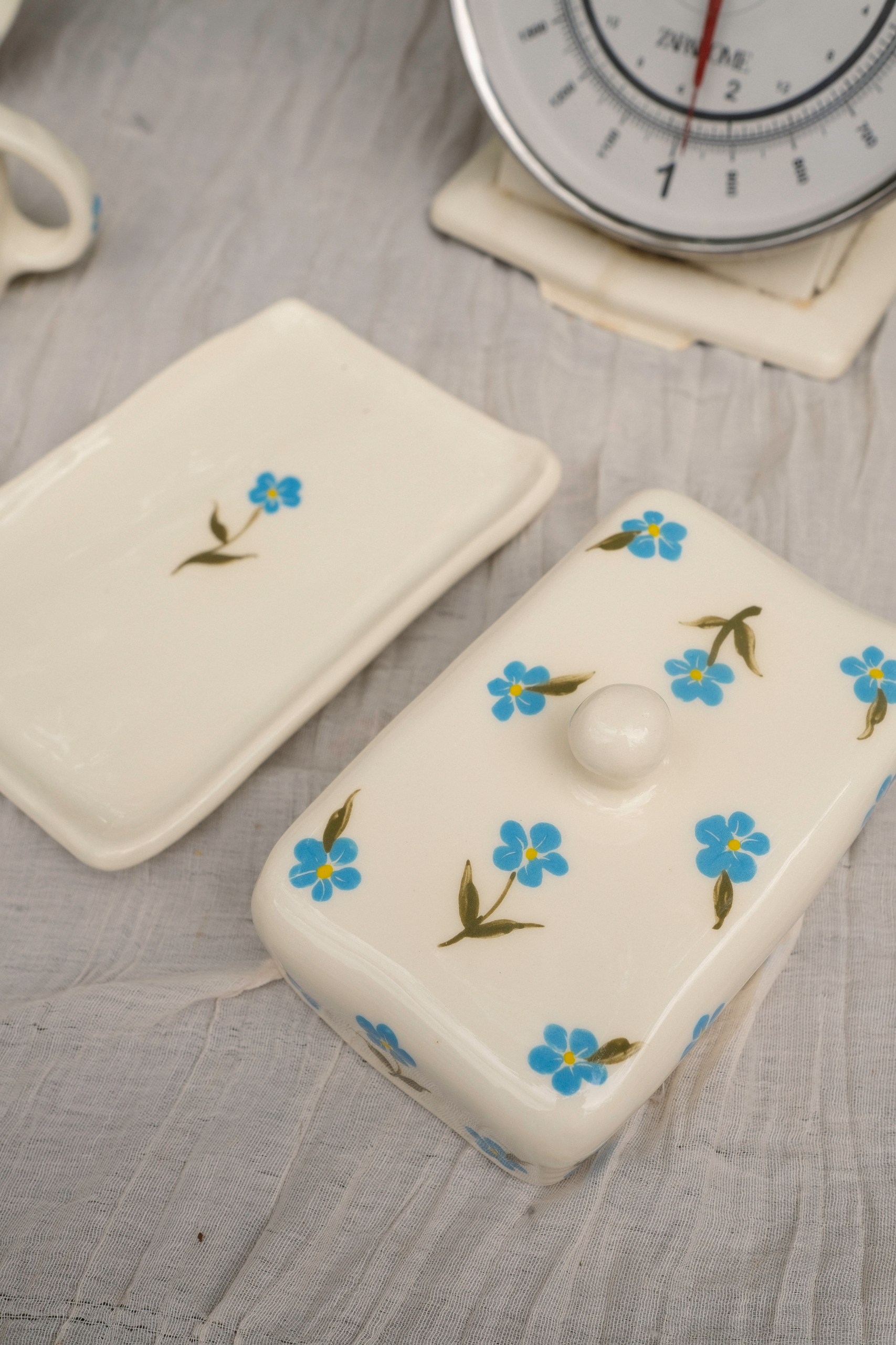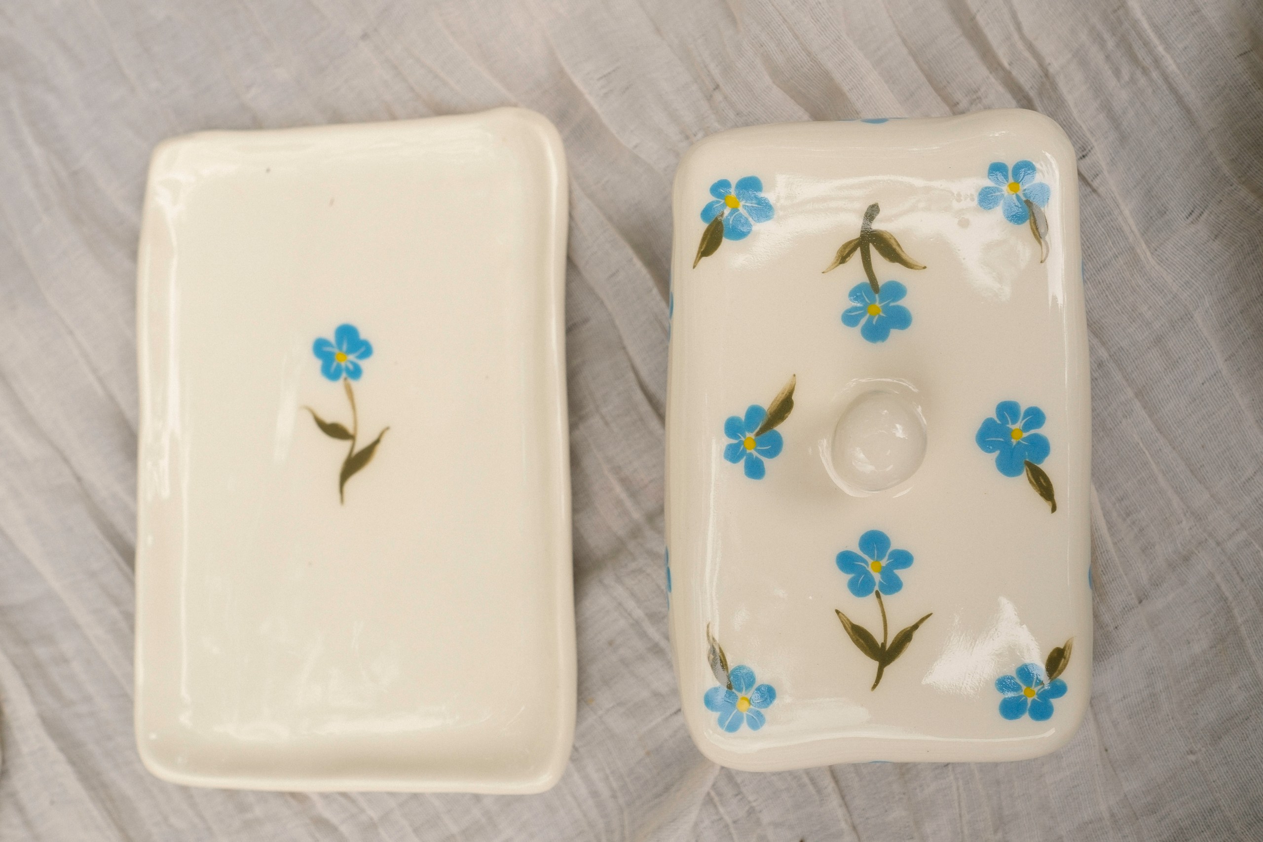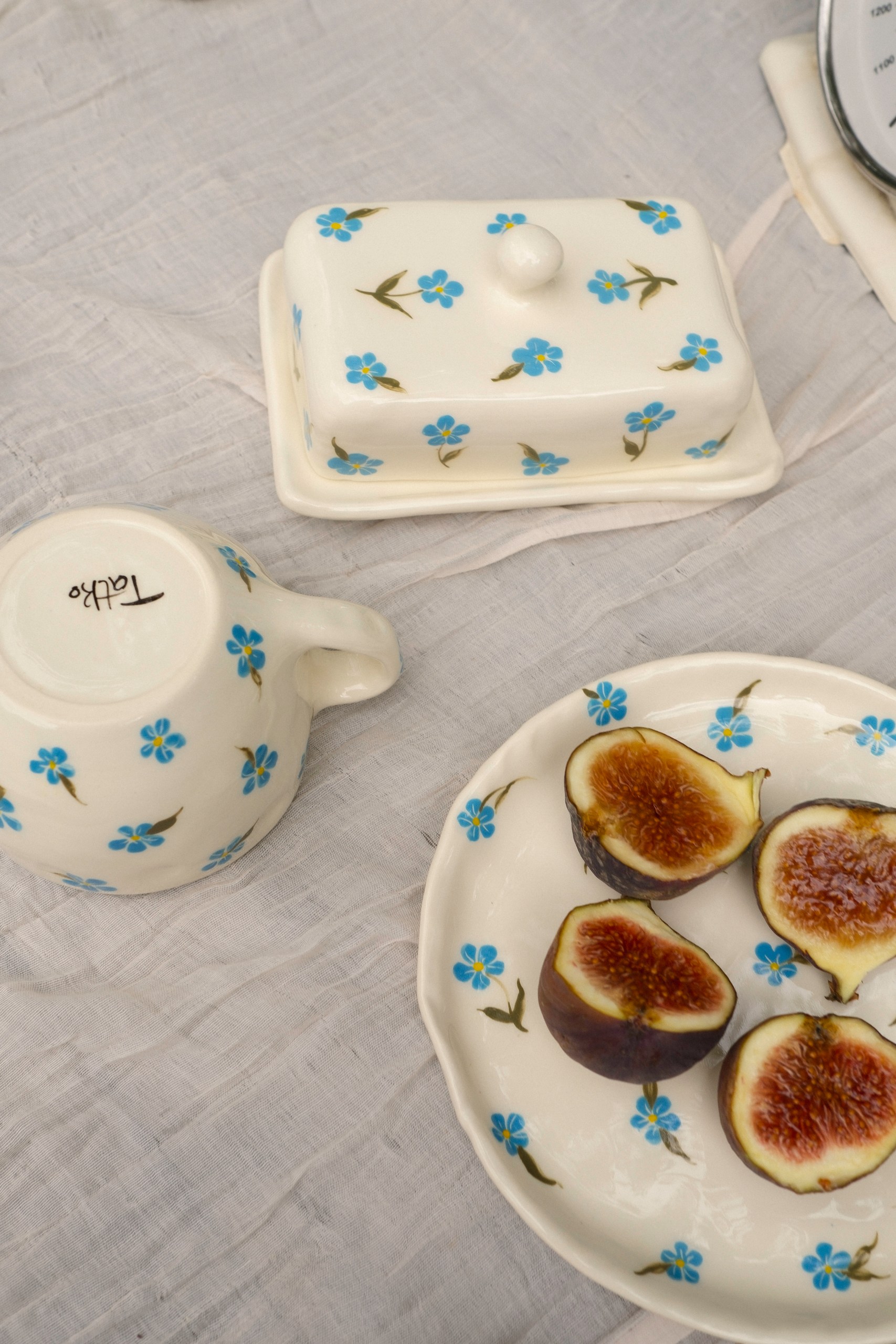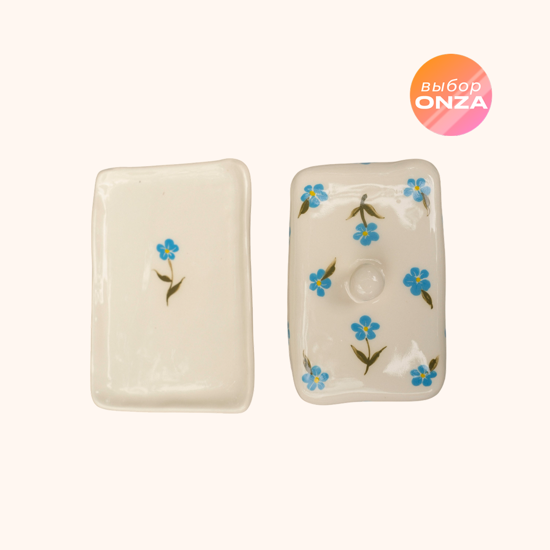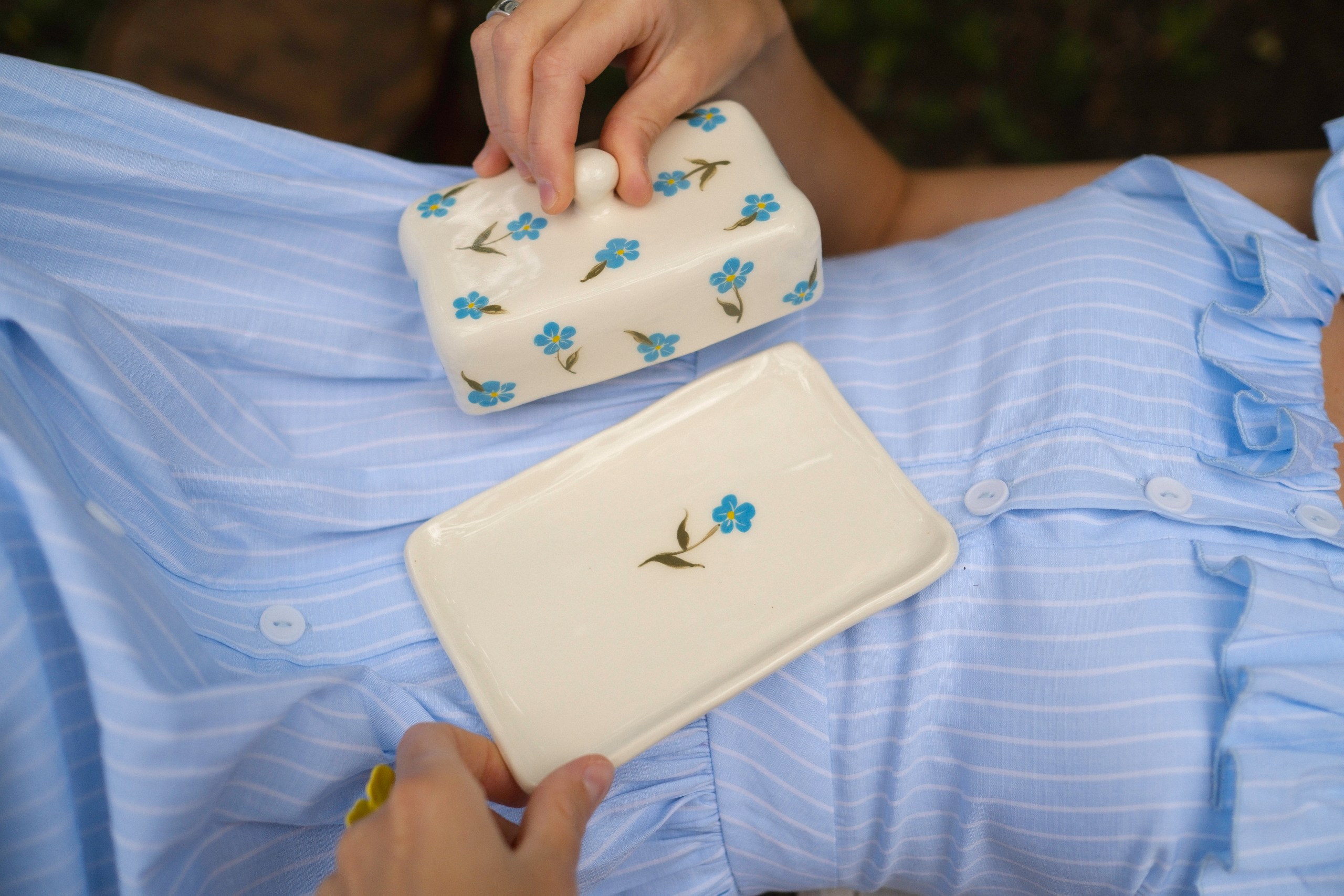Незабудки, символизирующие истинную любовь и воспоминания, вручную нанесены на маслёнку, придавая ей особую значимость и романтизм.