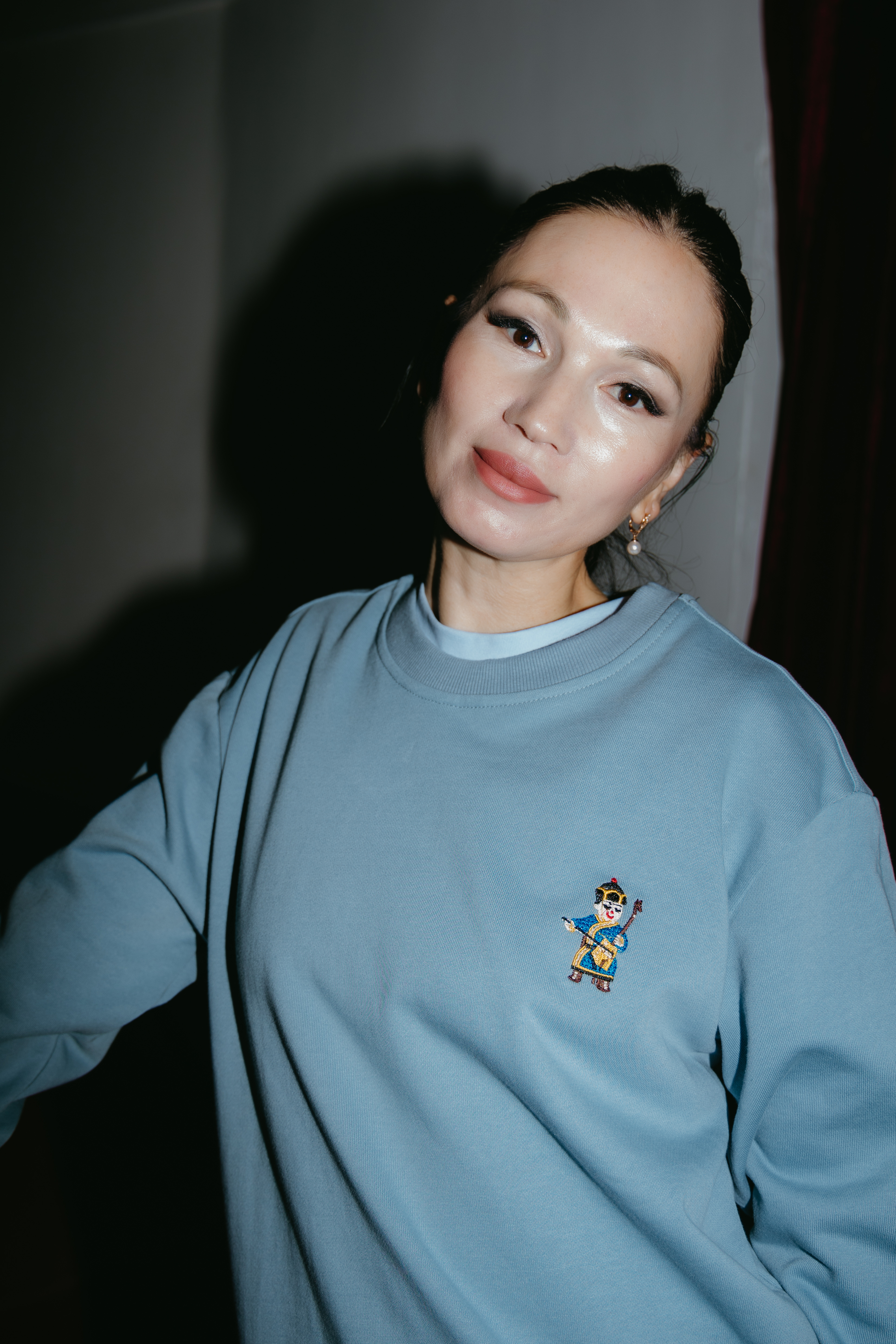 Сильный образ, вдохновлённый тувинской культурой. Свитшот от бренда украшения TUVAN SOUL аккуратной вышивкой хоомейжи (мастер горлового пения) , символа традиций и глубокого национального звучания.