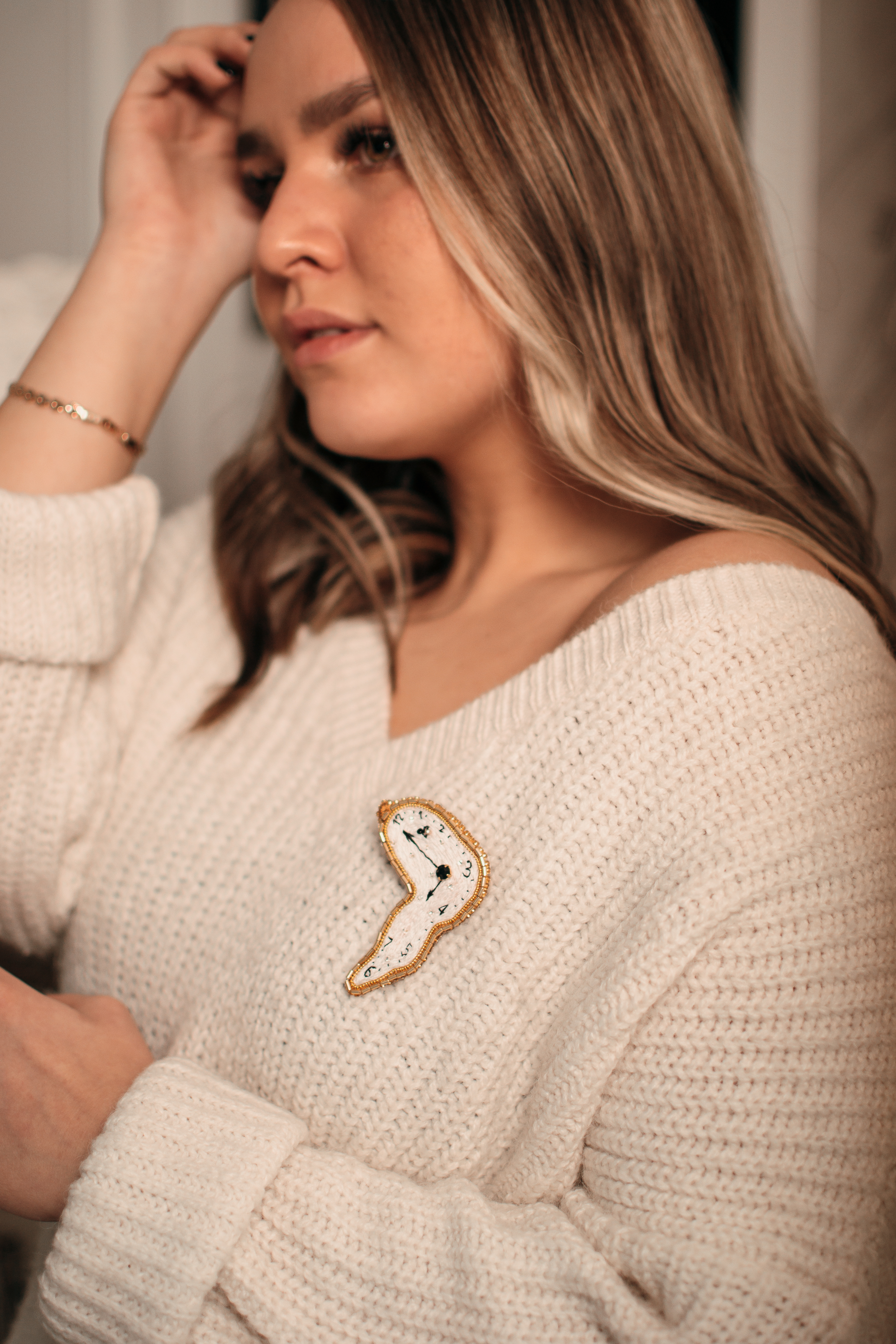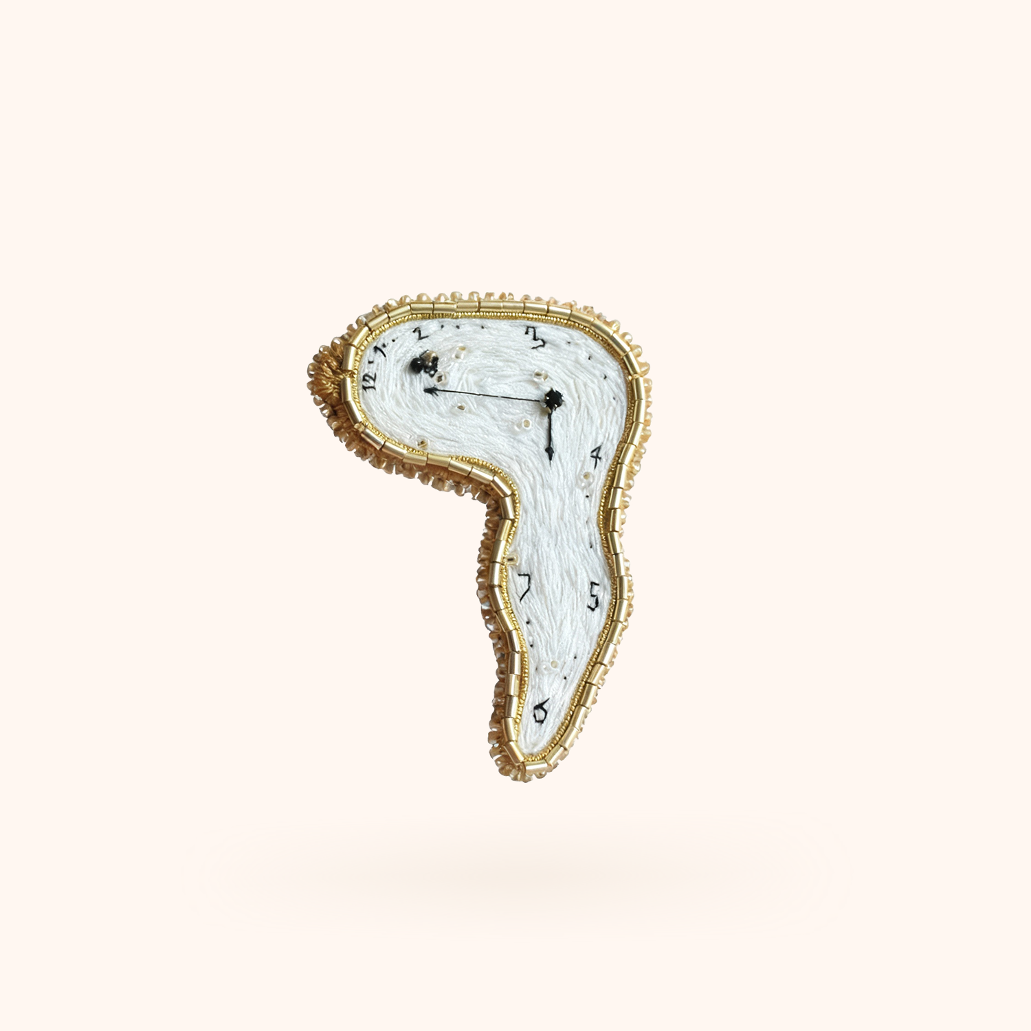 Брошь по мотивам картины Сальвадора Дали "Постоянство памяти" в виде расплавленного на солнце циферблата. Каждая брошь — это эксклюзивный аксессуар, который подчеркнет вашу индивидуальность. На её создание уходит не менее 7 часов кропотливой работы, что делает каждую вещь по-настоящему уникальной и неповторимой. Размер броши в самых выступающих местах 7 см на 5 см, крепление - булавка.