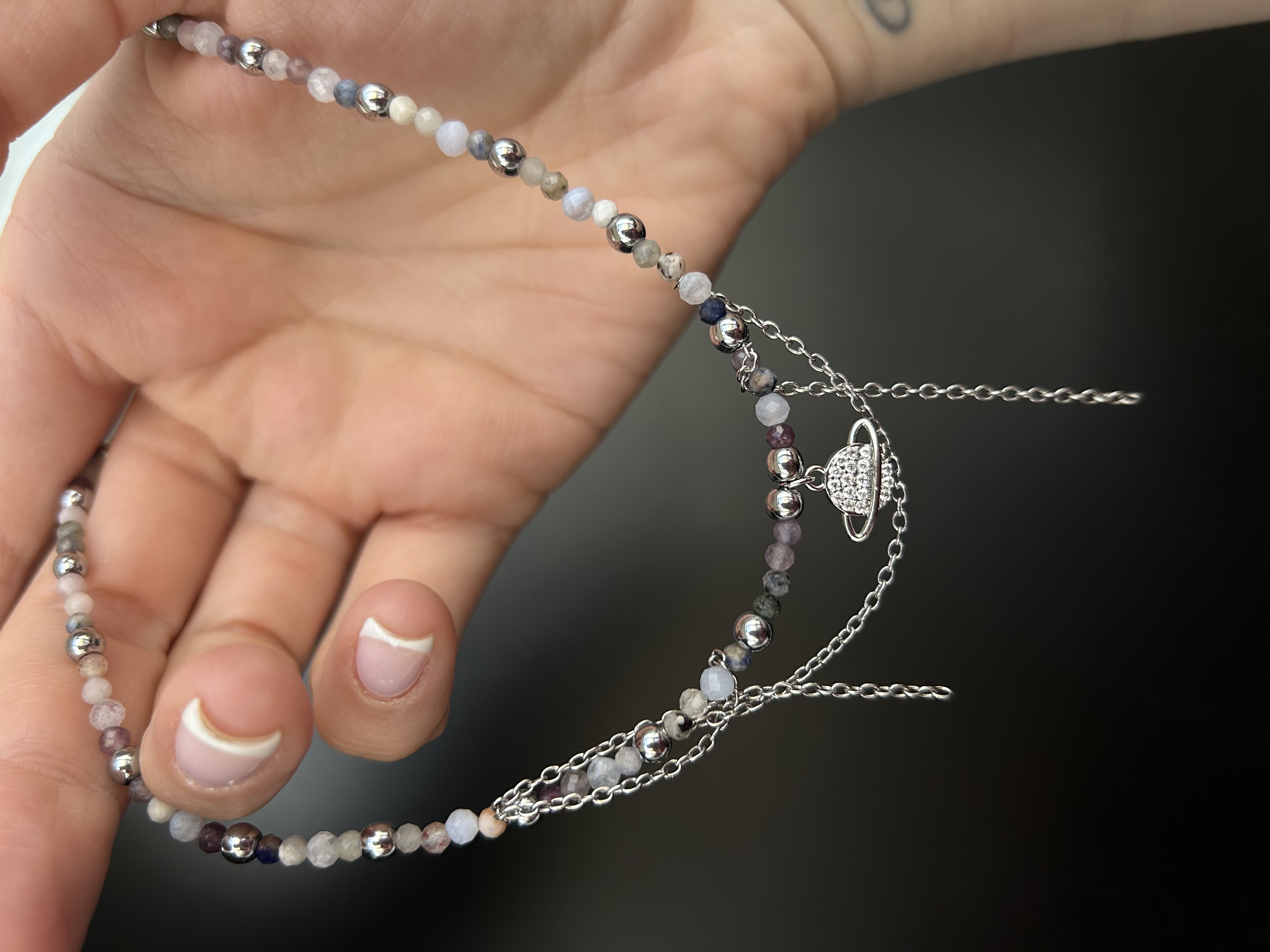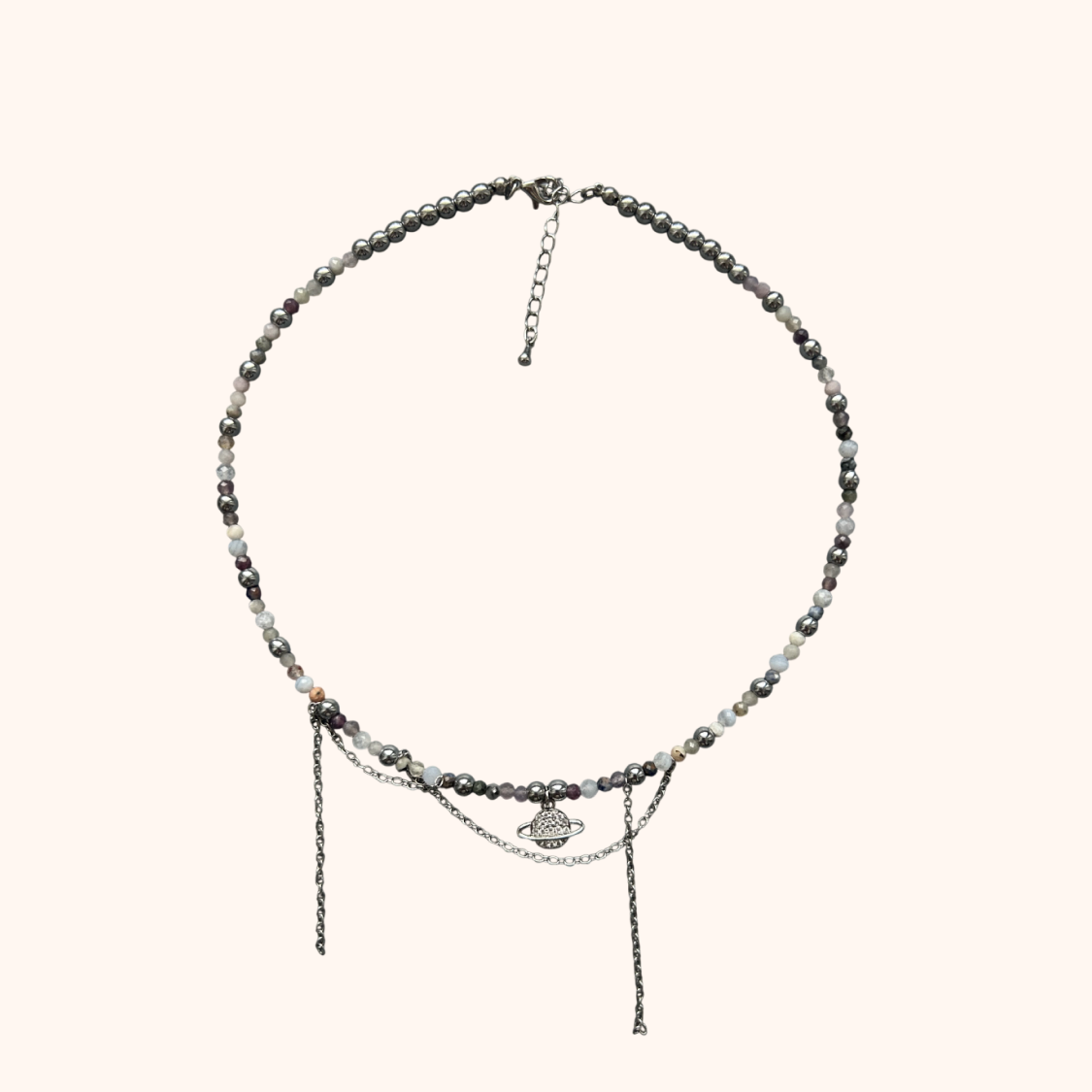 Чокер из аметиста и гематита с цепями и подвеской. В подвеске фианиты.
