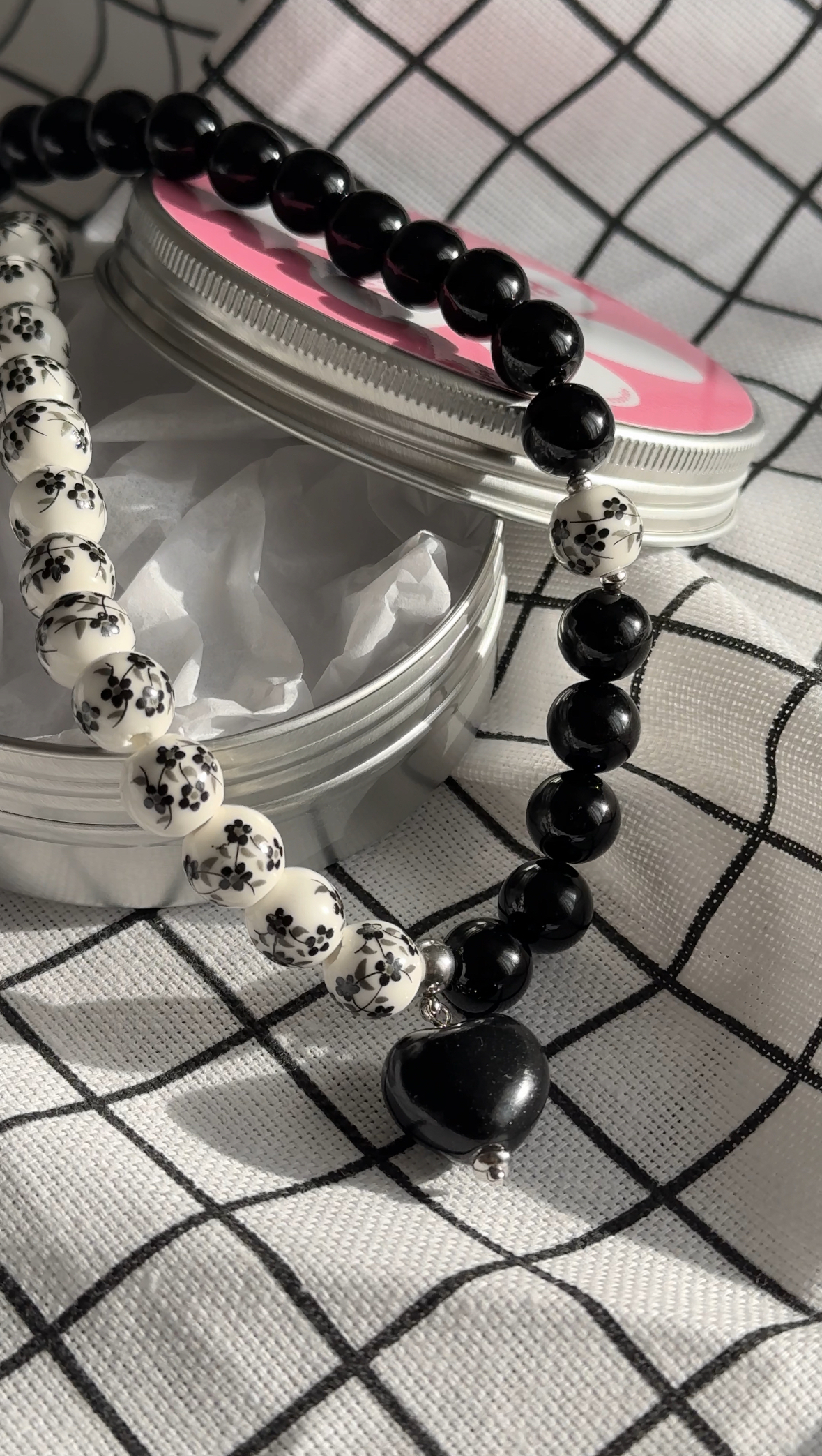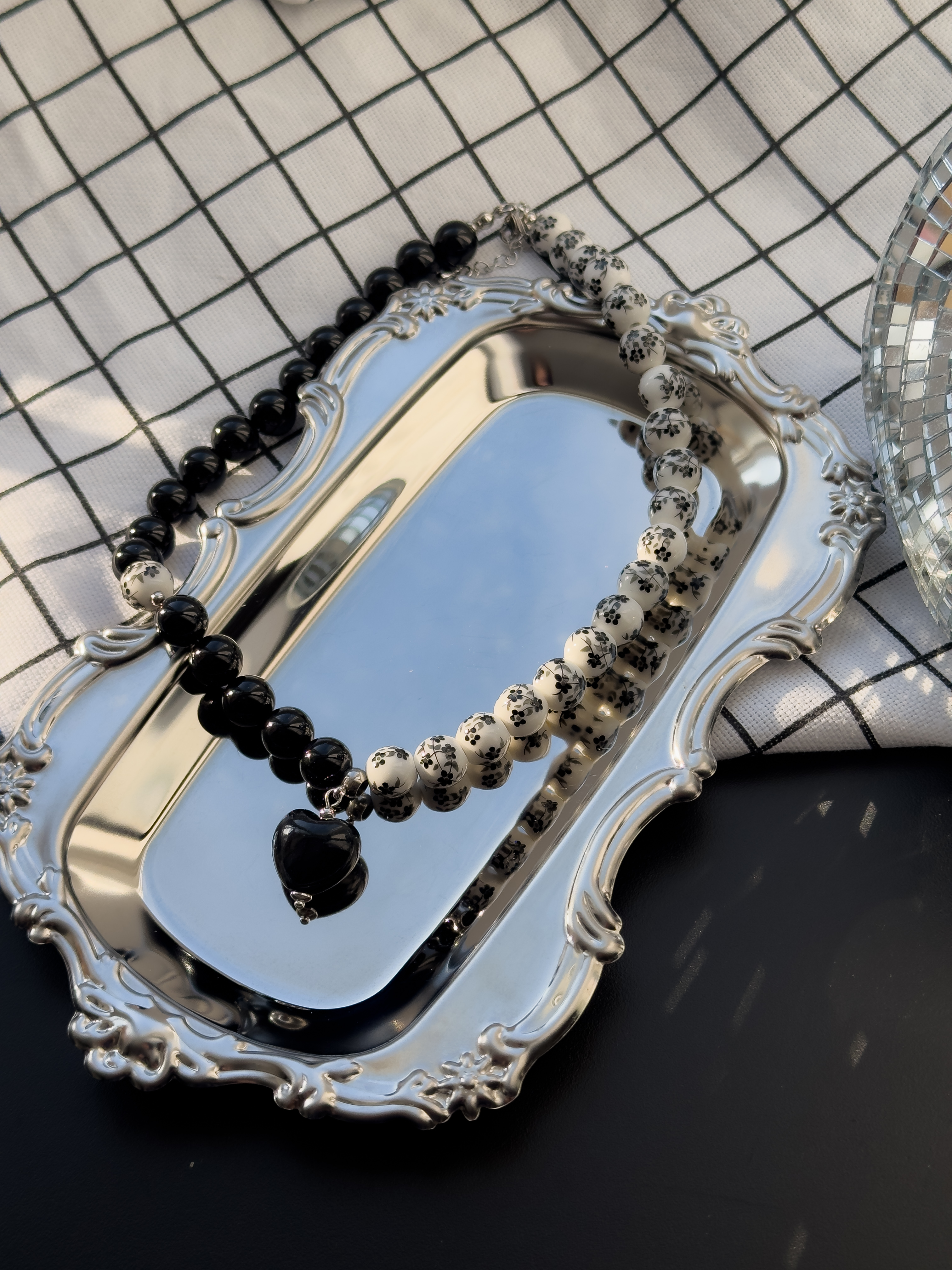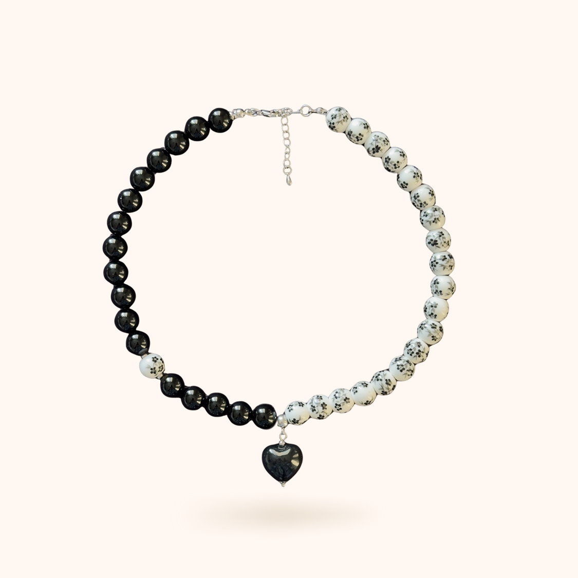 Чокер ручной работы в русском стиле из керамических бусин с росписью черного цвета в сочетании с черным агатом и керамическим сердцем.