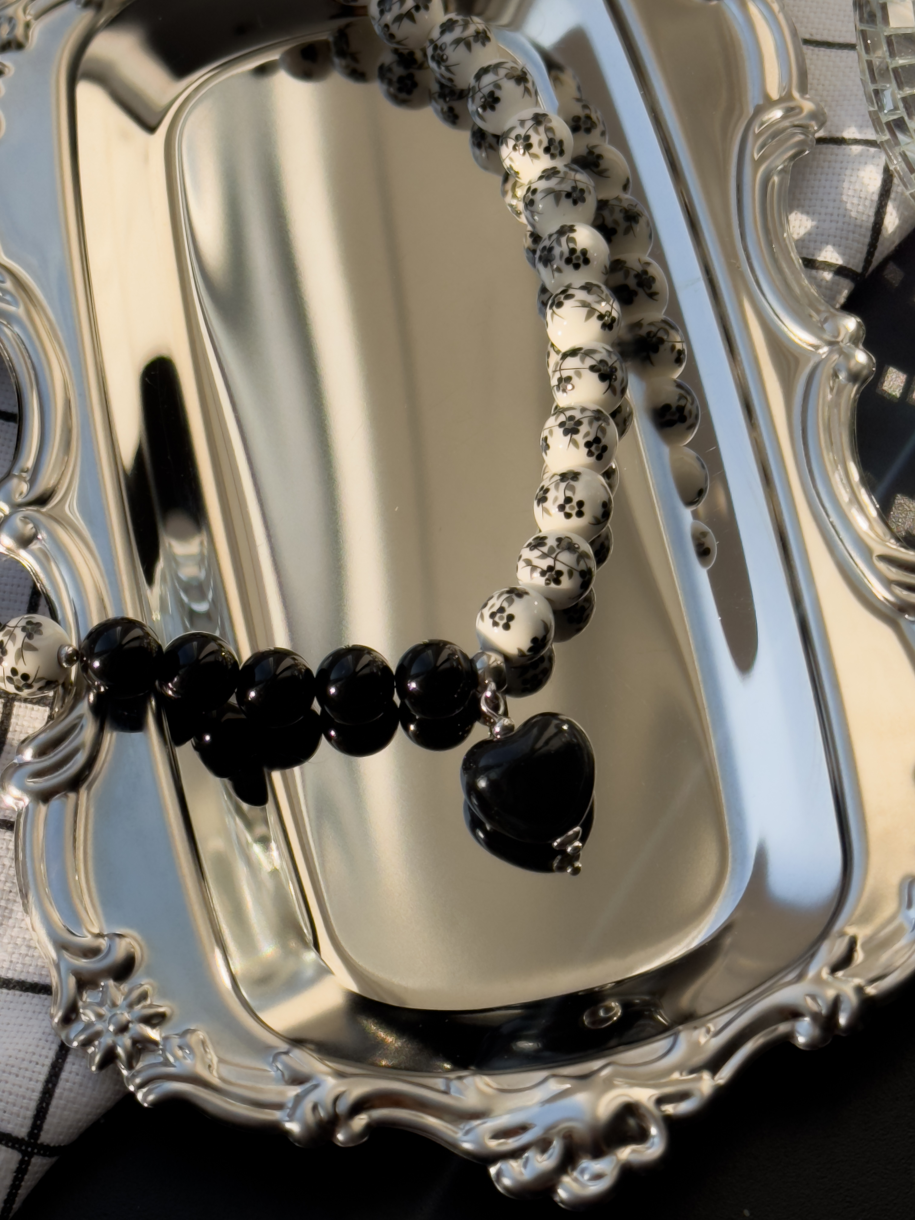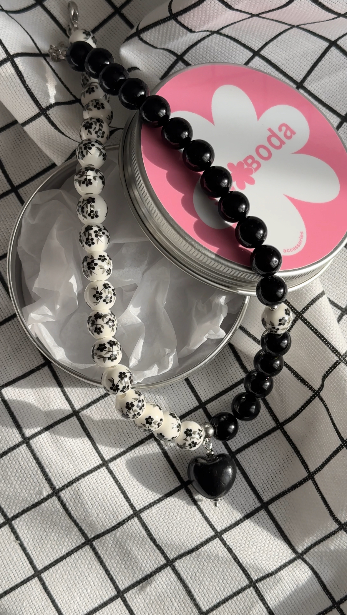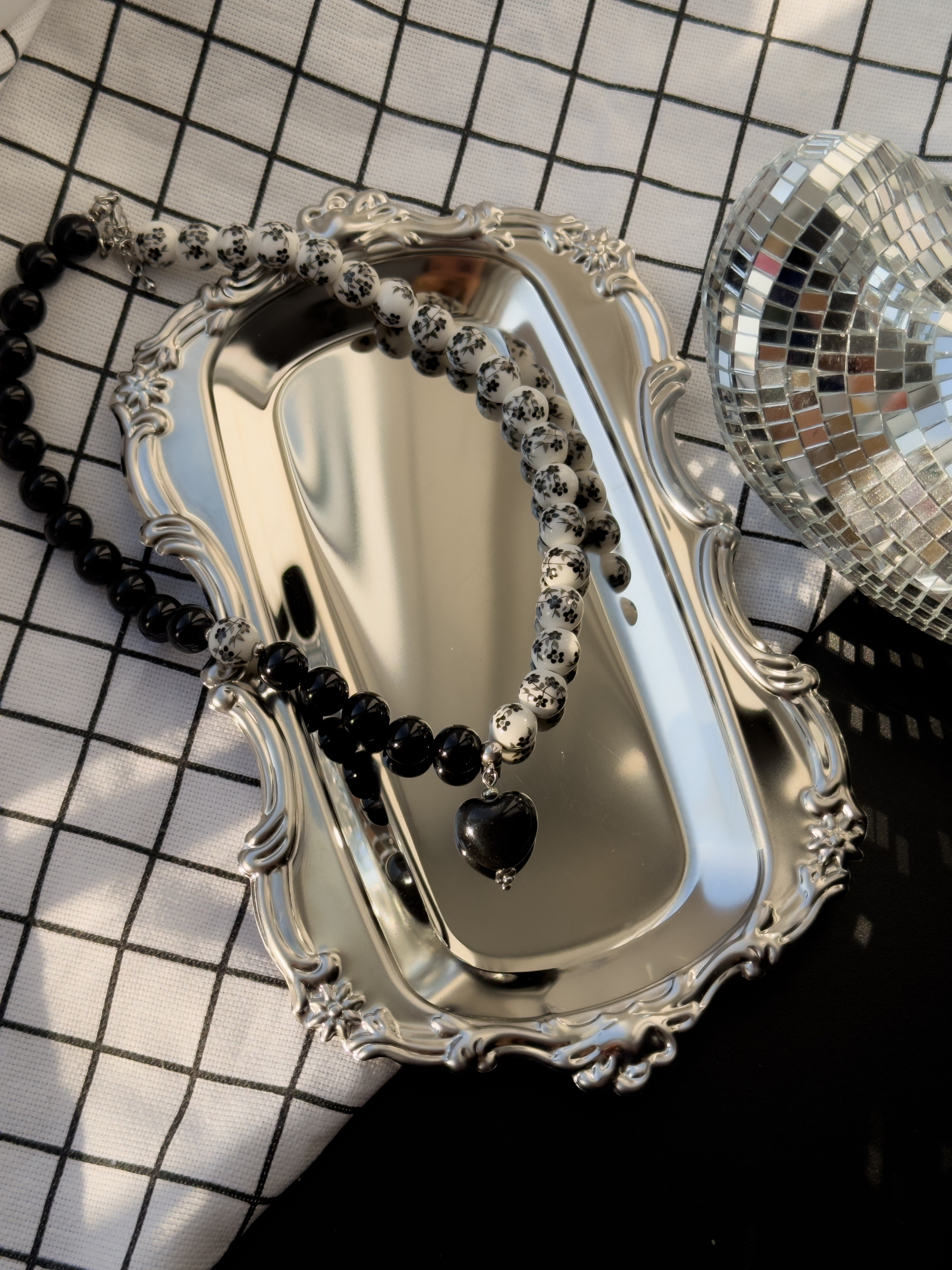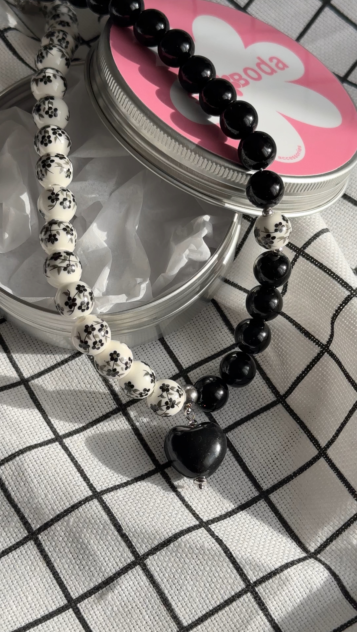 Чокер ручной работы в русском стиле из керамических бусин с росписью черного цвета в сочетании с черным агатом и керамическим сердцем.