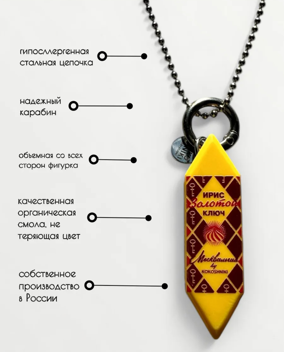 Почему именно это украшение:- Подарок со смыслом для тех, кто ценит ностальгию и стиль- Идеально вписывается в современный русский эстетический тренд- Яркий акцент в любом образе от повседневного до вечернего- Создано в России в мастерской бренда «KOKOSHNIKI»